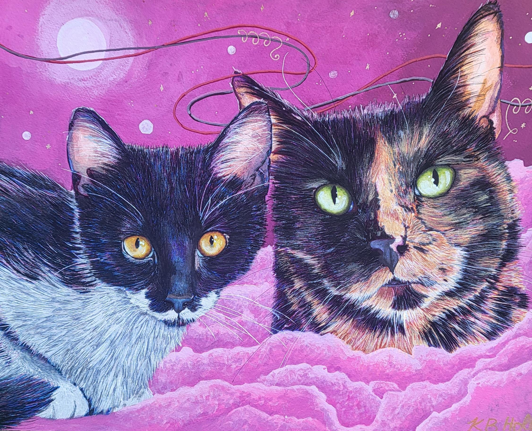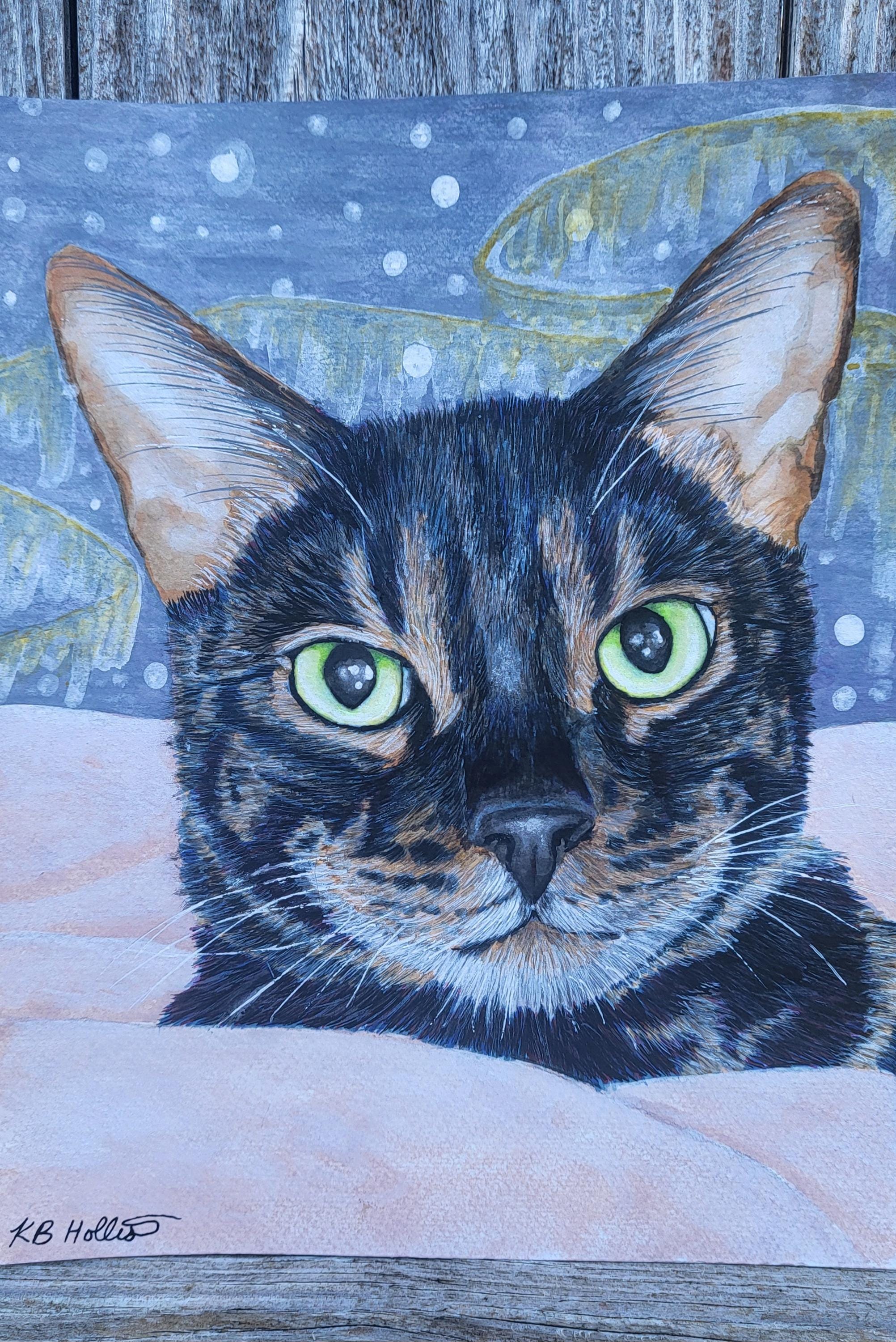 "Luluminosity" - 9x12 inch portrait featuring the beautiful meowdel Lulu in acrylic and ink under the light of an evening sky.