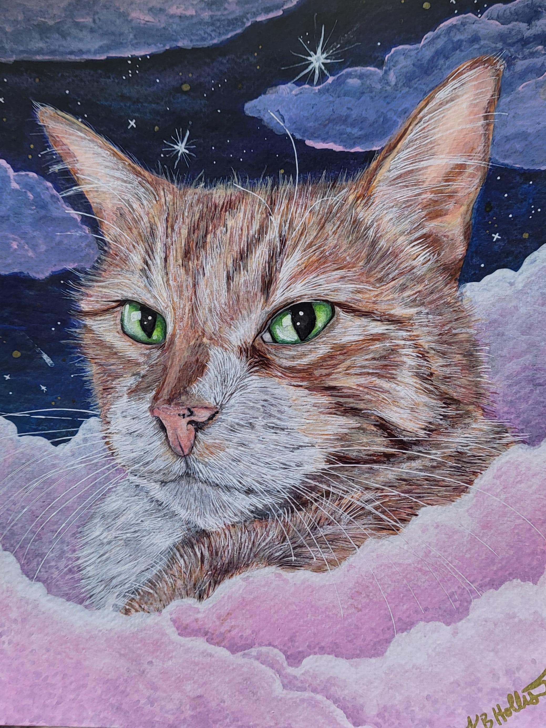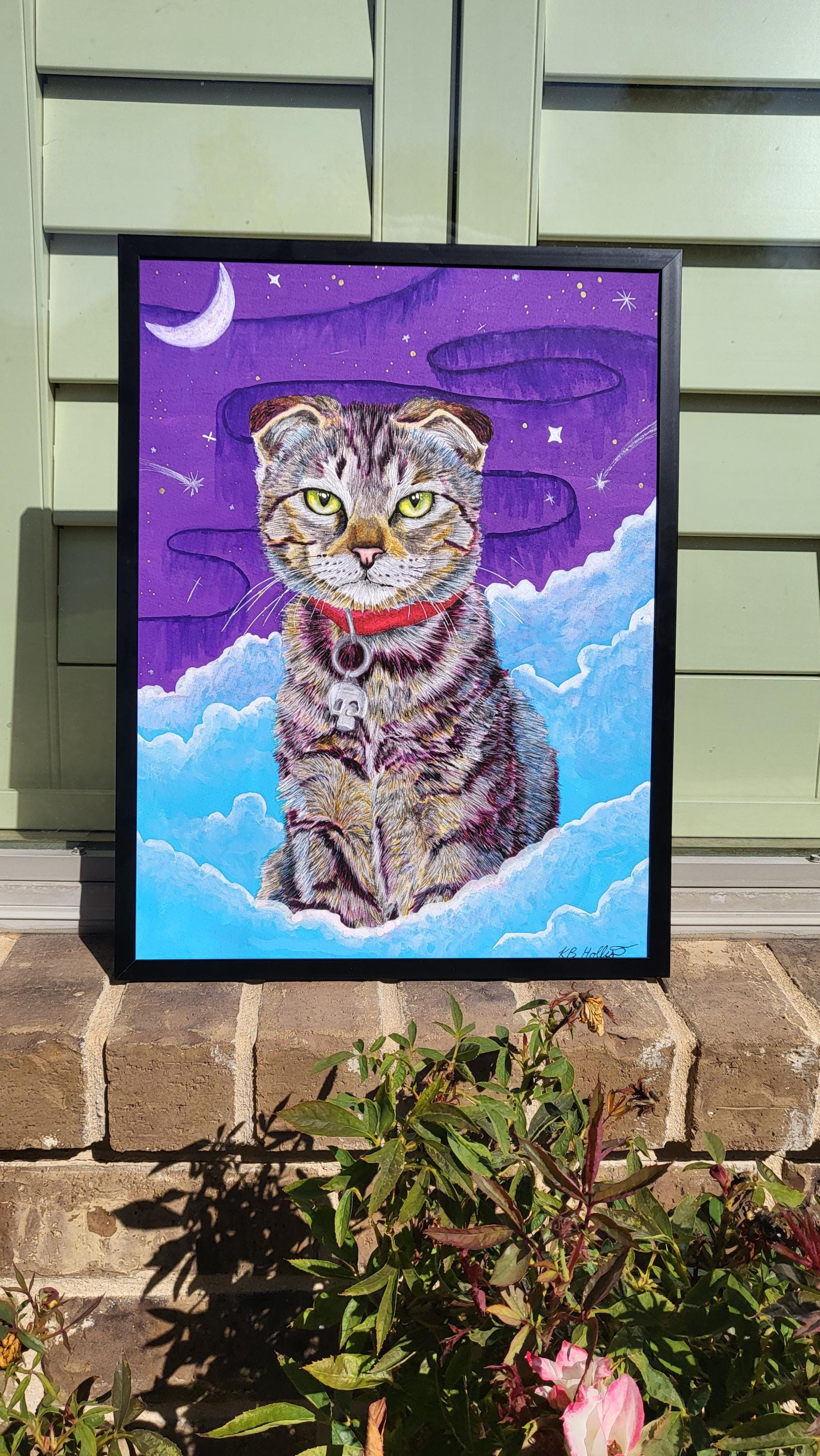 "Cathulhu in the Clouds" - 12x16 inch mixed media portrait featuring the handsome meowdel Cathulhu resting his head in the Rainbow Lands