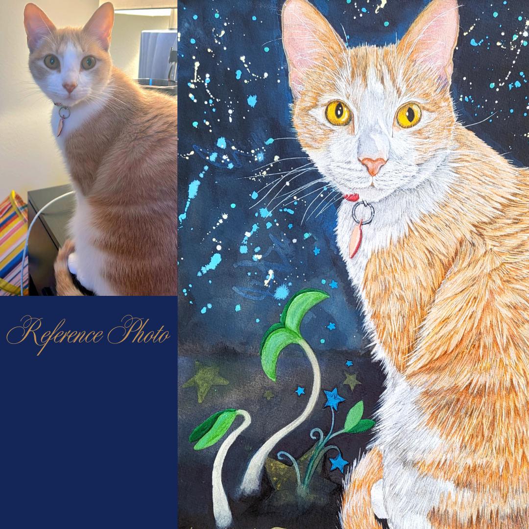 All portraits are created on archival-quality watercolor paper with acrylic paint, alcohol marker, colored pencil, and ink. Portraits can be created in 9x12, 12x16, or 18x24 inch sizes and can include a special background/features if requested. Turnaround time from photo receipt and finalization of any detail requests to completion of your portrait is 2 weeks unless otherwise stated. This listing is for individual or two-pet portraits only, but I can do portraits that include multiple pets and multiple types of pets within the same painting! If you have any questions about a multiple-pet portrait or if I can include/paint a special request, please feel free to message me at any time. All portraits are created completely by hand from photo references provided by the customer. I do not use any form of digital artwork or AI in the creation of these pieces.
