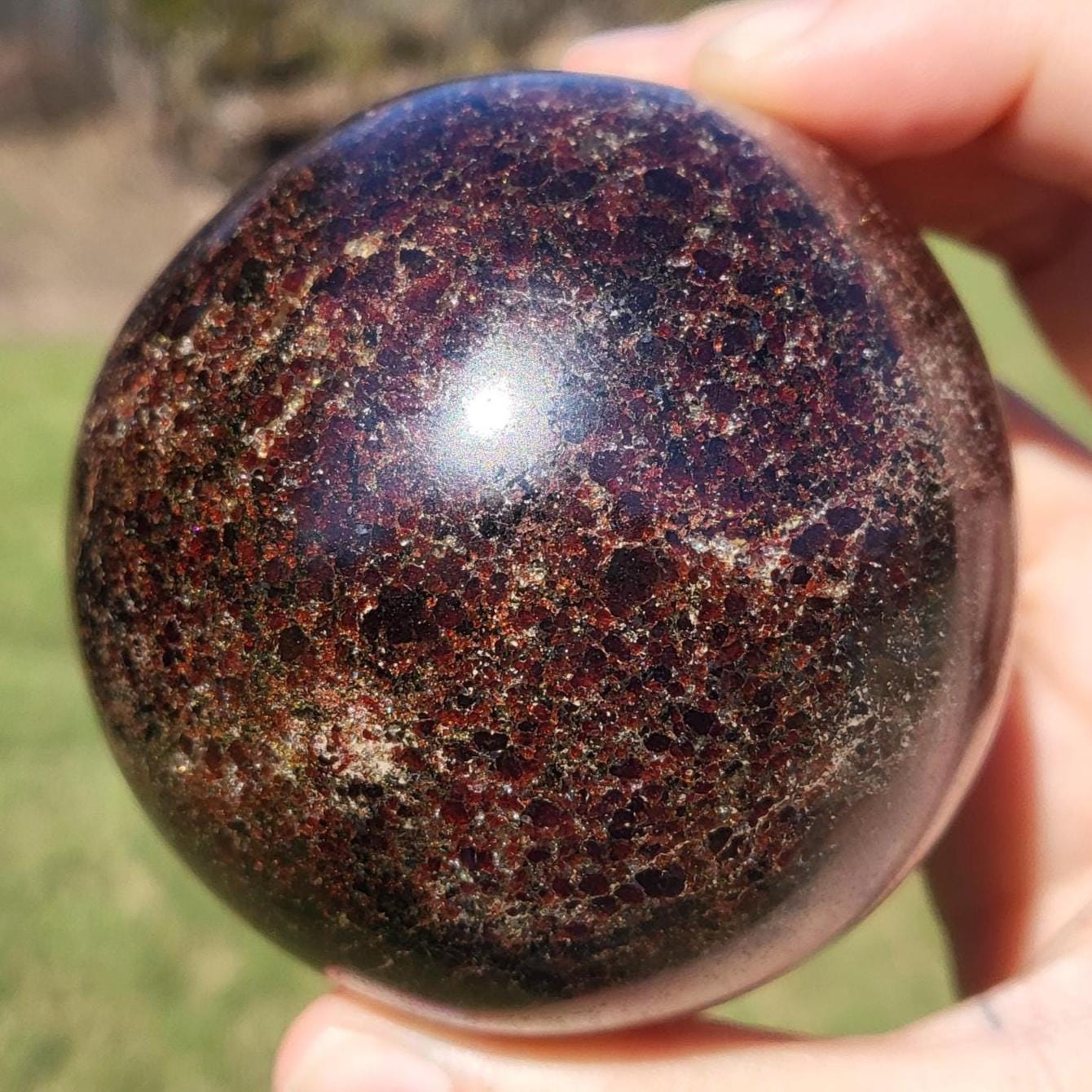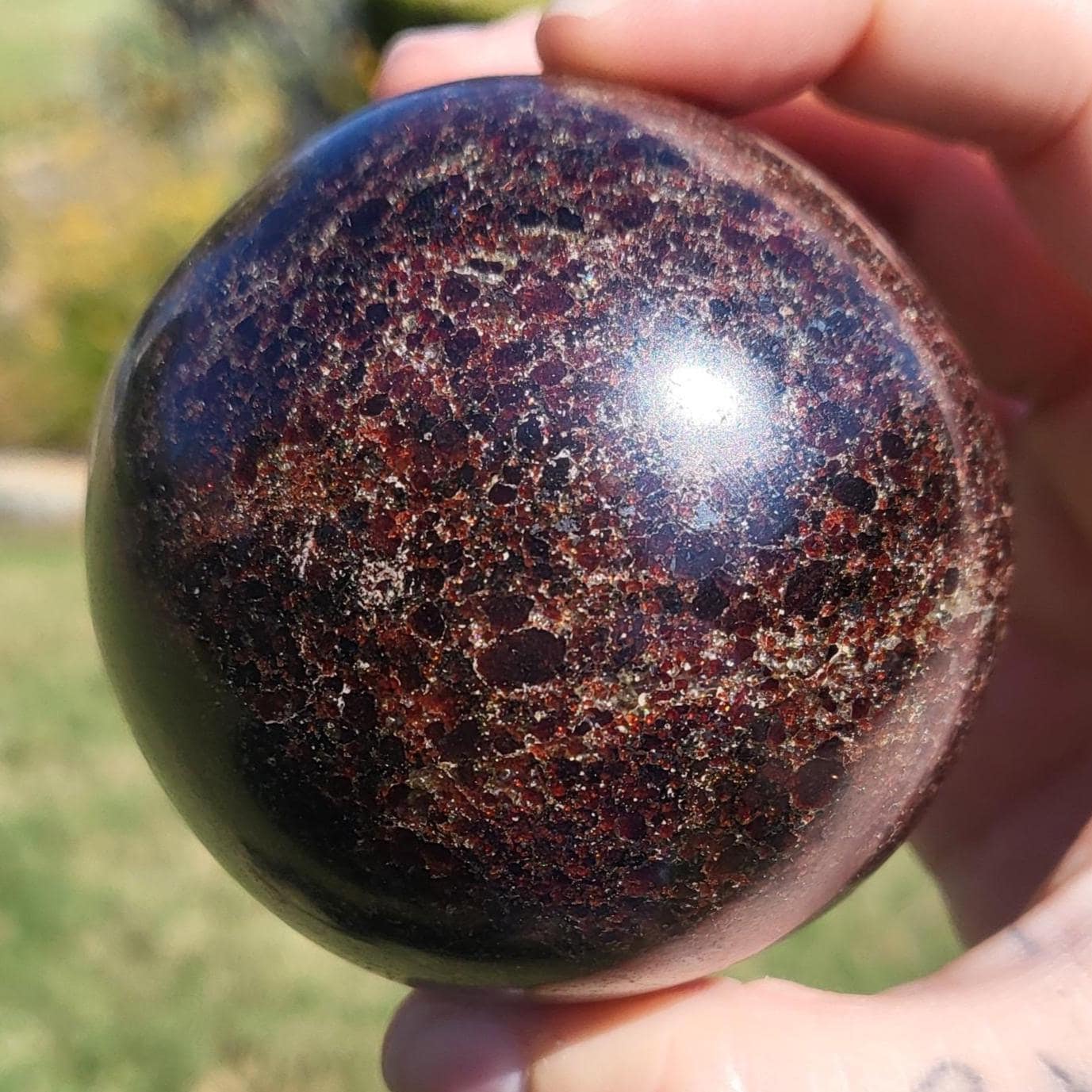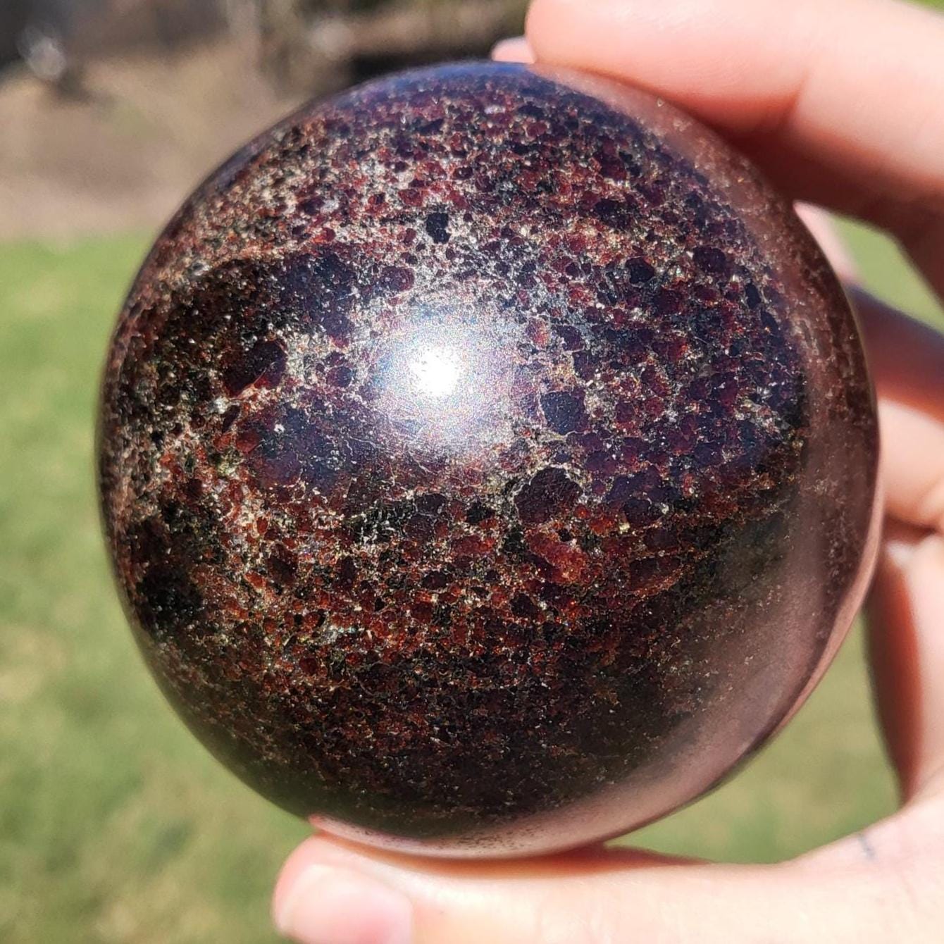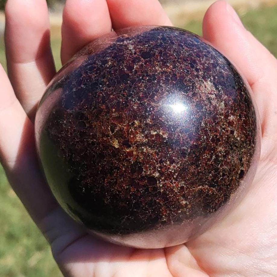 This listing is for the incredible and huge polished garnet crystal sphere shown in the photos above. She measures approximately 3" in diameter and weighs a heavy 1.5 pounds! This crystal has so many gemmy spots of deep, vibrant red, 100% natural, and made by Mama Earth. This sphere is made of a rare type of garnet called Pyrope Garnet. The word Pyrope derives from a Greek word "pyropes", which means fiery-eyed, referencing this crystal's fiery red hue. This type of garnet is relatively rare and quite special. In low light, this sphere looks almost black, but she lights up with little spots of red fire in the sun! The energy that I get from this crystal is powerfully creative, joyful, magical, and enchanting - she reminds me of the magic of the goddess Brigid's sacred flame. This is one of the most beautiful and sizeable garnets that I have ever seen.