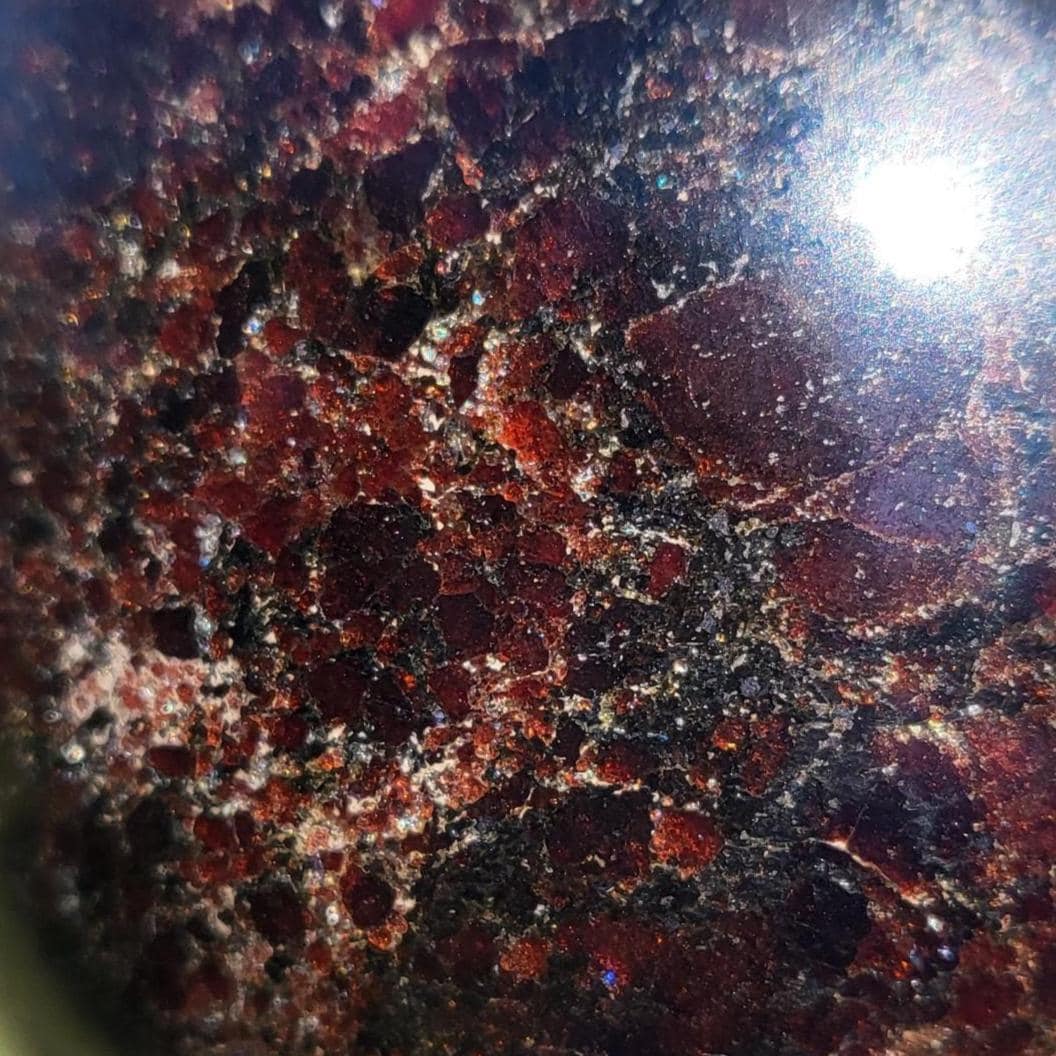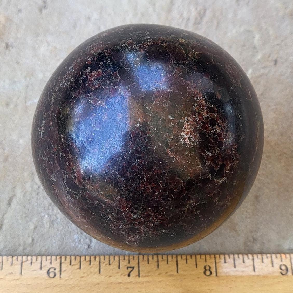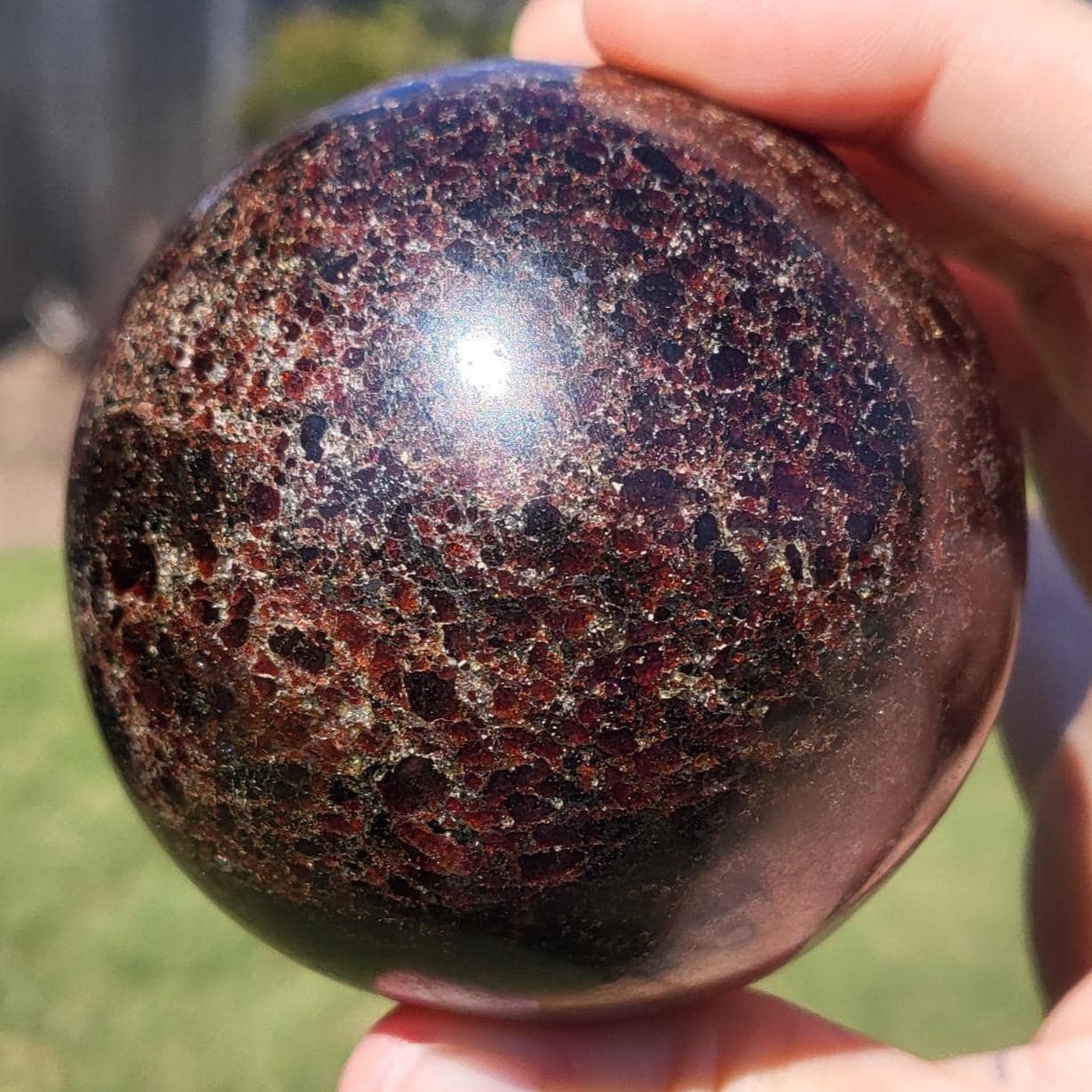 This listing is for the incredible and huge polished garnet crystal sphere shown in the photos above. She measures approximately 3" in diameter and weighs a heavy 1.5 pounds! This crystal has so many gemmy spots of deep, vibrant red, 100% natural, and made by Mama Earth. This sphere is made of a rare type of garnet called Pyrope Garnet. The word Pyrope derives from a Greek word "pyropes", which means fiery-eyed, referencing this crystal's fiery red hue. This type of garnet is relatively rare and quite special. In low light, this sphere looks almost black, but she lights up with little spots of red fire in the sun! The energy that I get from this crystal is powerfully creative, joyful, magical, and enchanting - she reminds me of the magic of the goddess Brigid's sacred flame. This is one of the most beautiful and sizeable garnets that I have ever seen.