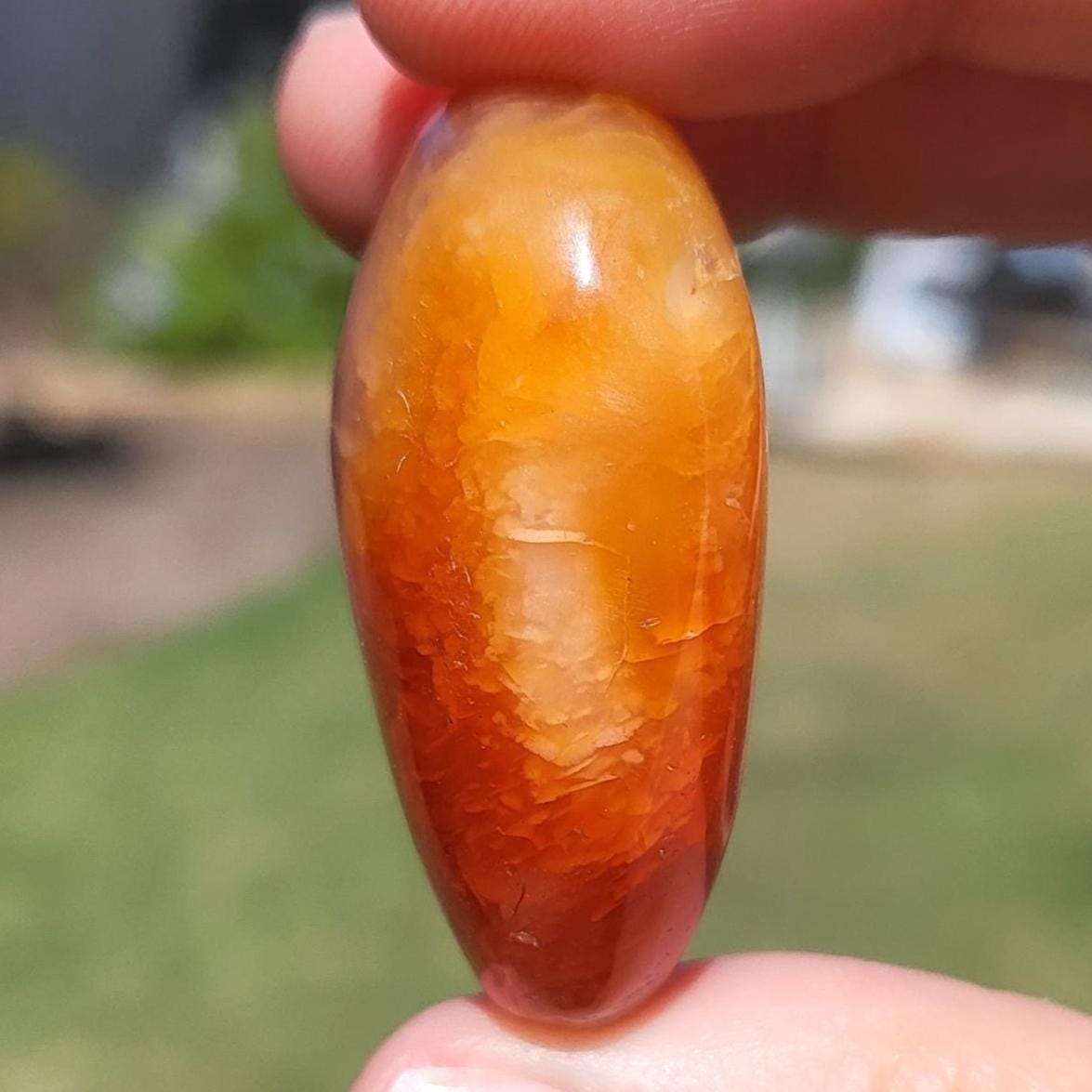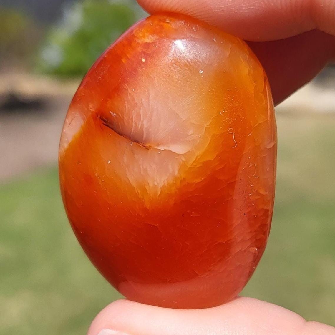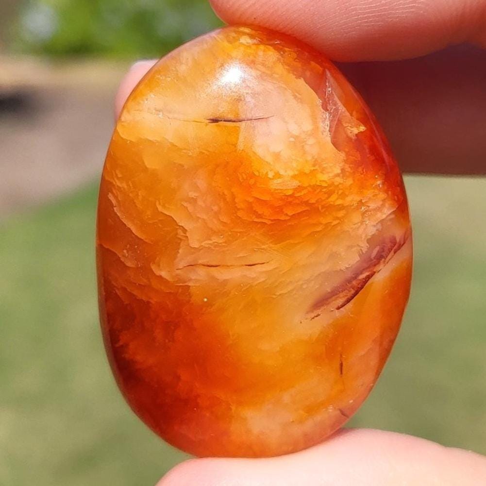 This listing is for the INCREDIBLE little carnelian crystal palm stone shown in the photos above. He measures approximately 1.5" in length and his colors and patterns are absolutely out of this world. This crystal has gorgeous swirls and lines within him - he looks like he has crystal clouds inside in the sunlight. He is 100% natural and made by Mama Earth. The energy that I get from this crystal is so energetic, creative and joyful. He would be excellent as a meditation or magical working companion, or placed anywhere in your home or sacred space to project his magical, abundant energy.