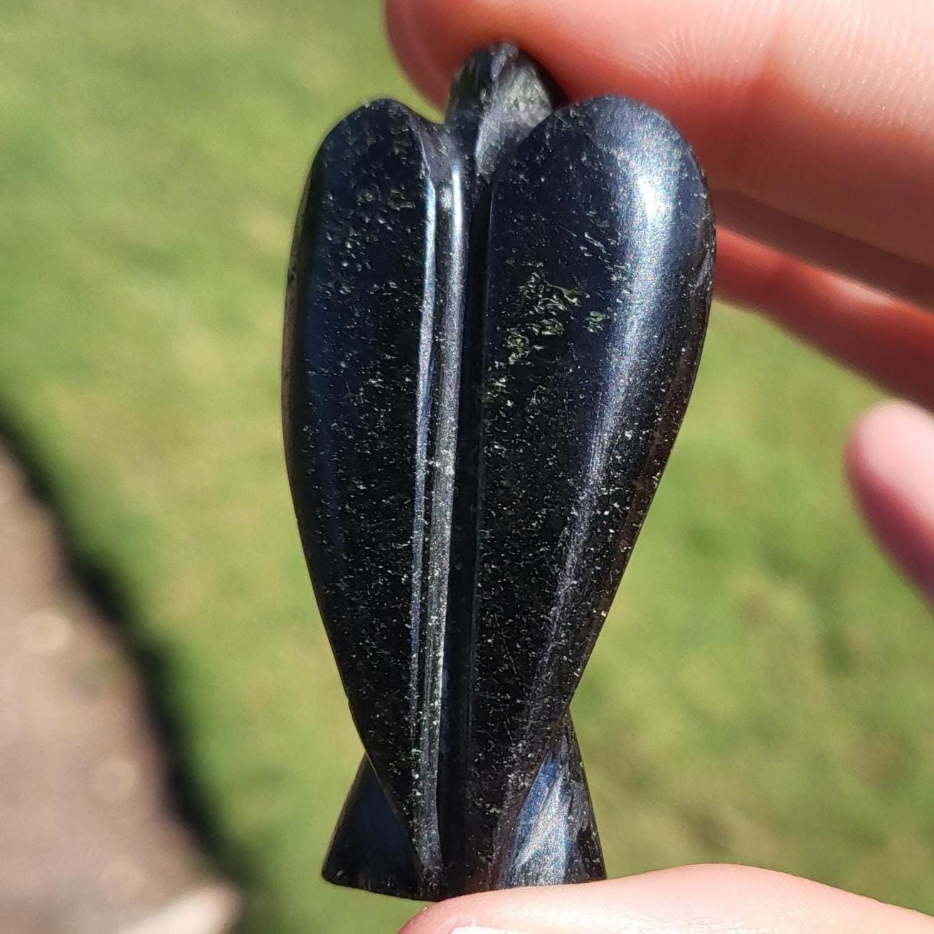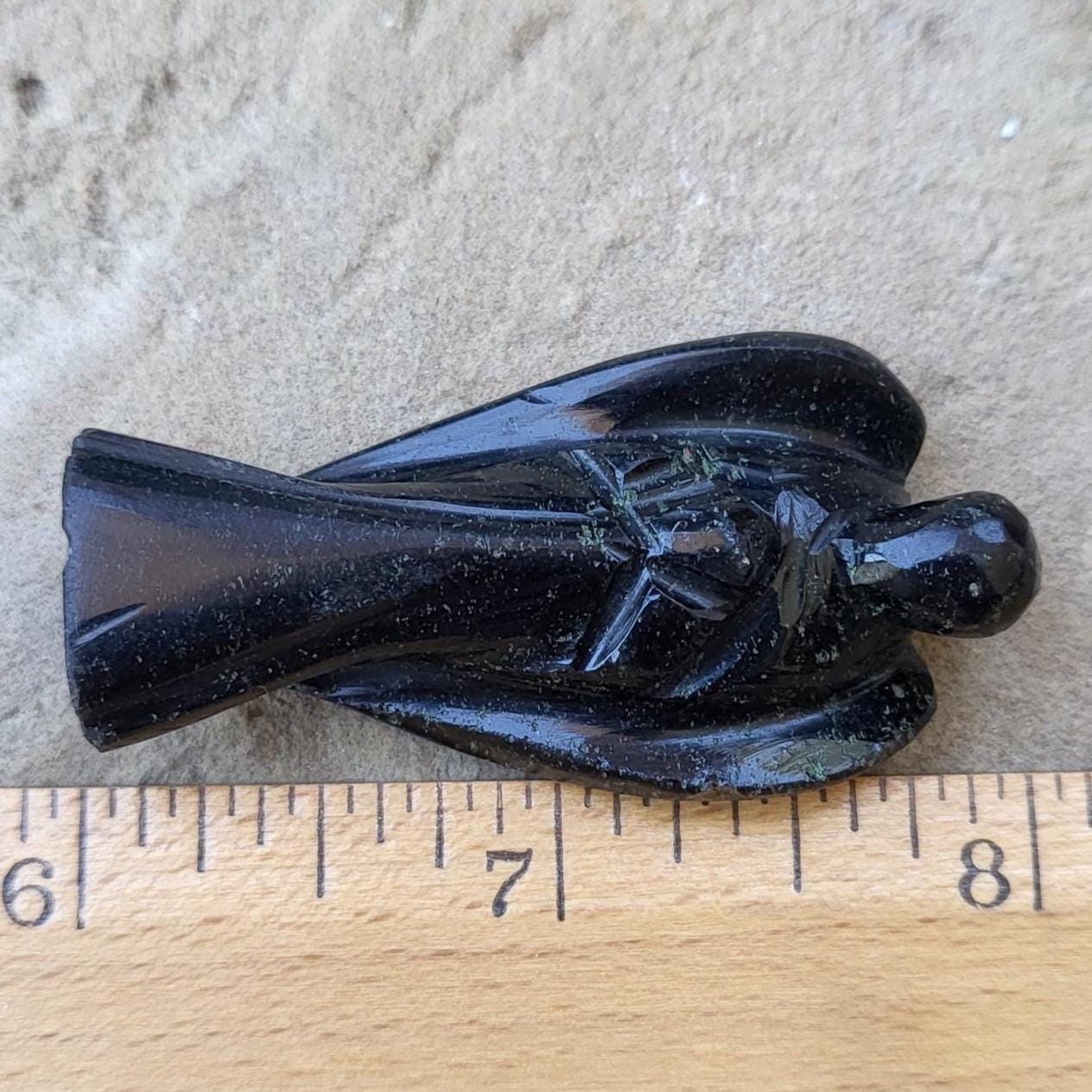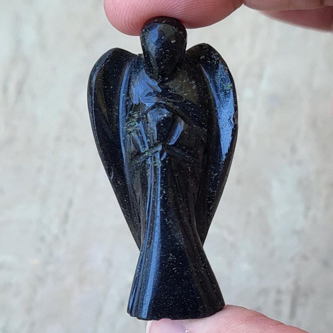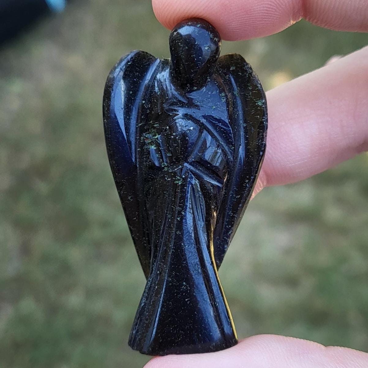 This listing is for the beautiful black and green tourmaline crystal angel shown in the photos above. Measuring approximately 2" in length, this angel is shiny black with green flecks throughout that can be seen in the sunlight. The energy that I get from this little angel is very magical and protective. She would be perfect as a crystal companion for meditation, divination, spiritual or magical workings, or placed on an altar or sacred space to project her powerful energy.