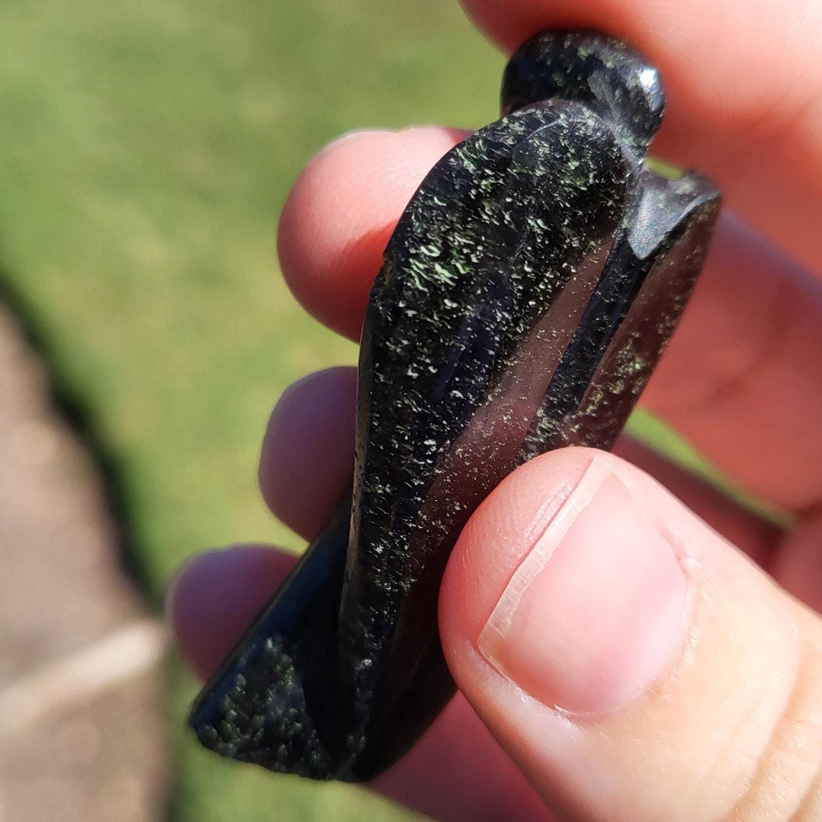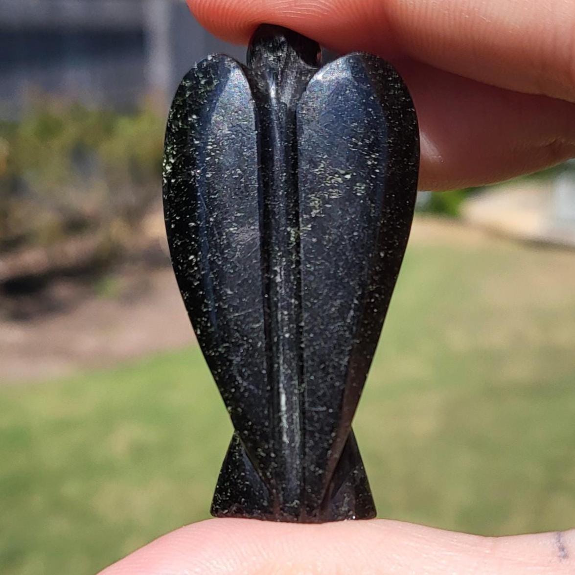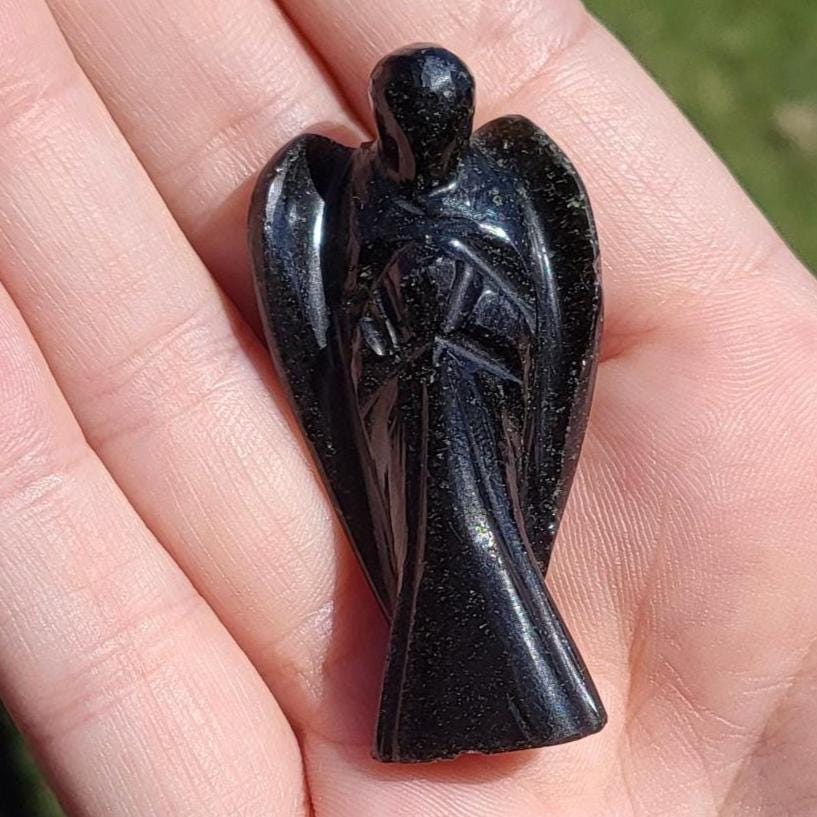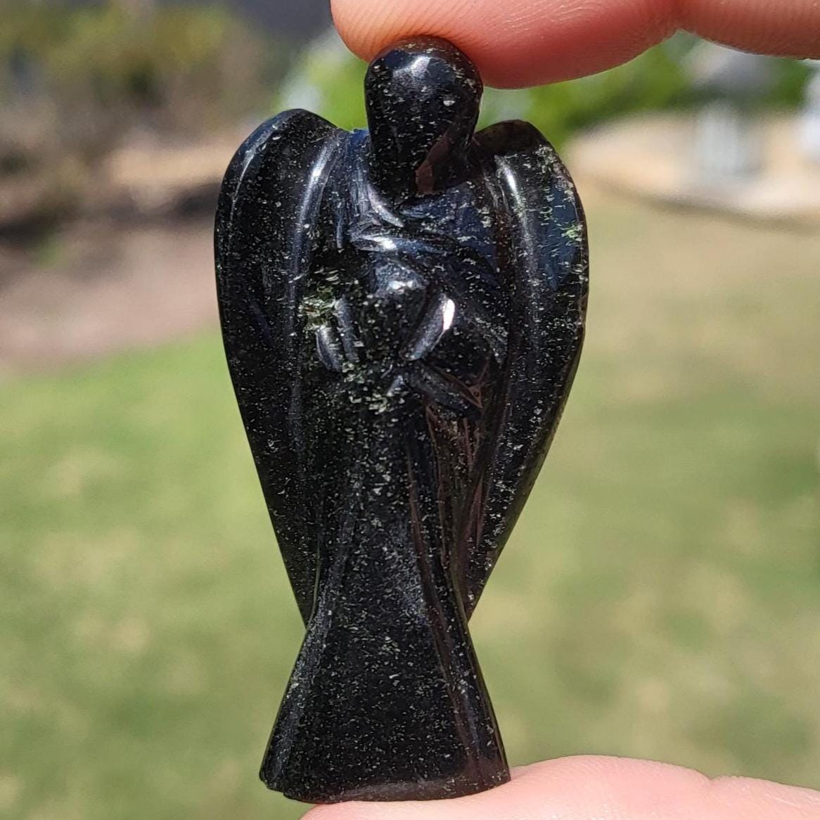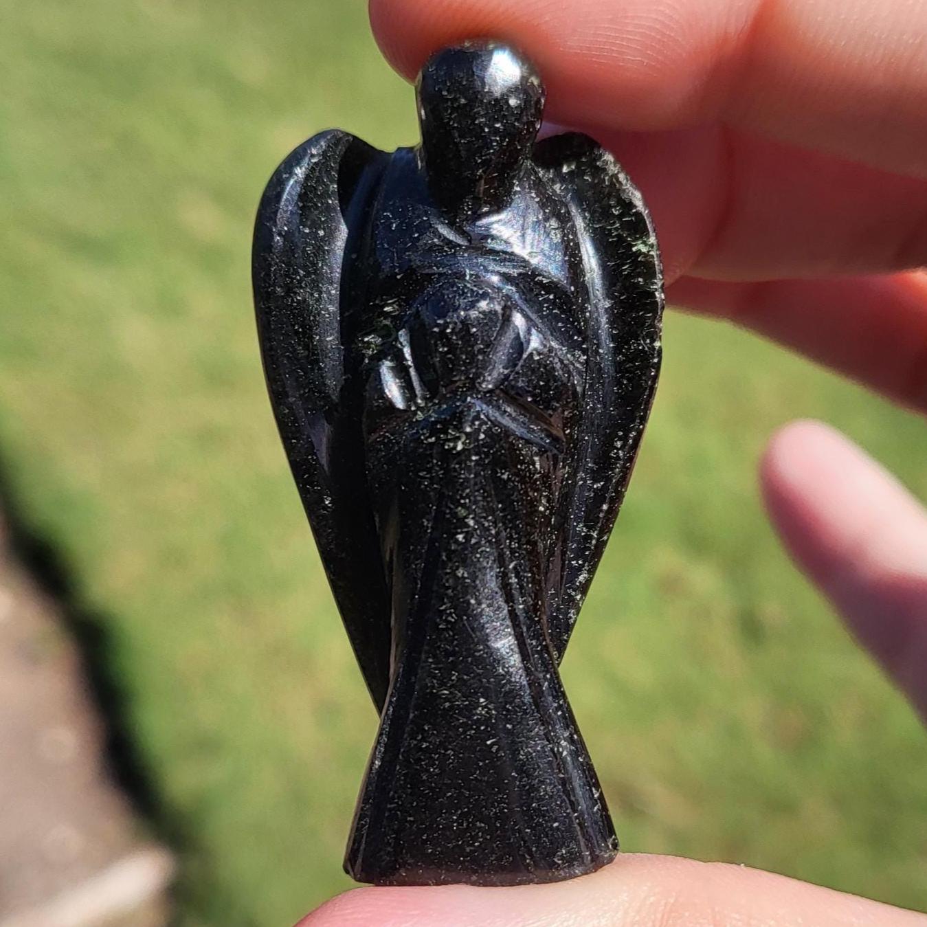 This listing is for the beautiful black and green tourmaline crystal angel shown in the photos above. Measuring approximately 2" in length, this angel is shiny black with green flecks throughout that can be seen in the sunlight. The energy that I get from this little angel is very magical and protective. She would be perfect as a crystal companion for meditation, divination, spiritual or magical workings, or placed on an altar or sacred space to project her powerful energy.