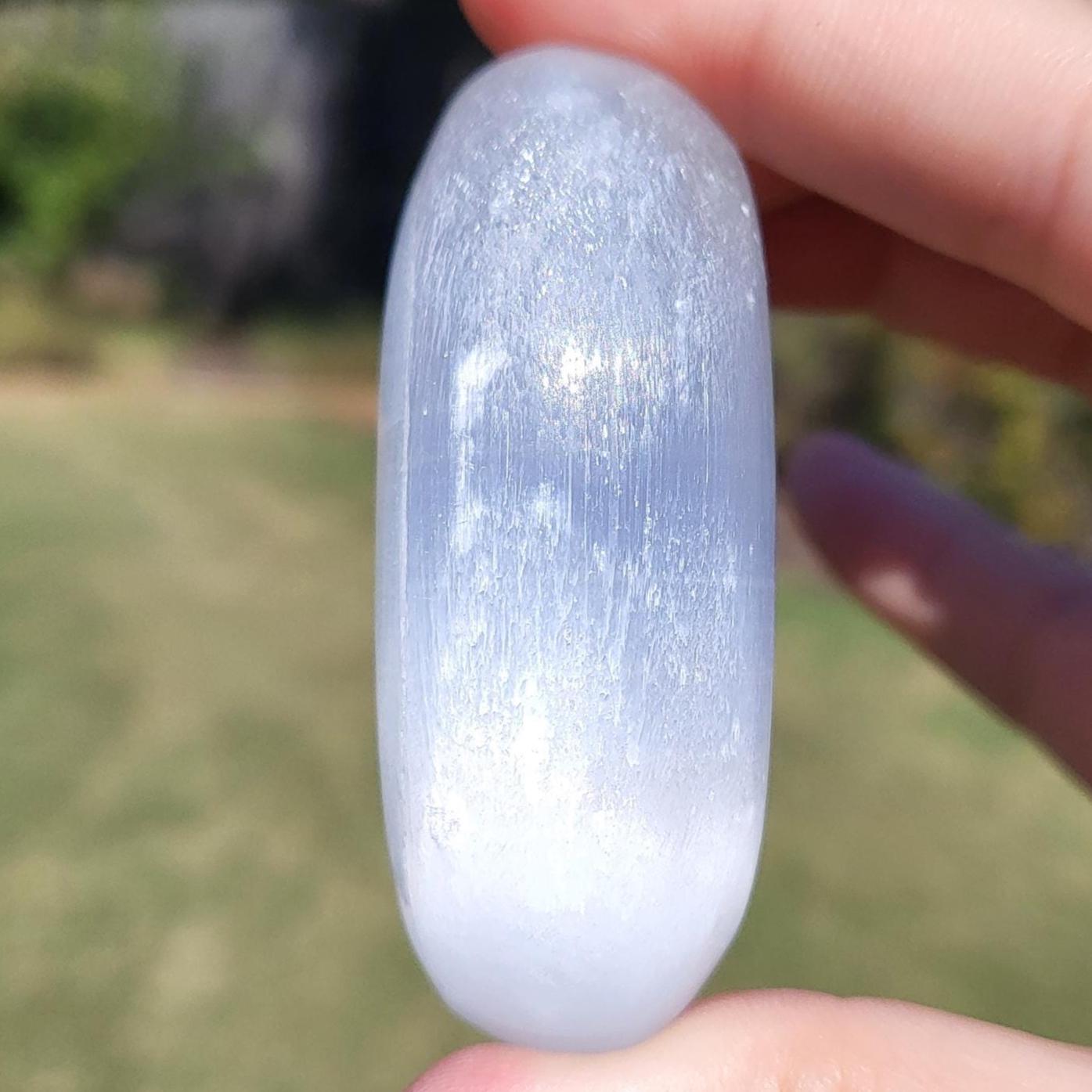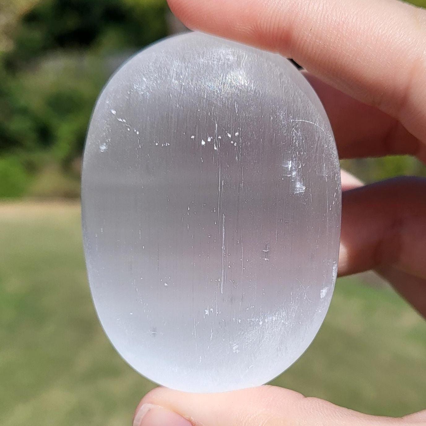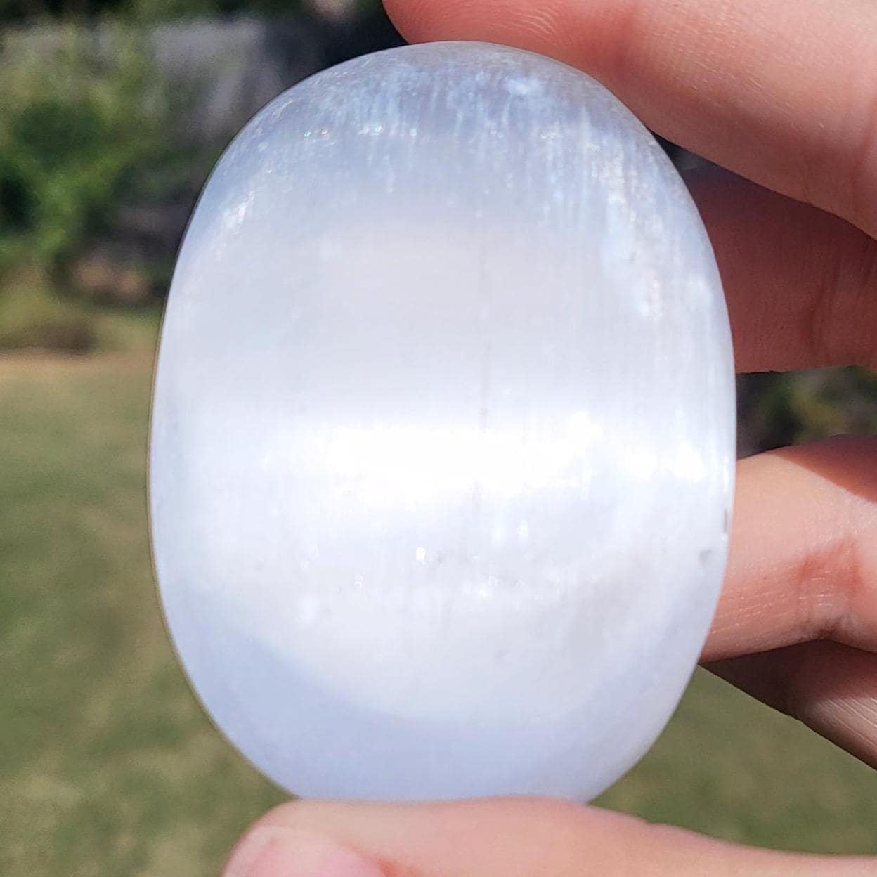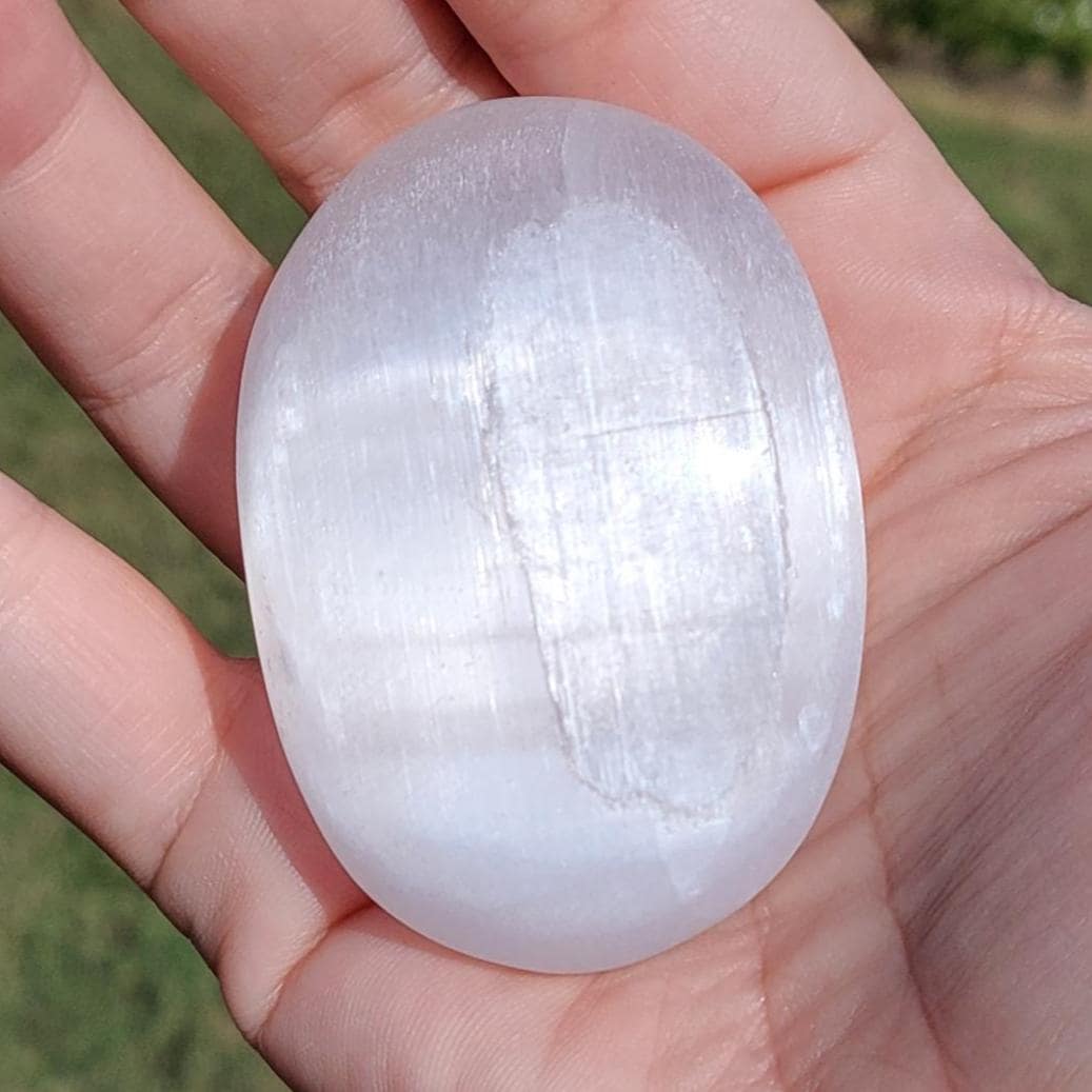 This listing is for the shiny, glowing selenite polished palm stone shown in the photos above. Measuring approximately 2.5" in length, the shine off of this palm stone is absolutely incredible in the sunlight. Pictures don't do her justice so I have included a video to help better capture her shine. The energy that I get from this crystal feels very magical, happy, and transformative. She would be excellent as a meditation or magical working companion, as part of a crystal grid, used as a cleansing plate, or placed on an altar or sacred space to project her beautiful energy.