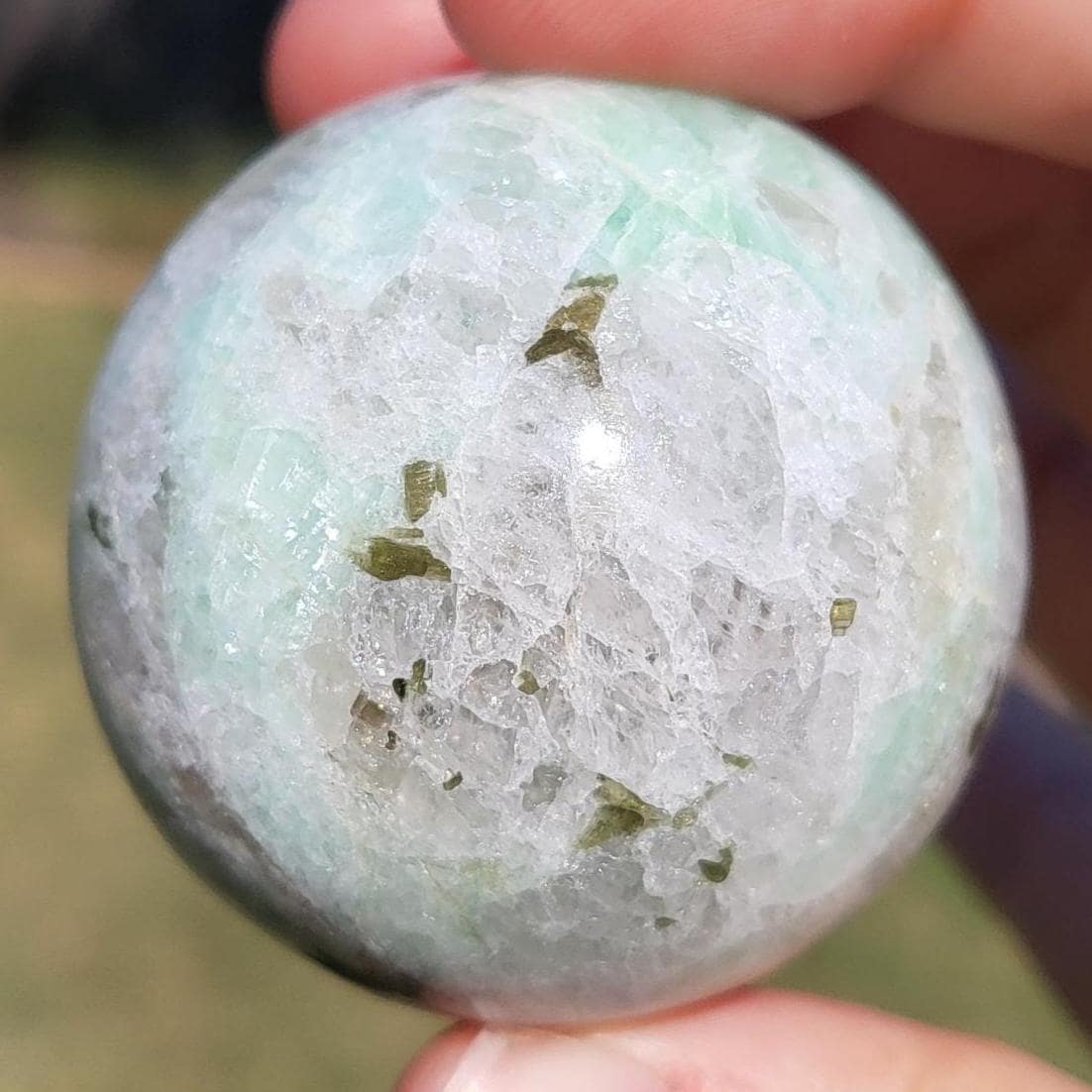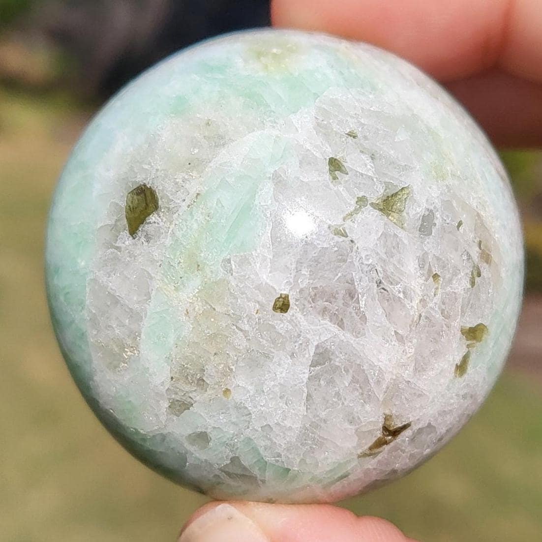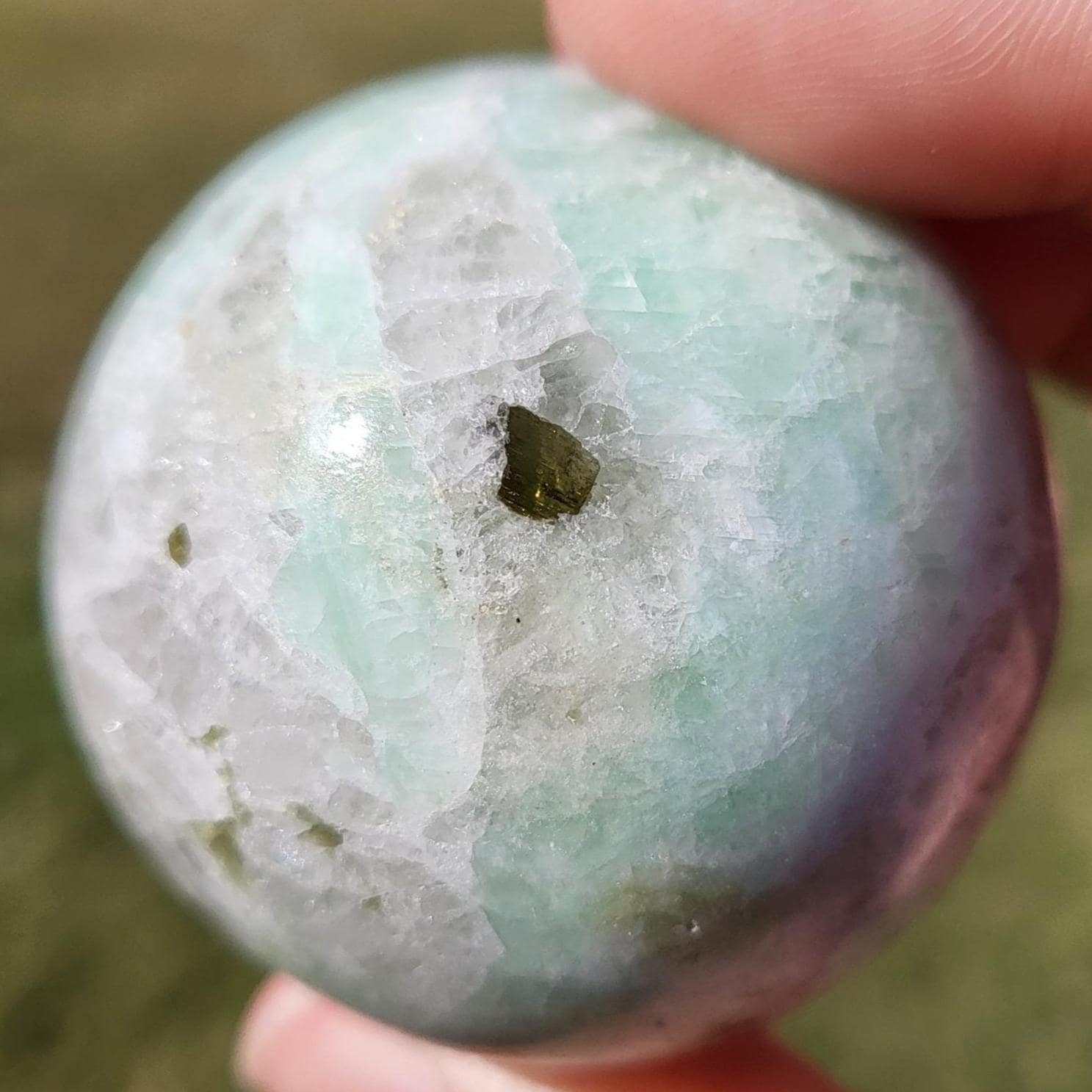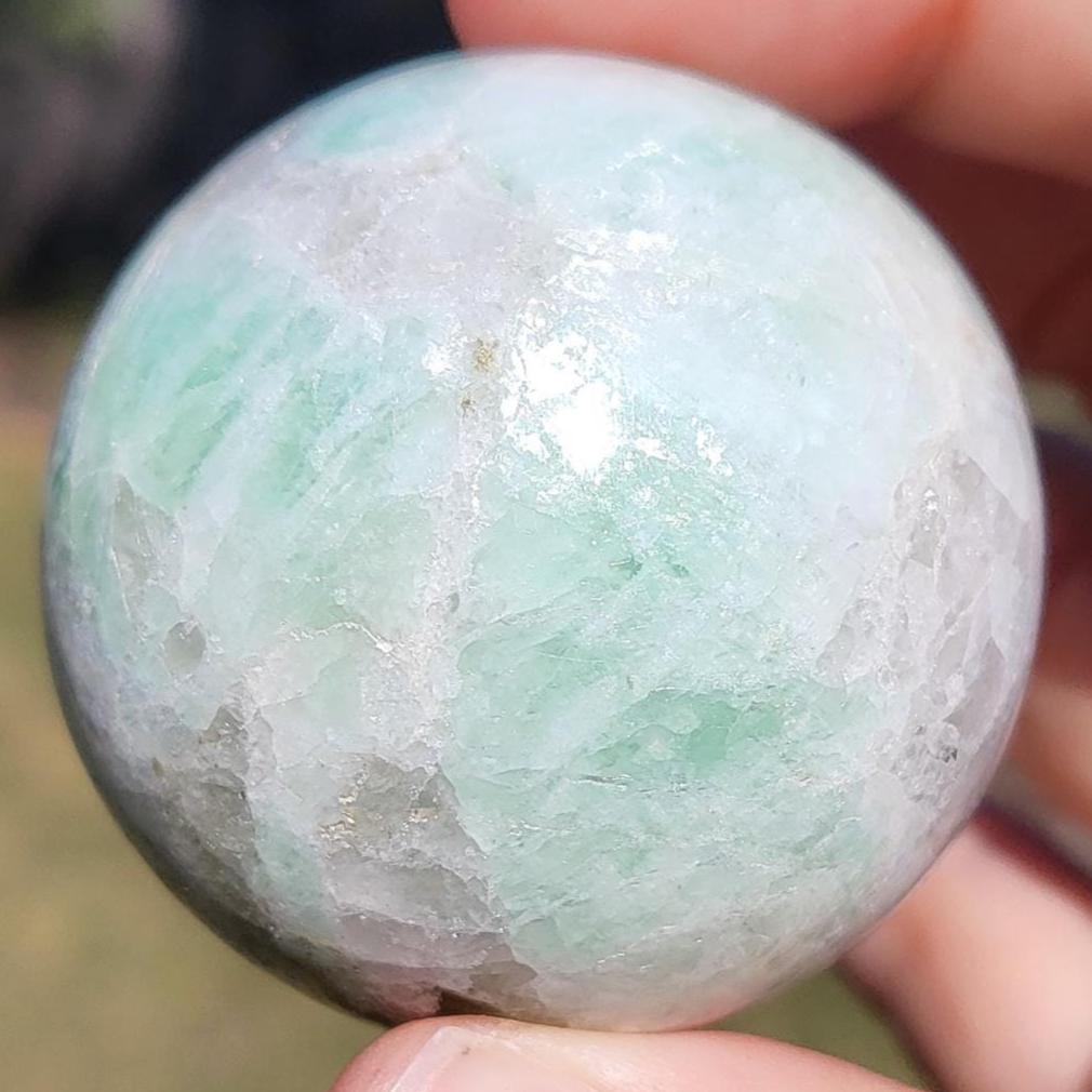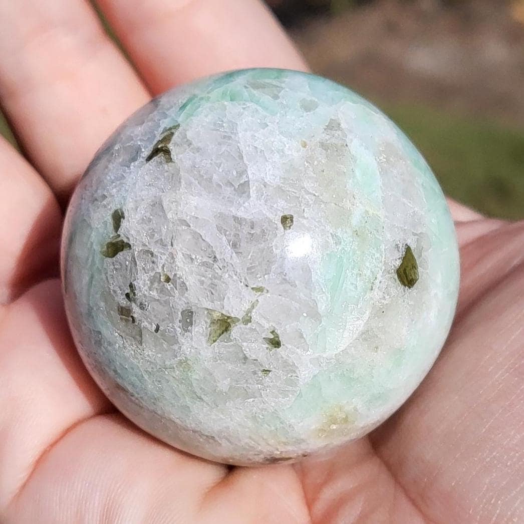 This listing is for the sparkly and GORGEOUS amazonite with green tourmaline crystal sphere shown in the photos above. The color in this crystal is a beautiful blue that glitters like crazy in the right light (shown in video). She is dotted throughout vibrant green tourmaline windows that positively glow in the sun! Measuring approximately 2" in diameter and polished to a smooth shine, the colors in this amazonite and green tourmaline sphere are 100% natural and created by Mother Earth. The energy that I get from this crystal is very prosperous, abundant, and positive. She would be perfect as a crystal companion for meditation, manifestation, and spiritual workings. She would also be excellent as part of an altar, crystal grid, or placed anywhere within your space to project her incredible energy.