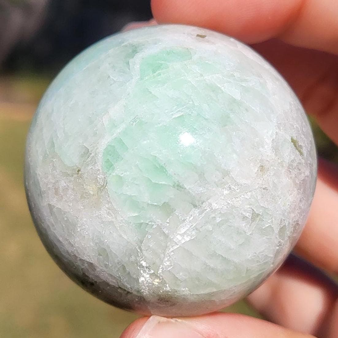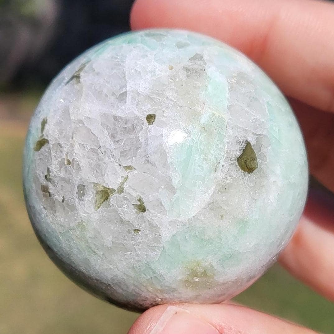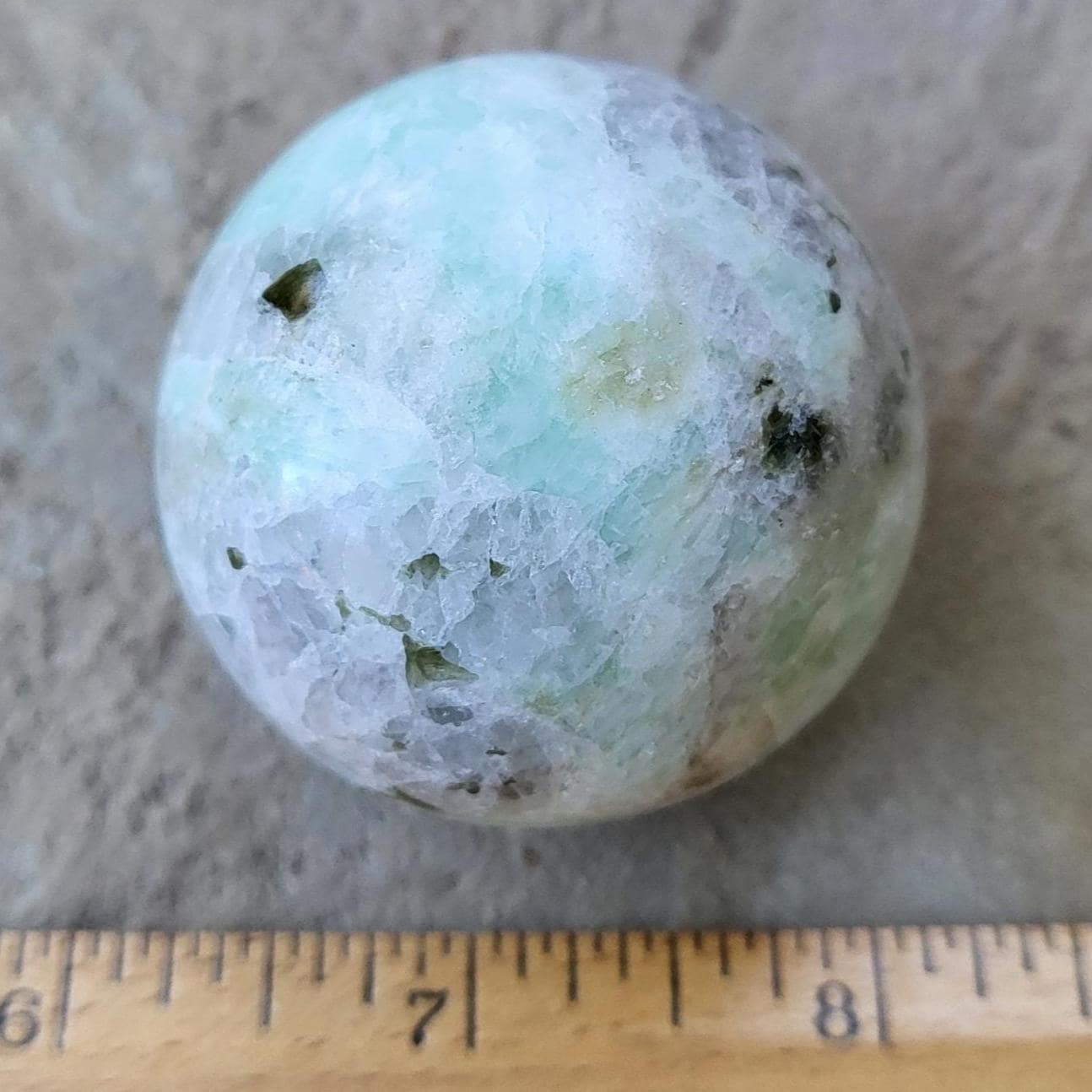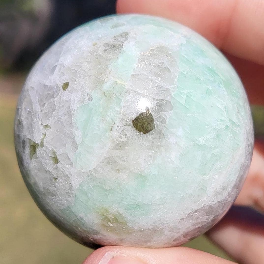 This listing is for the sparkly and GORGEOUS amazonite with green tourmaline crystal sphere shown in the photos above. The color in this crystal is a beautiful blue that glitters like crazy in the right light (shown in video). She is dotted throughout vibrant green tourmaline windows that positively glow in the sun! Measuring approximately 2" in diameter and polished to a smooth shine, the colors in this amazonite and green tourmaline sphere are 100% natural and created by Mother Earth. The energy that I get from this crystal is very prosperous, abundant, and positive. She would be perfect as a crystal companion for meditation, manifestation, and spiritual workings. She would also be excellent as part of an altar, crystal grid, or placed anywhere within your space to project her incredible energy.