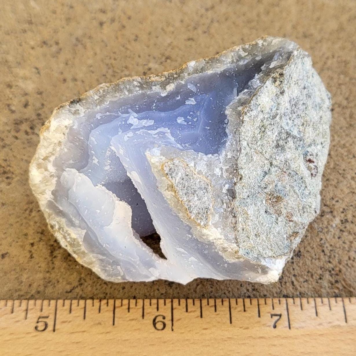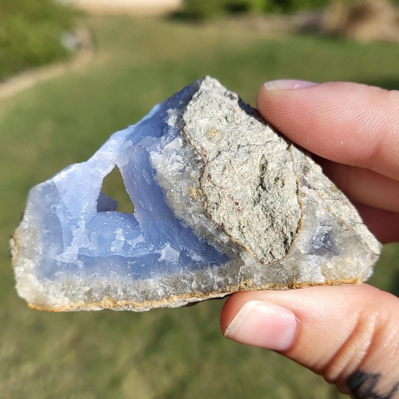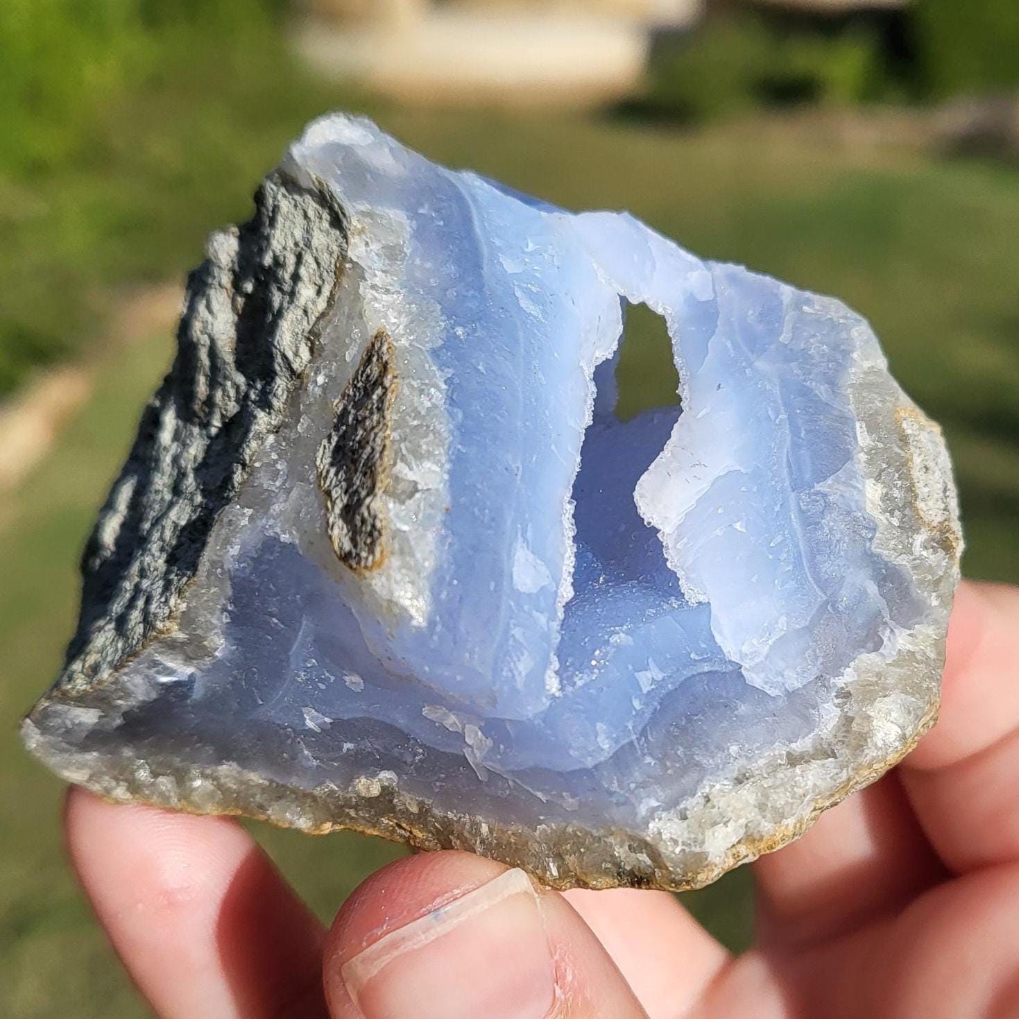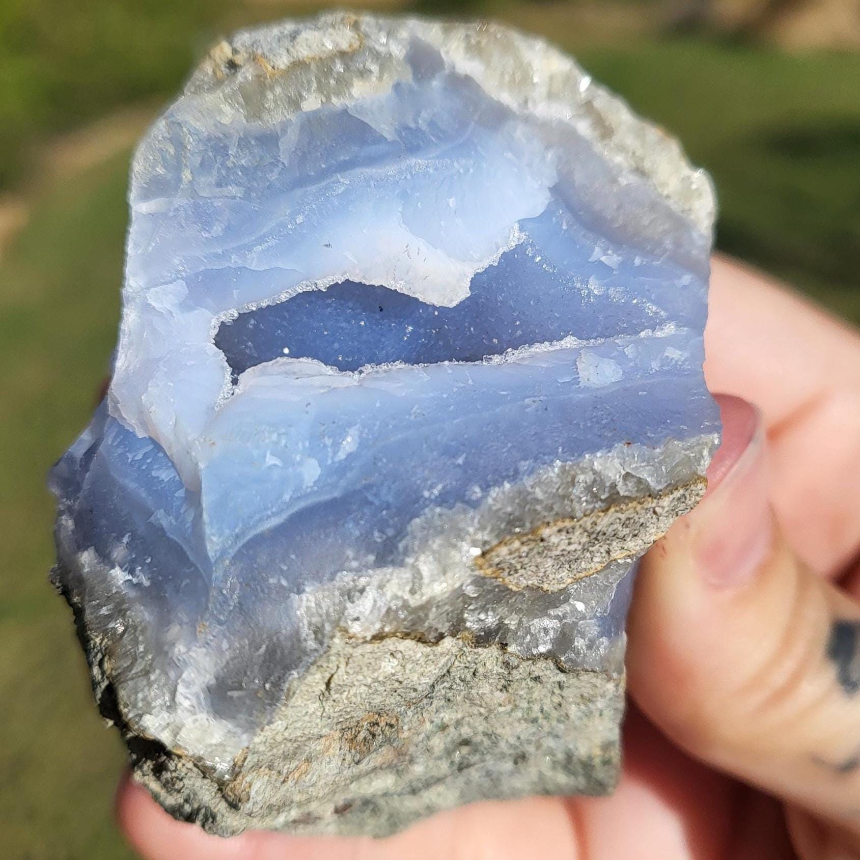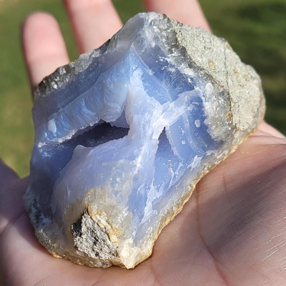 These blue lace agate clusters are from Malawi, Africa. Blue lace agate is a highly sought-after variety of chalcedony, known for its delicate crystals, blue hue, and wavy patterns within the stone.