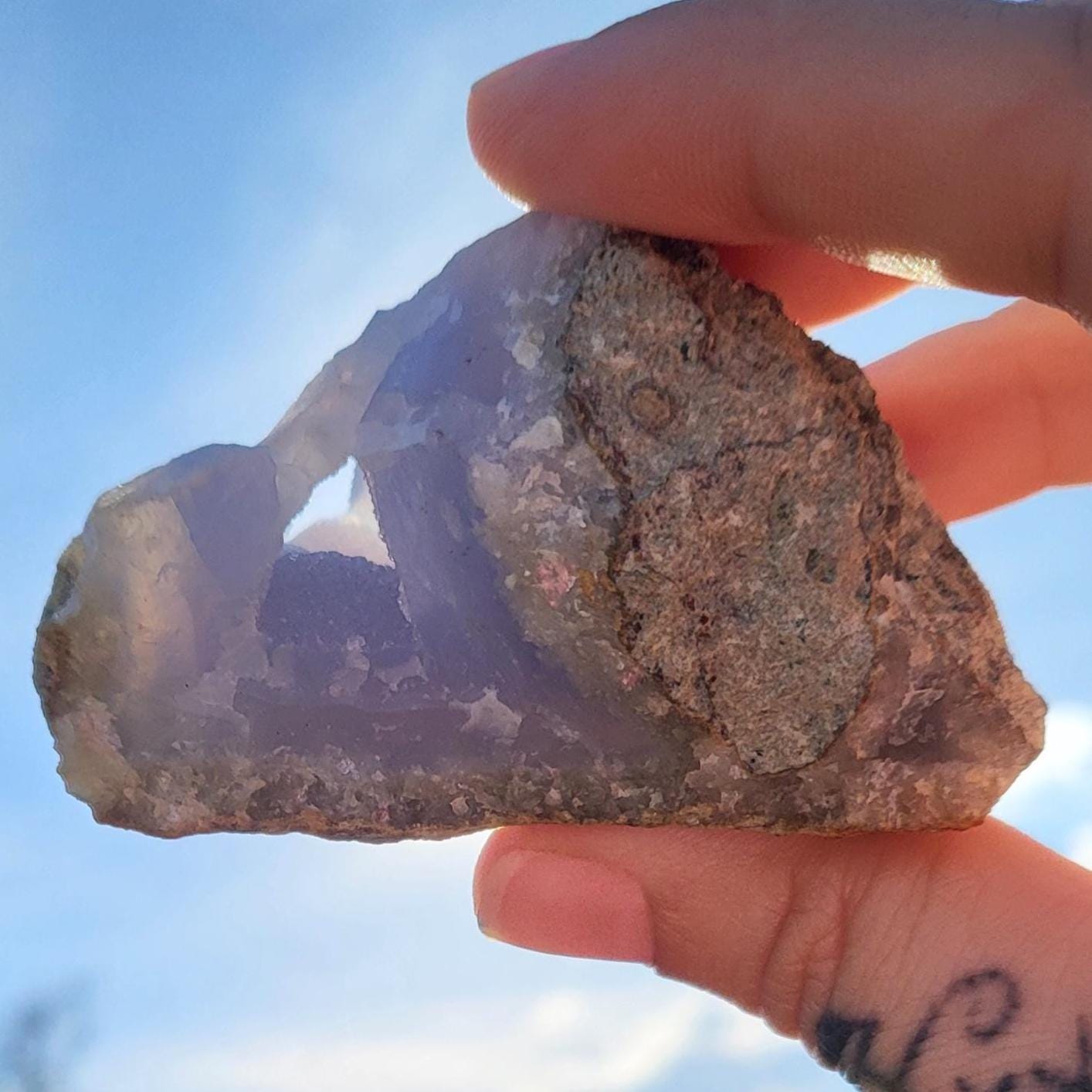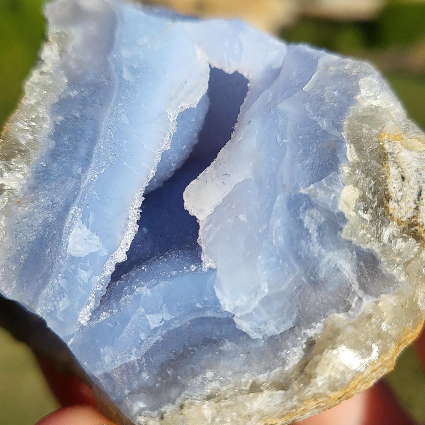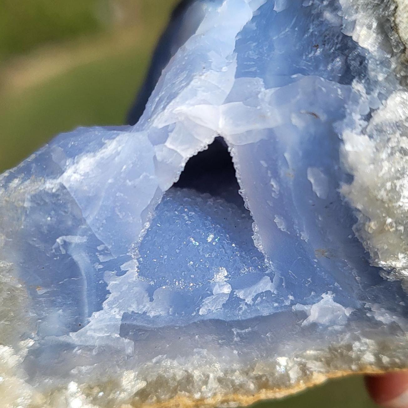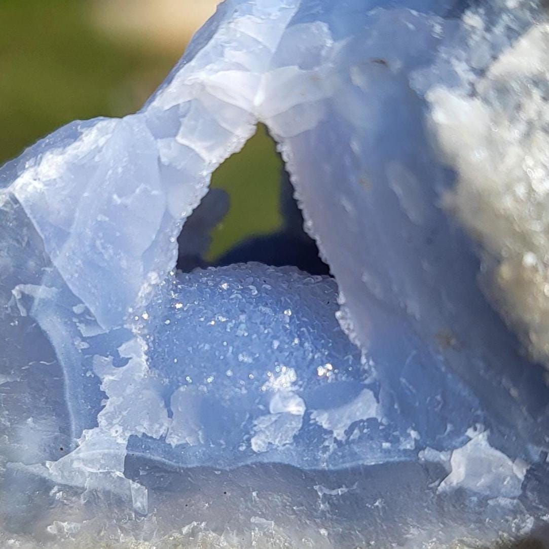 This listing is for the INCREDIBLE, sparkly blue lace agate crystal geode holey stone shown in the photos above. This geode measures approximately 2.5" at her longest point and is filled with glittery, sparkly crystals - something that is relatively rare in blue lace agate specimens. The geode is open all the way through with a small blue lace agate bridge on top, making her an excellent holey stone for scrying, divination, and intuitive workings! The individual crystals in this geode are so sparkly and such a beautiful blue. Her color and sparkle is 100% created by Mother Earth. It is hard to capture all of her sparkle in photos so I have included a video to try to better capture her beauty. The shape of this geode reminds me of some kind of incredible natural cavern. This crystal's energy feels spirited, magical, and intuitive. She would be excellent as a meditation or crystal companion, used in magical workings, at the center of a crystal grid, or placed anywhere in your home to project her spirited energy.