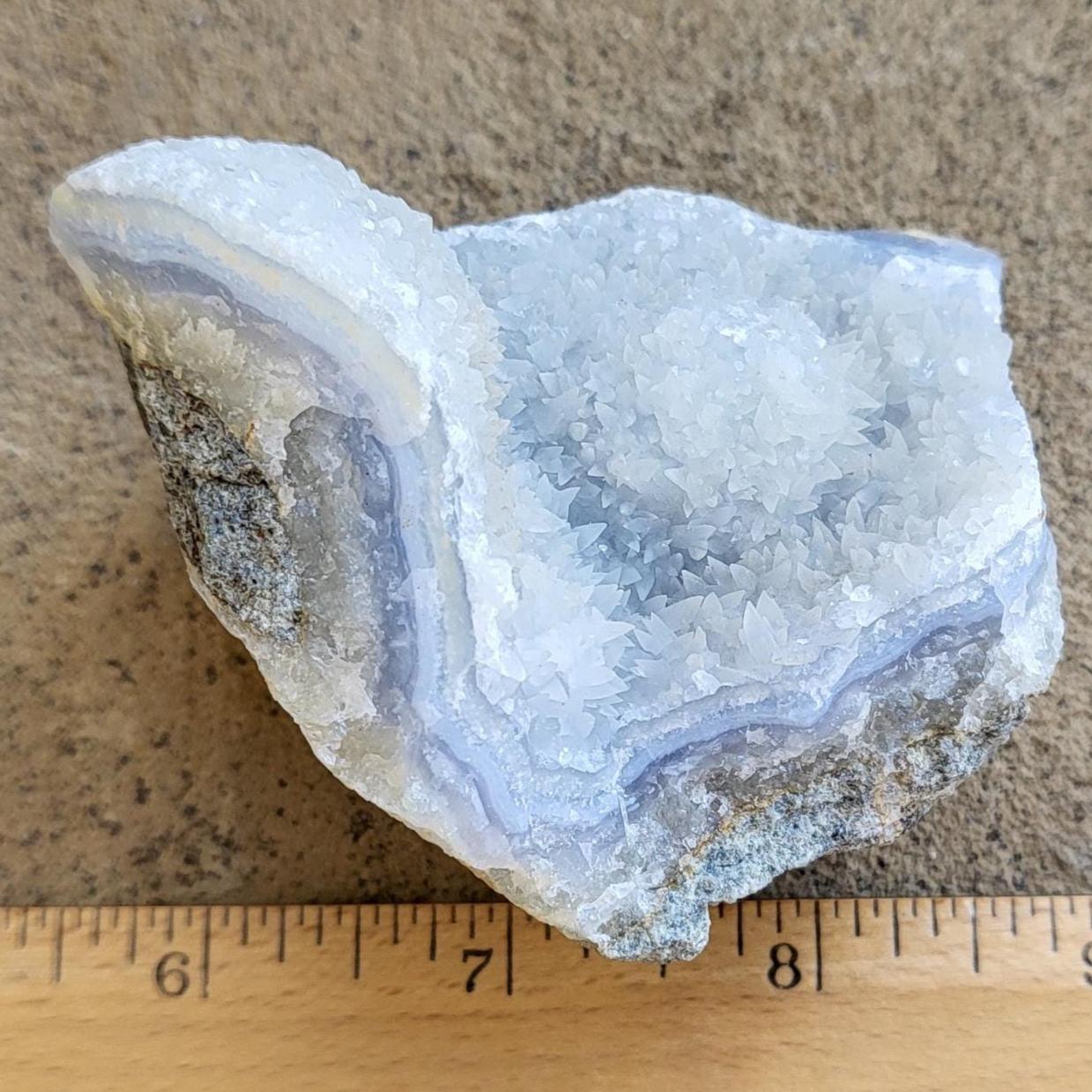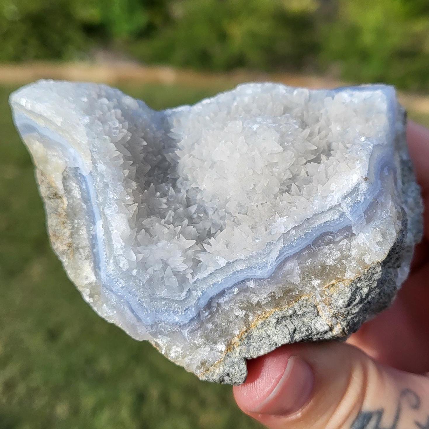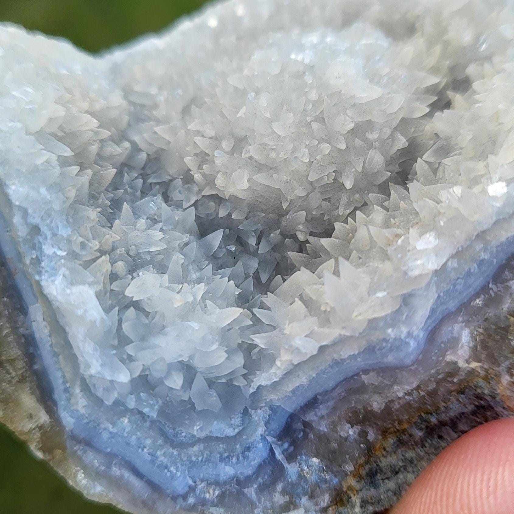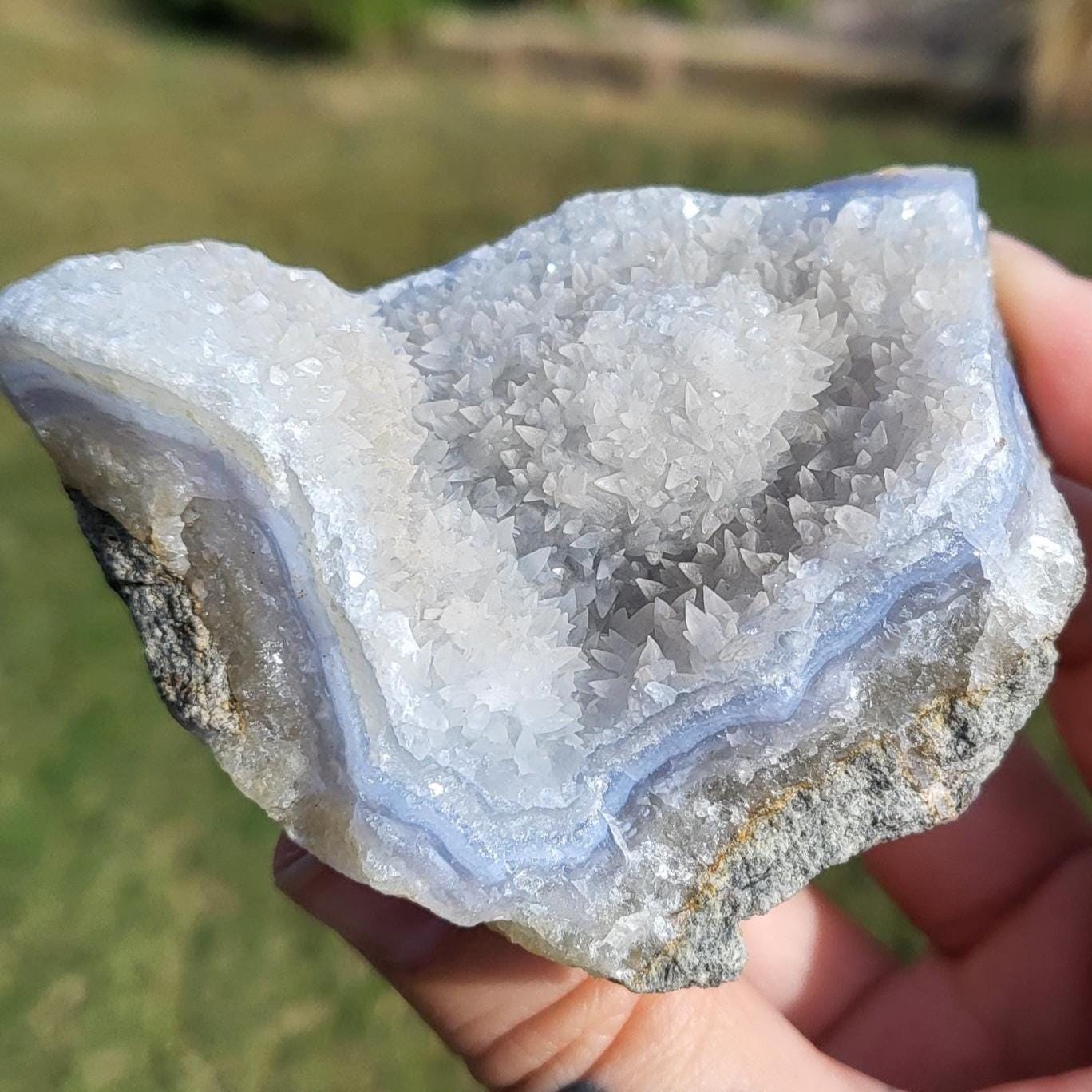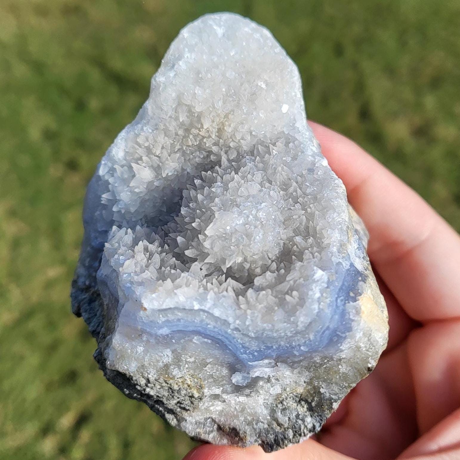 These blue lace agate clusters are from Malawi, Africa. Blue lace agate is a highly sought-after variety of chalcedony, known for its delicate crystals, blue hue, and wavy patterns within the stone.