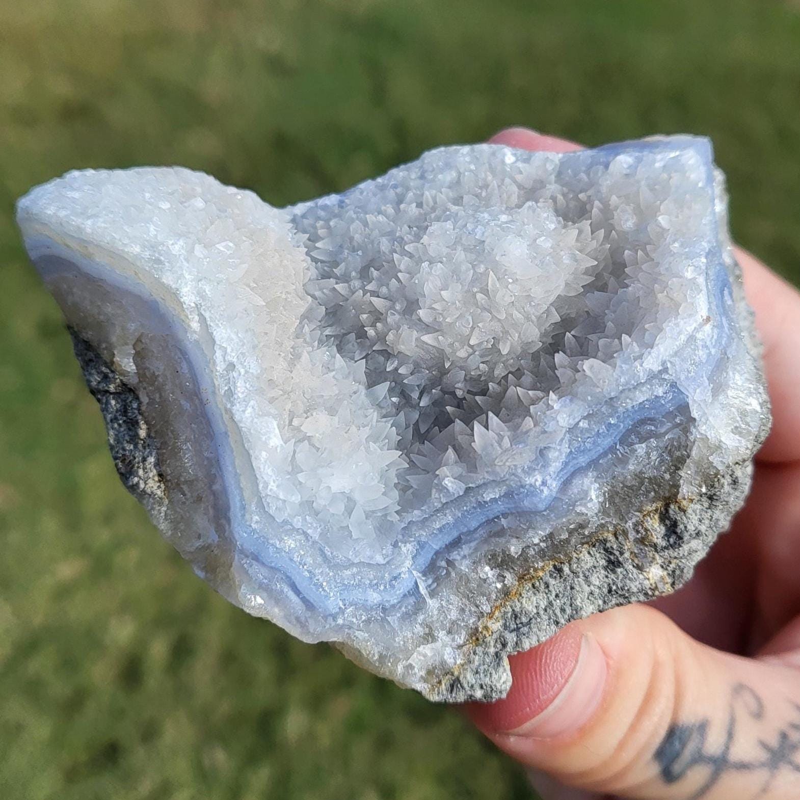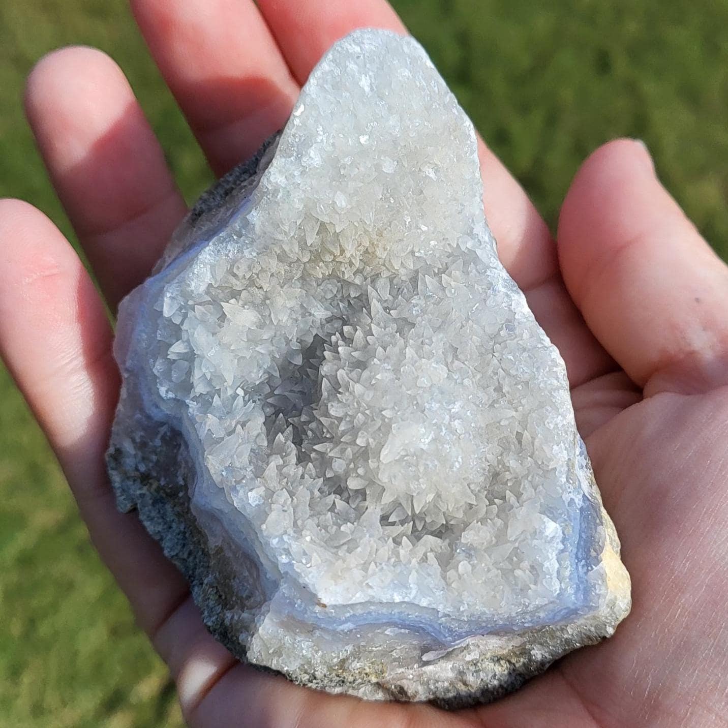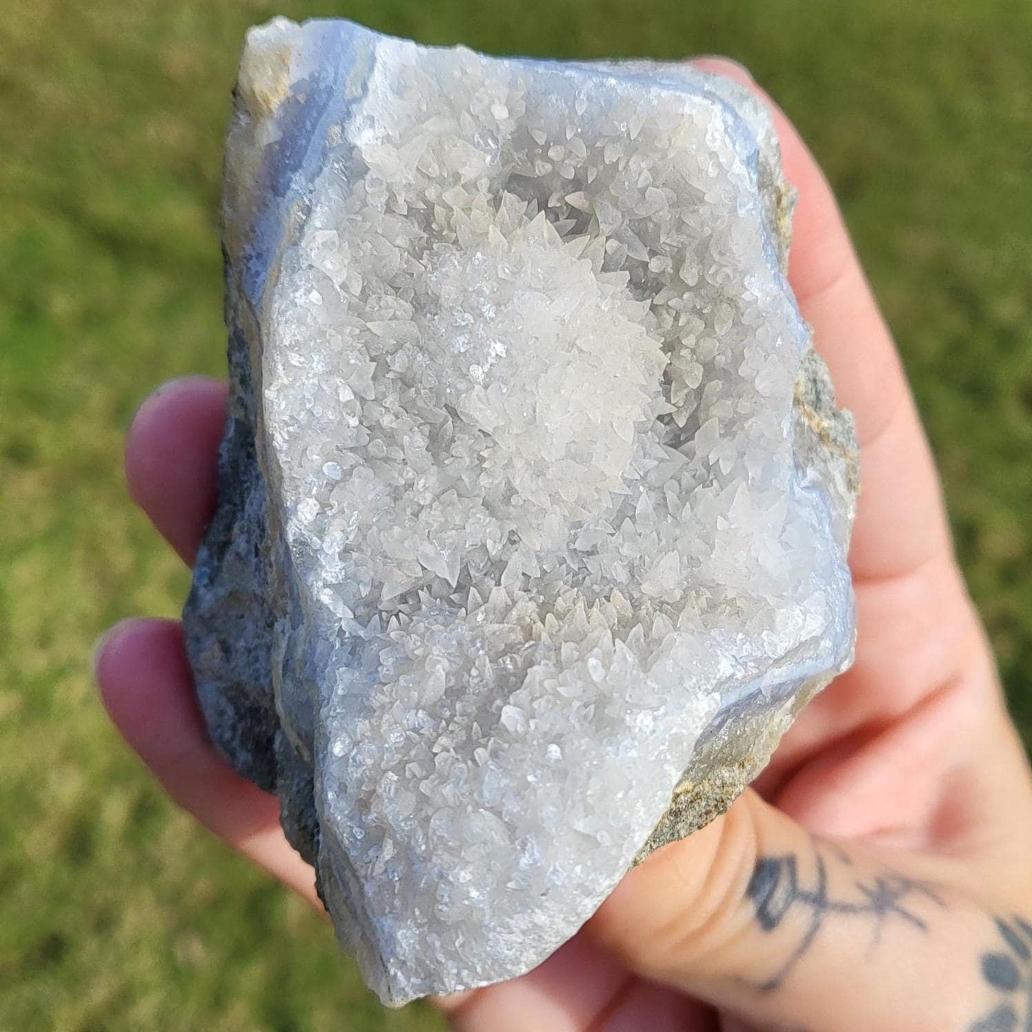 This listing is for the incredible blue lace agate and dogtooth calcite crystal shown in the photos above. This cluster measures just over 3" at her longest point and weighs a chunky 8.3oz. She is filled with dogtooth calcite crystals growing within her main cavern - it looks like crystal mountains atop an icy winter world! Dogtooth calcite is a relatively rare calcite formation, especially atop blue lace agate. Her color and sparkle is 100% created by Mother Earth. It is hard to capture all of her beauty in photos so I have included a video to try to better capture it. This crystal has such magical, transformative energy to me. She would be excellent as a meditation or crystal companion, used in magical workings, at the center of a crystal grid, or placed anywhere in your home to project her powerful, transformative energy.