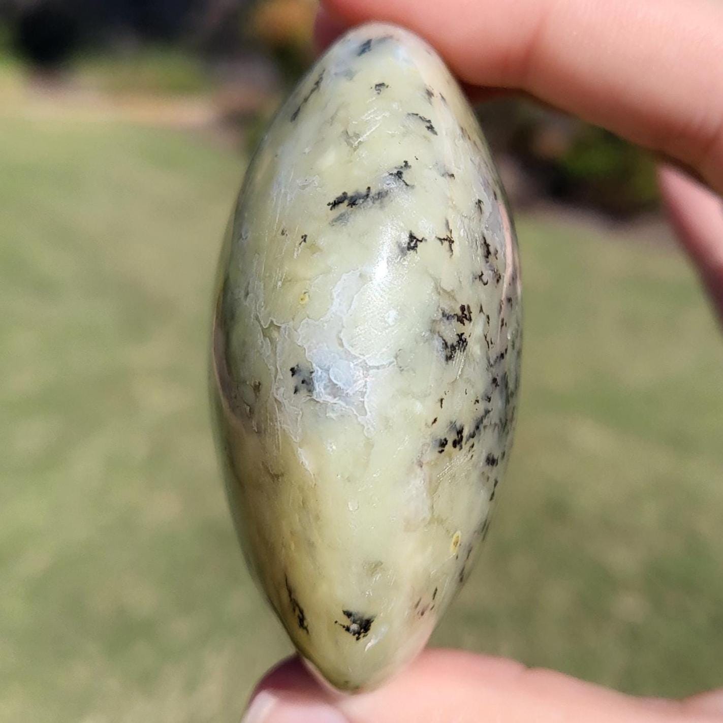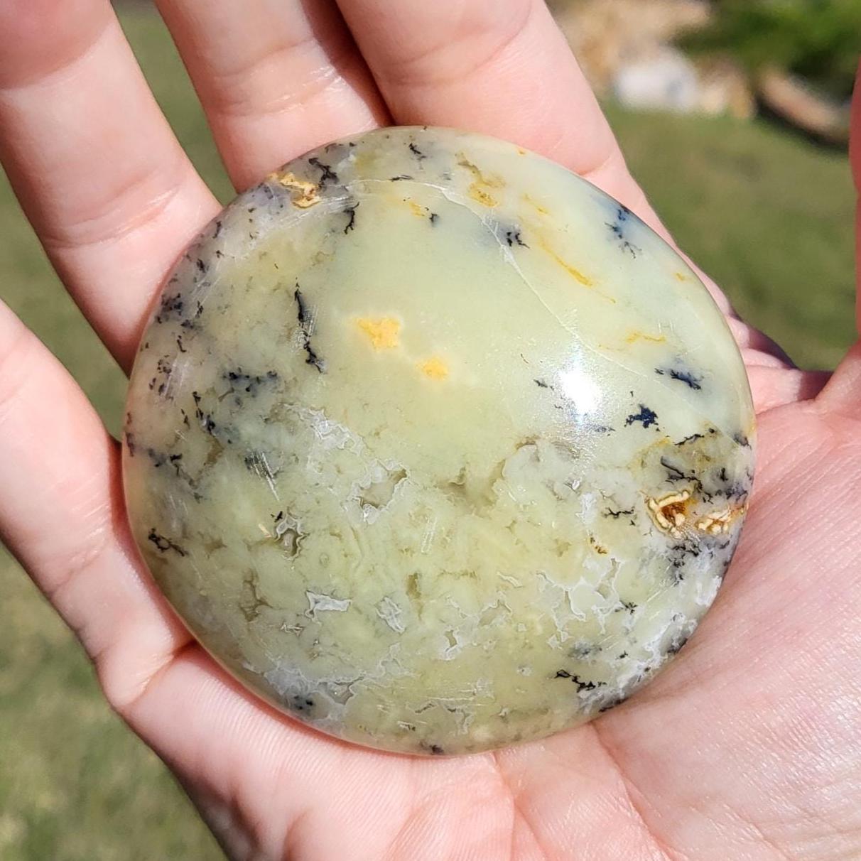 This listing is for the XL dendritic opal crystal palm stone shown in the photos above. This crystal has such a beautiful spring green color and natural dendritic inclusions that look like little leaves and ferns inside her. Measuring approximately 2.7" in diameter, the color and shine in this crystal is 100% natural and created by Mother Earth! She has been polished to a smooth shine, and has such a lovely feel and weight in your hand. Dendritic opal is one of my favorite crystals, and I love this beautiful specimen so much! The energy that I get from this crystal is so deep, prosperous, transformative and wise. She would be excellent as a worry stone or daily crystal companion, placed on an altar or working space, or set anywhere in your home to project her lovely energy.