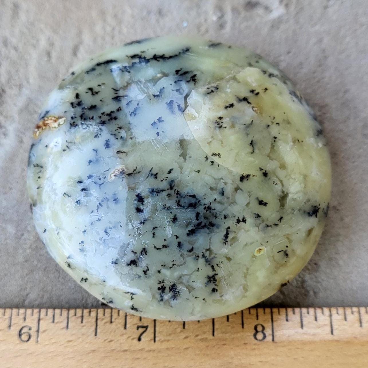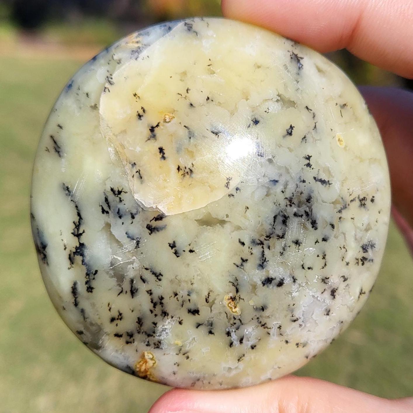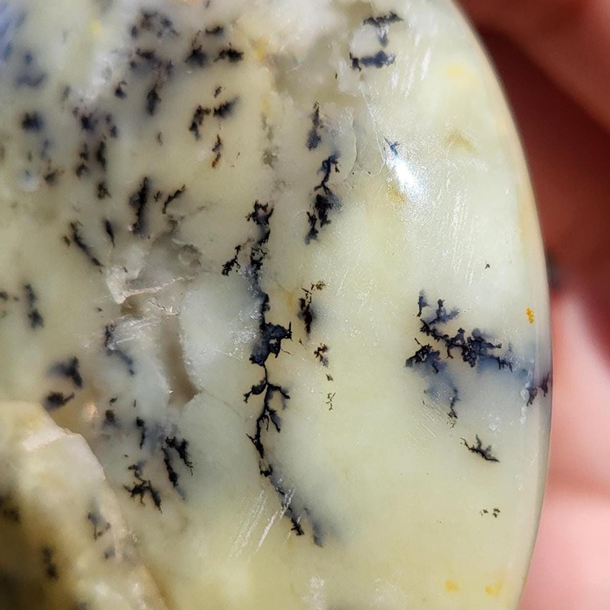 Dendritic opal is a special and highly sought-after type of solid, opaque opal that contains manganese oxide, which creates fern-like patterns within the crystal. These opals can vary in color from milky white to lavender to spring green. How cool! This dendritic opal comes from Madagascar.