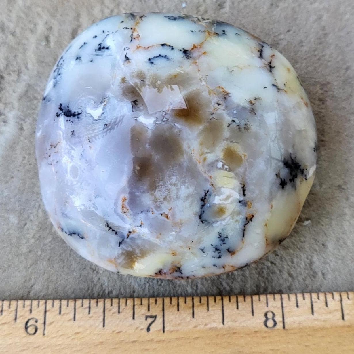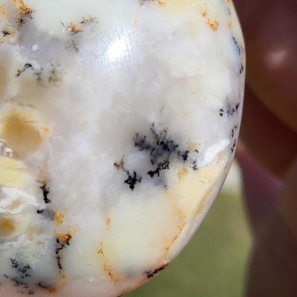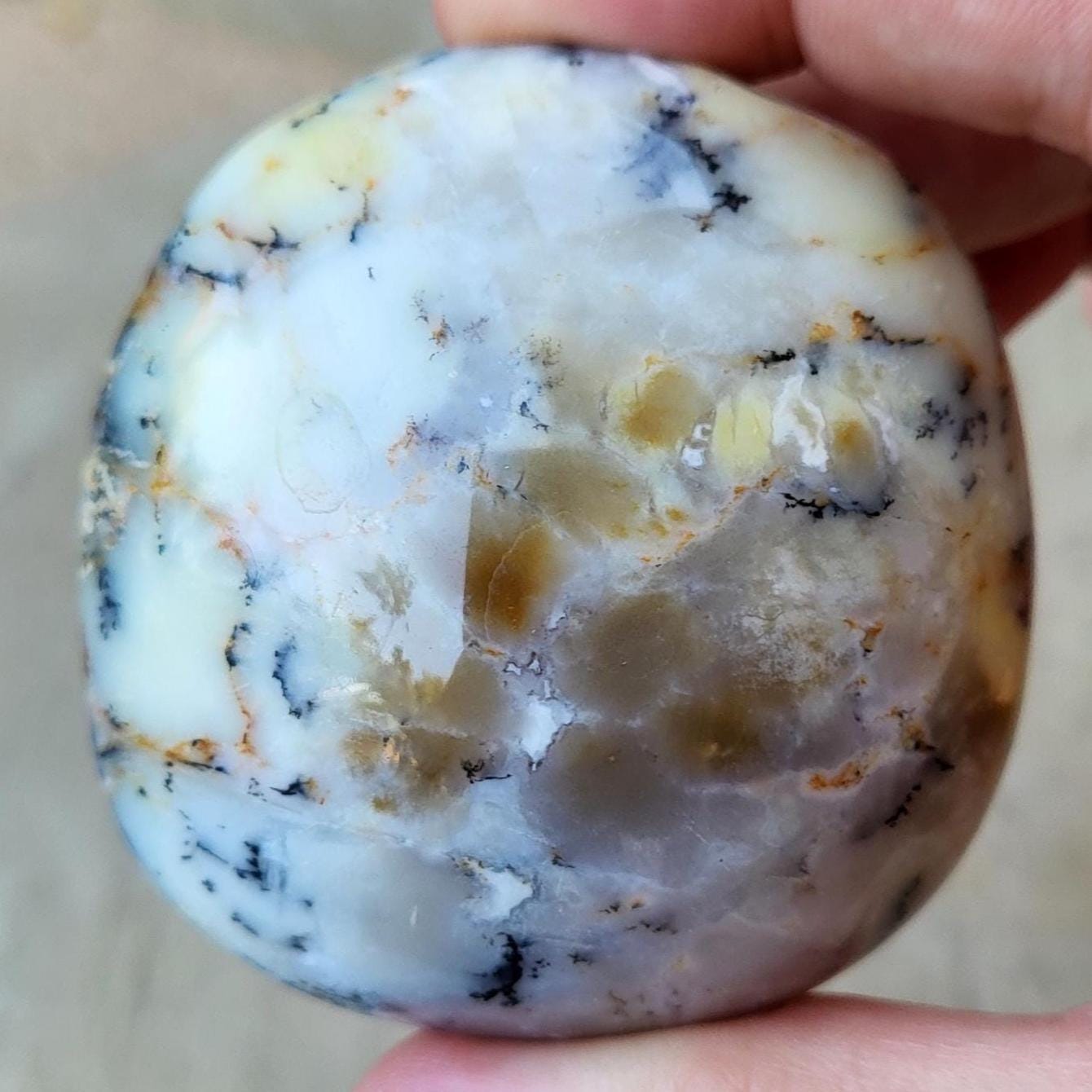 Dendritic opal is a special and highly sought-after type of solid, opaque opal that contains manganese oxide, which creates fern-like patterns within the crystal. These opals can vary in color from milky white to lavender to spring green. How cool! This dendritic opal comes from Madagascar.