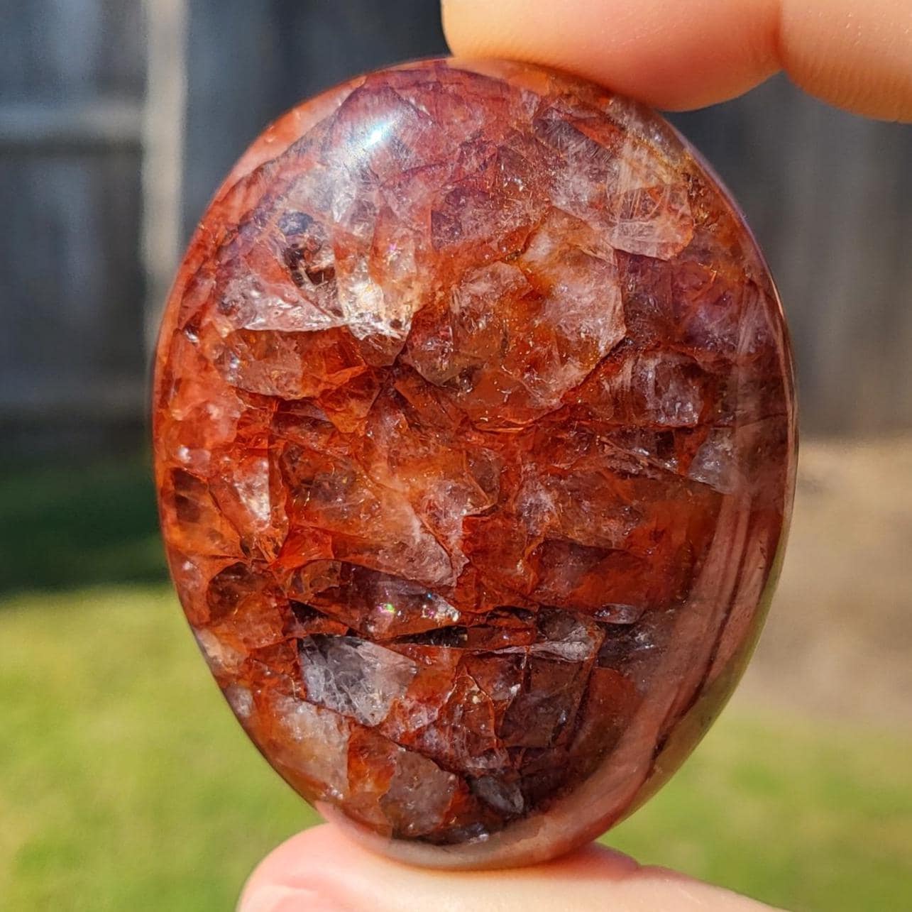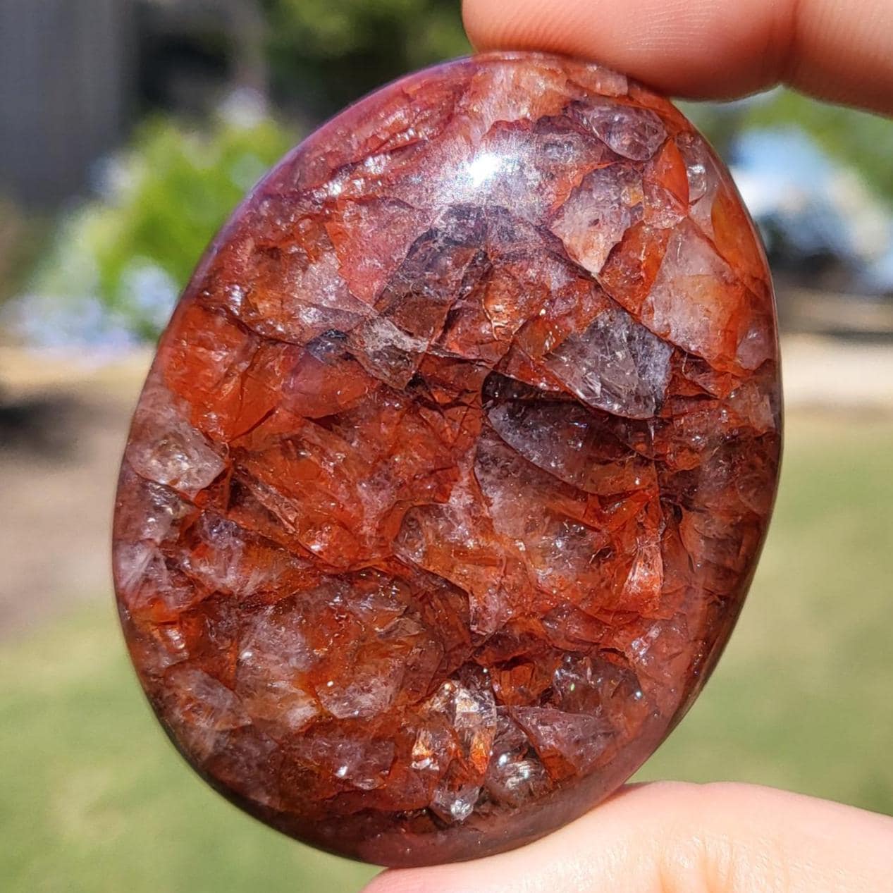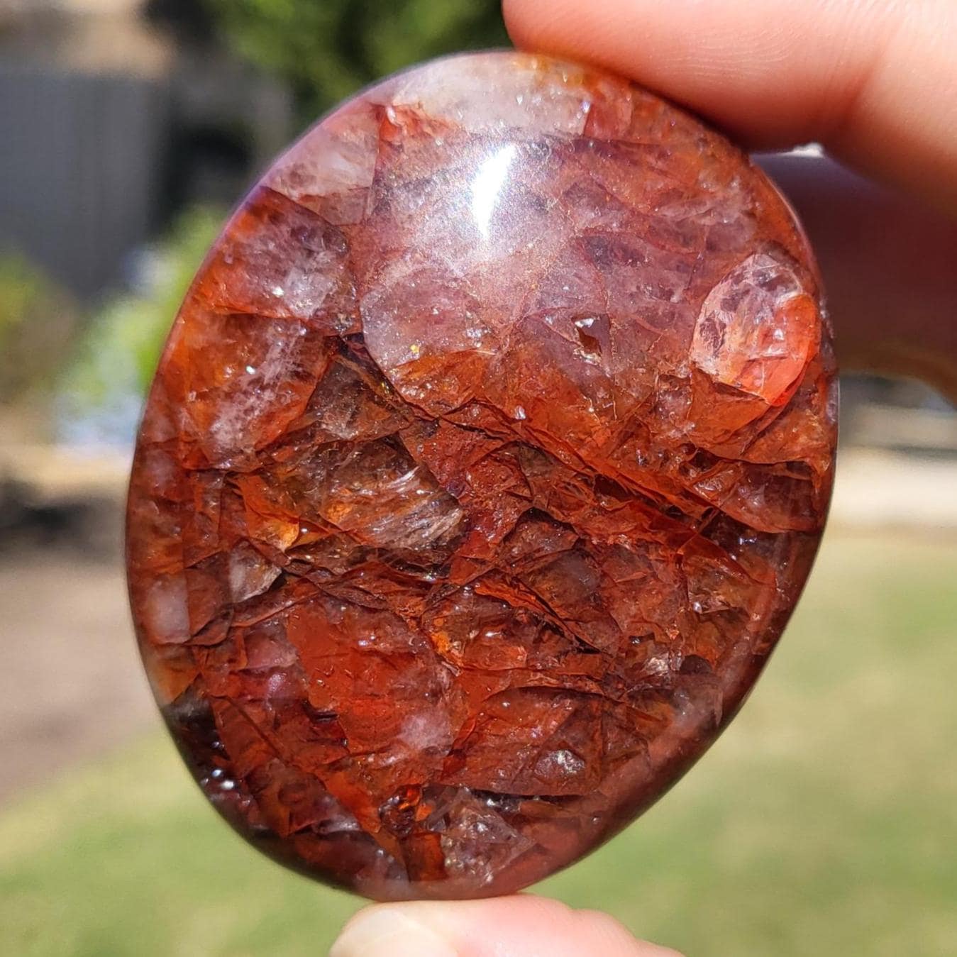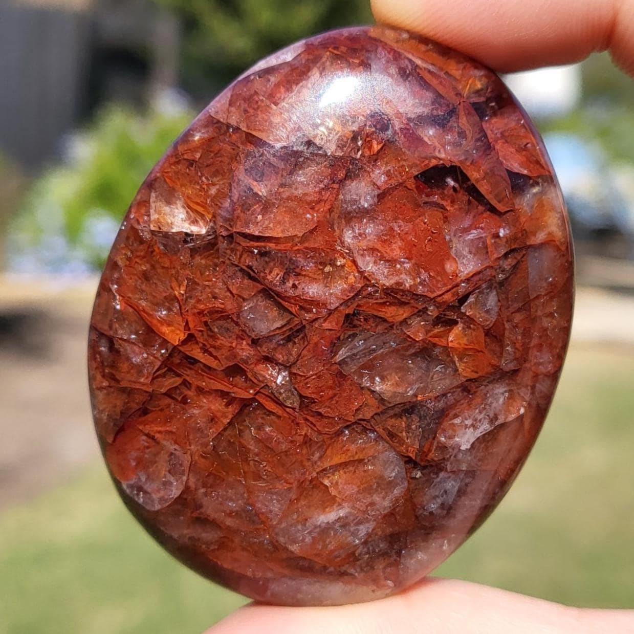 This hematoid quartz, also called harlequin quartz, comes from Madagascar. The vibrant red hue in these crystals is due to the hematite inclusions within the quartz, creating a warm, dynamic glow. The clarity of these crystals often causes the inclusions to display beautiful natural rainbows in the right light!