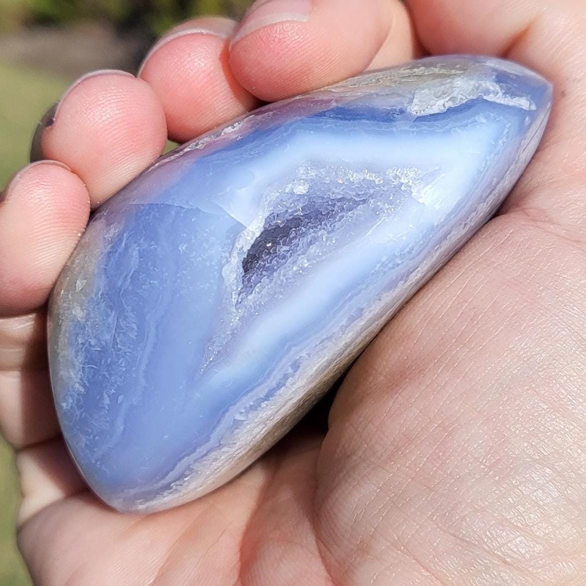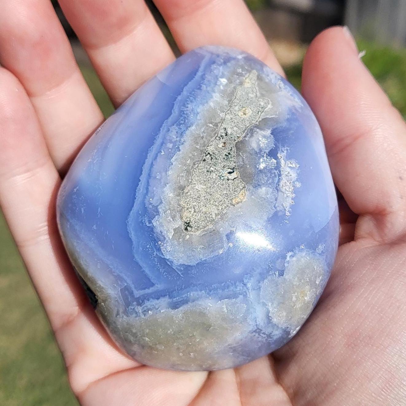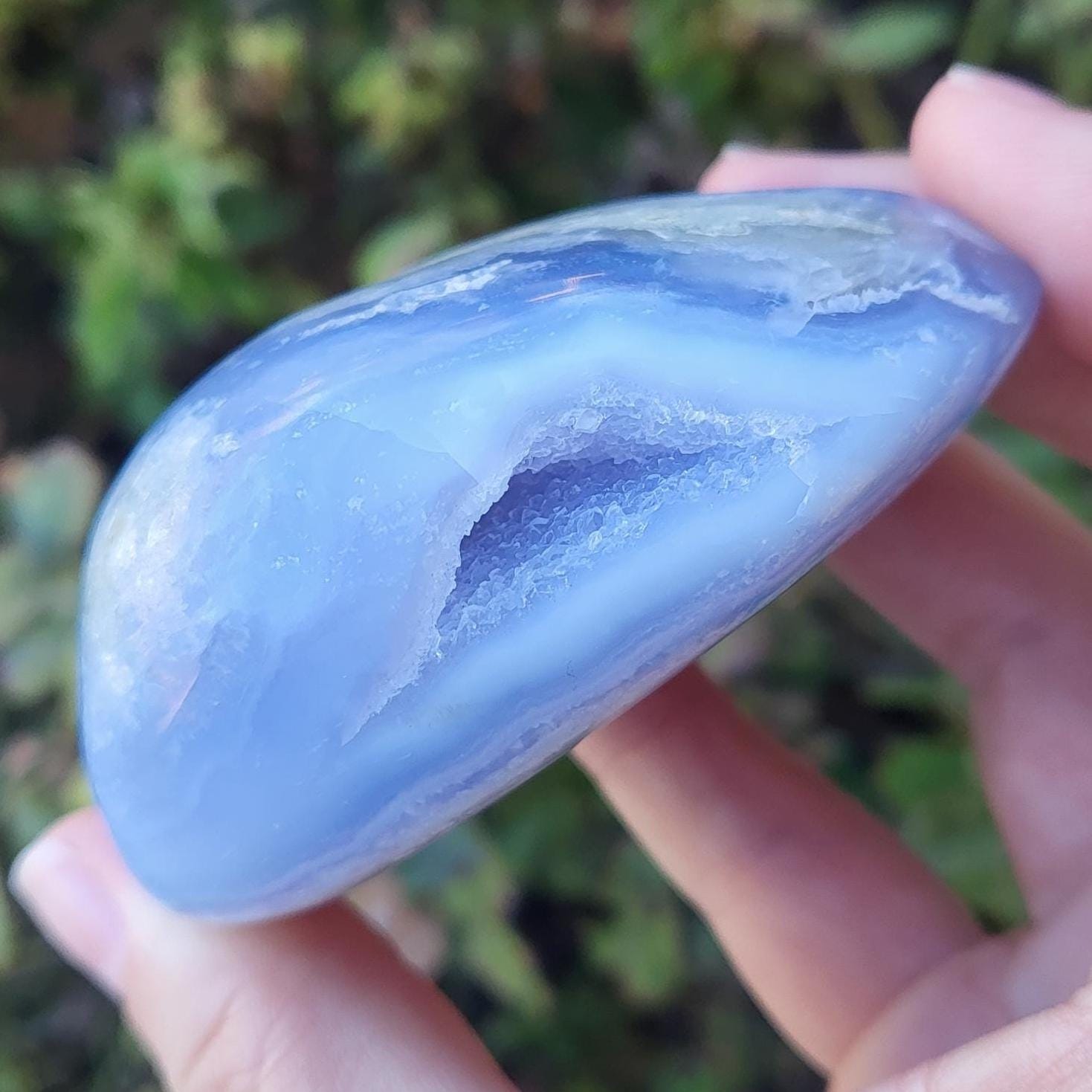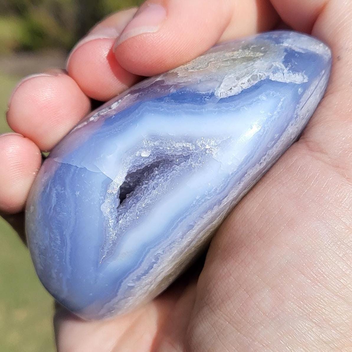 These blue lace agates are from Malawi, Africa. Blue lace agate is a highly sought-after variety of chalcedony, known for its delicate crystals, blue hue, and wavy patterns within the stone.