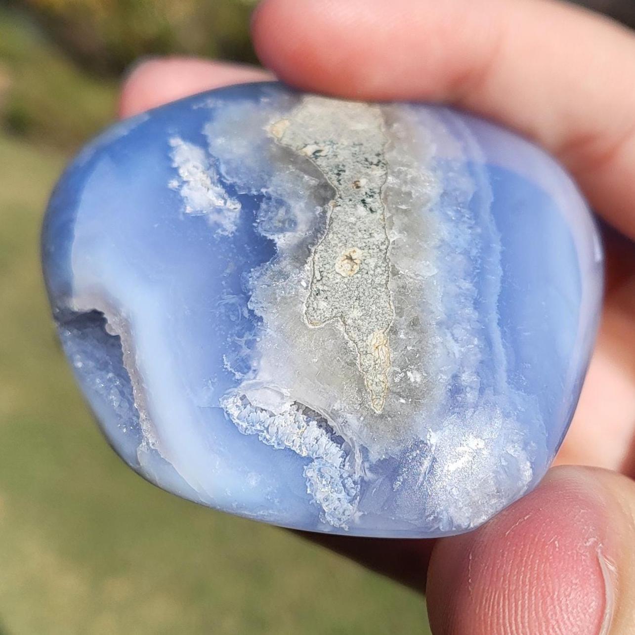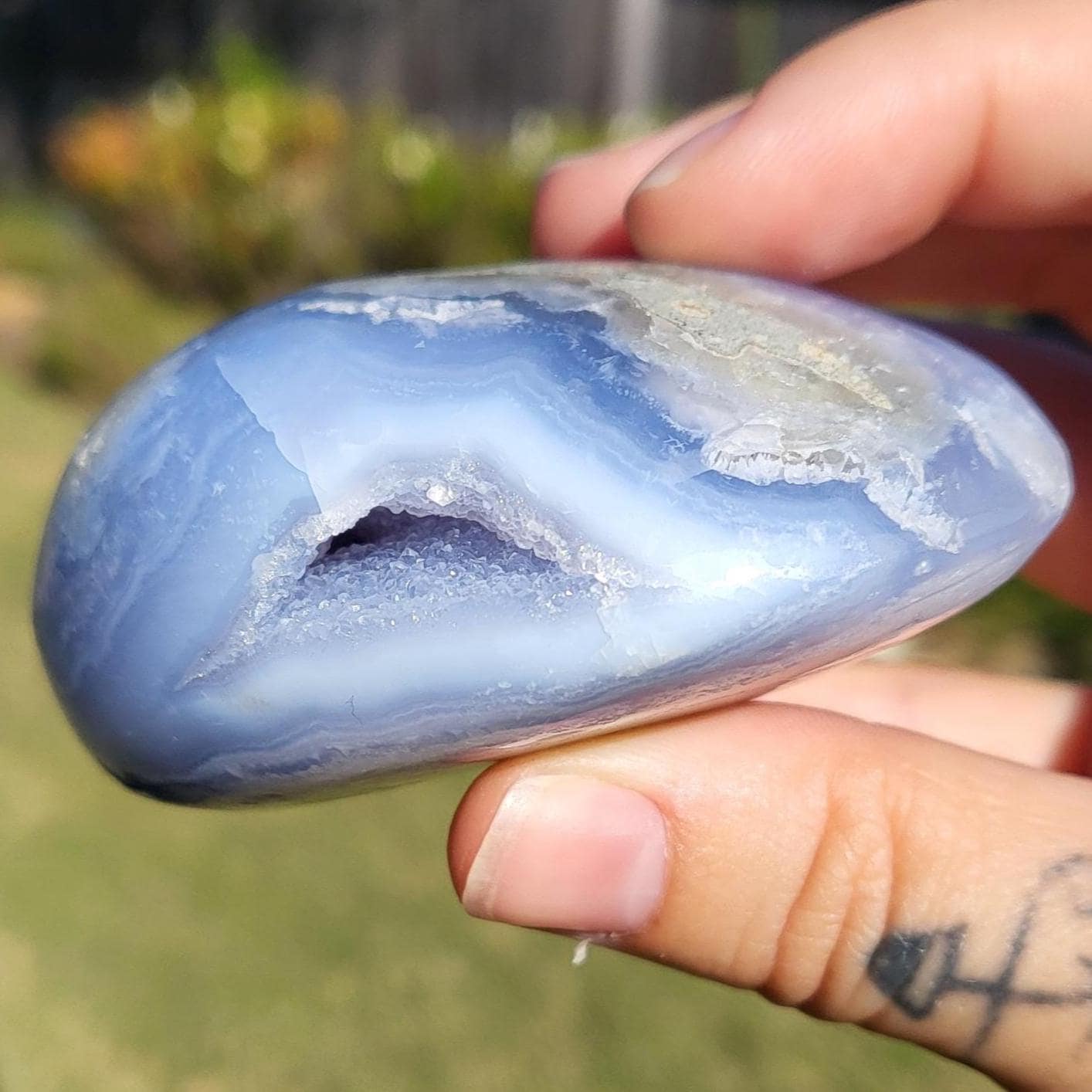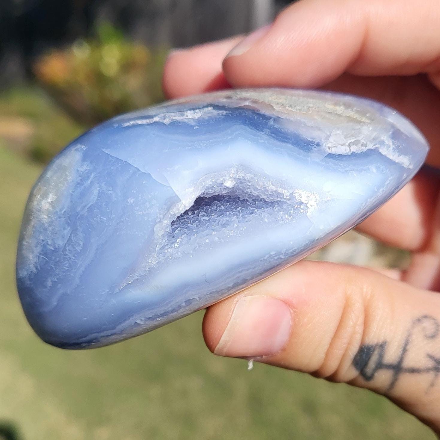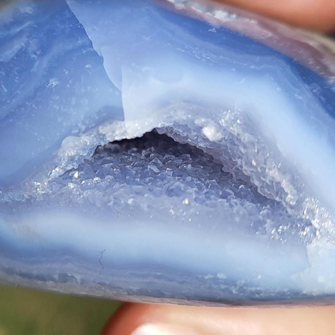 These blue lace agates are from Malawi, Africa. Blue lace agate is a highly sought-after variety of chalcedony, known for its delicate crystals, blue hue, and wavy patterns within the stone.