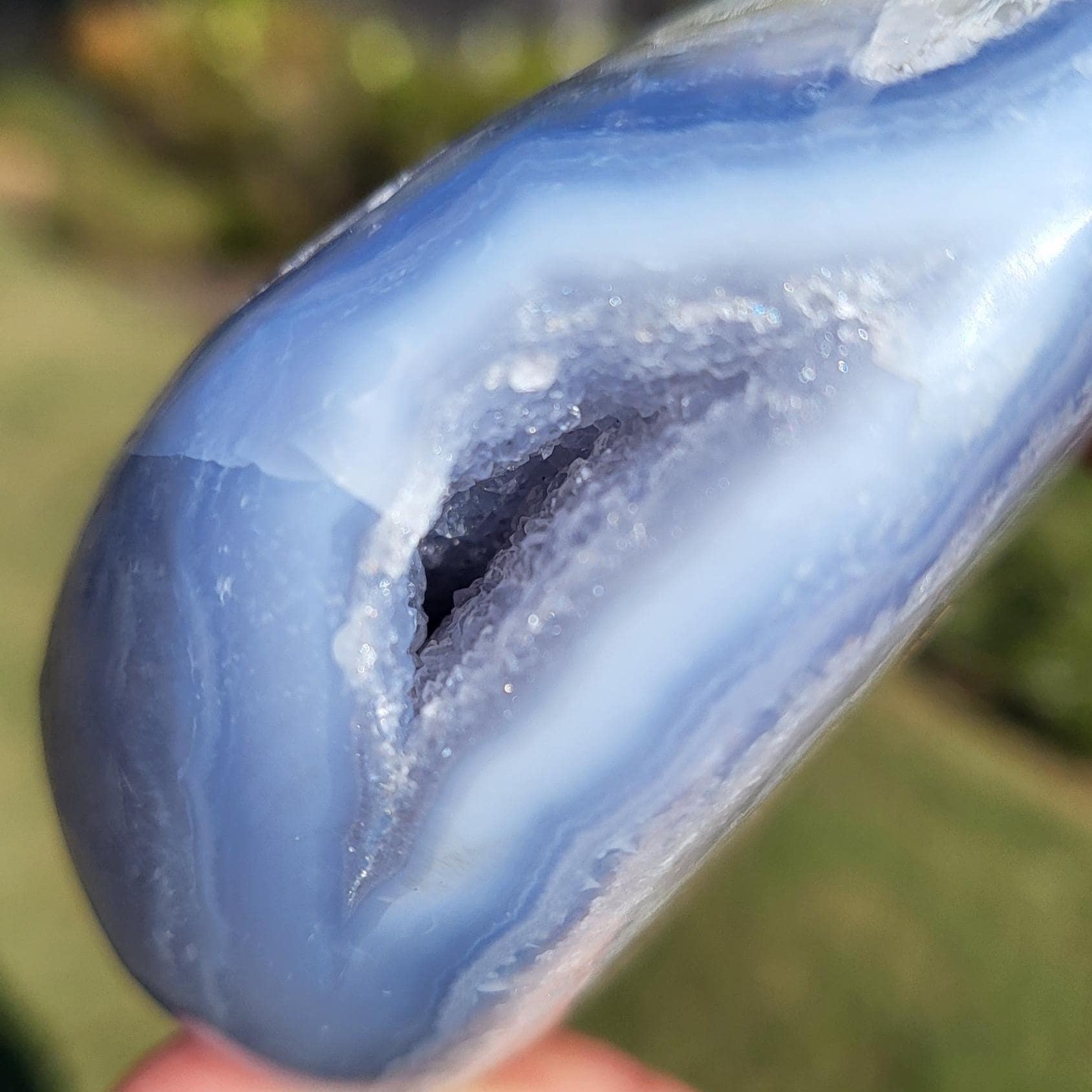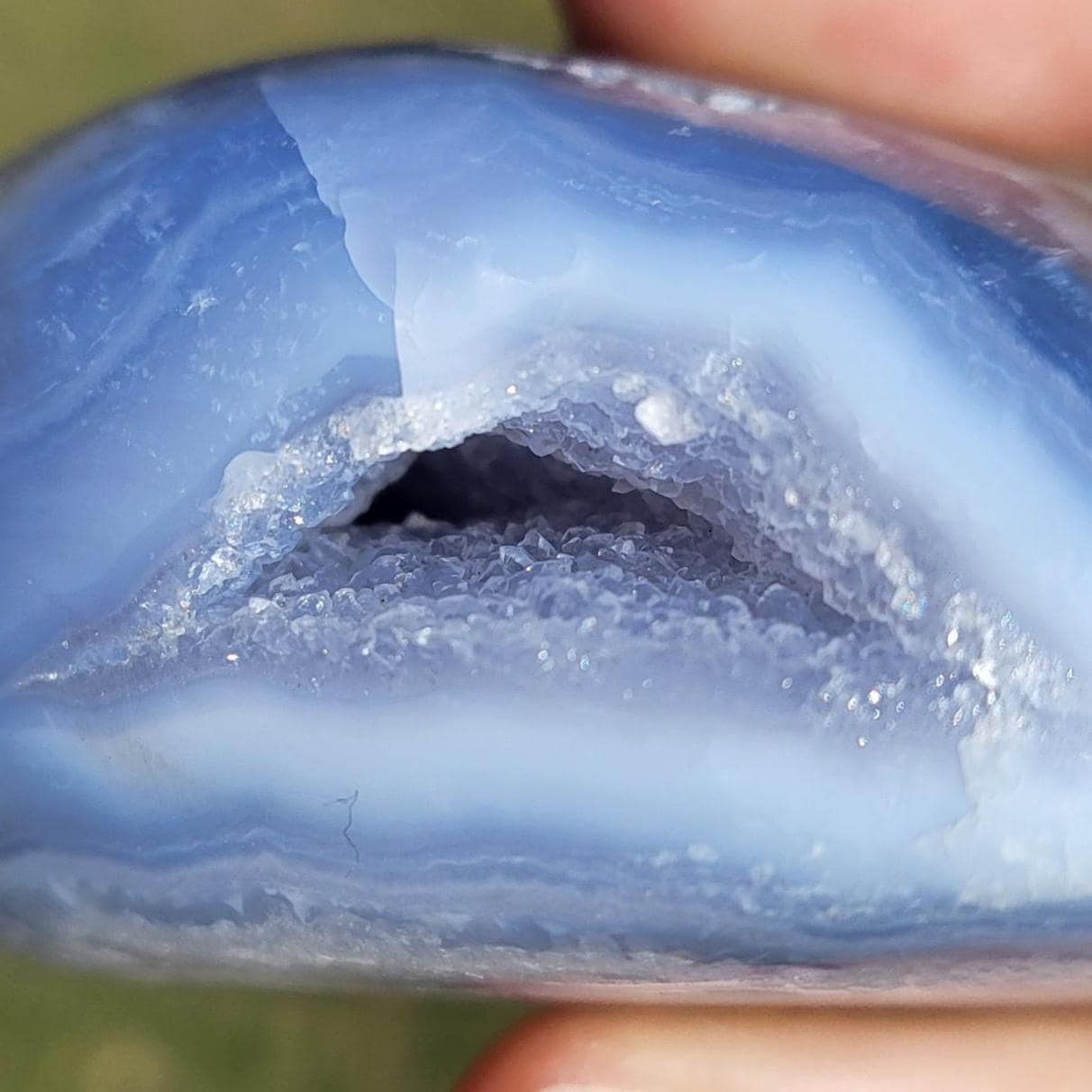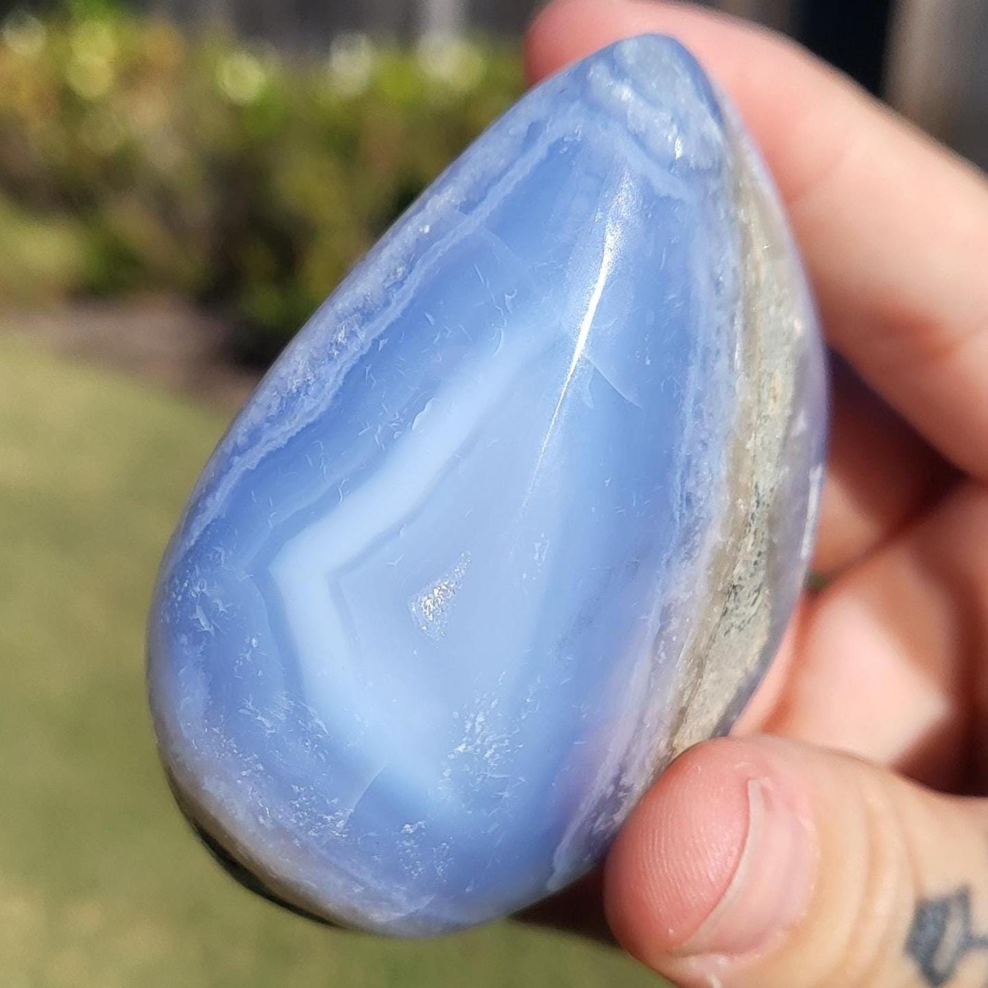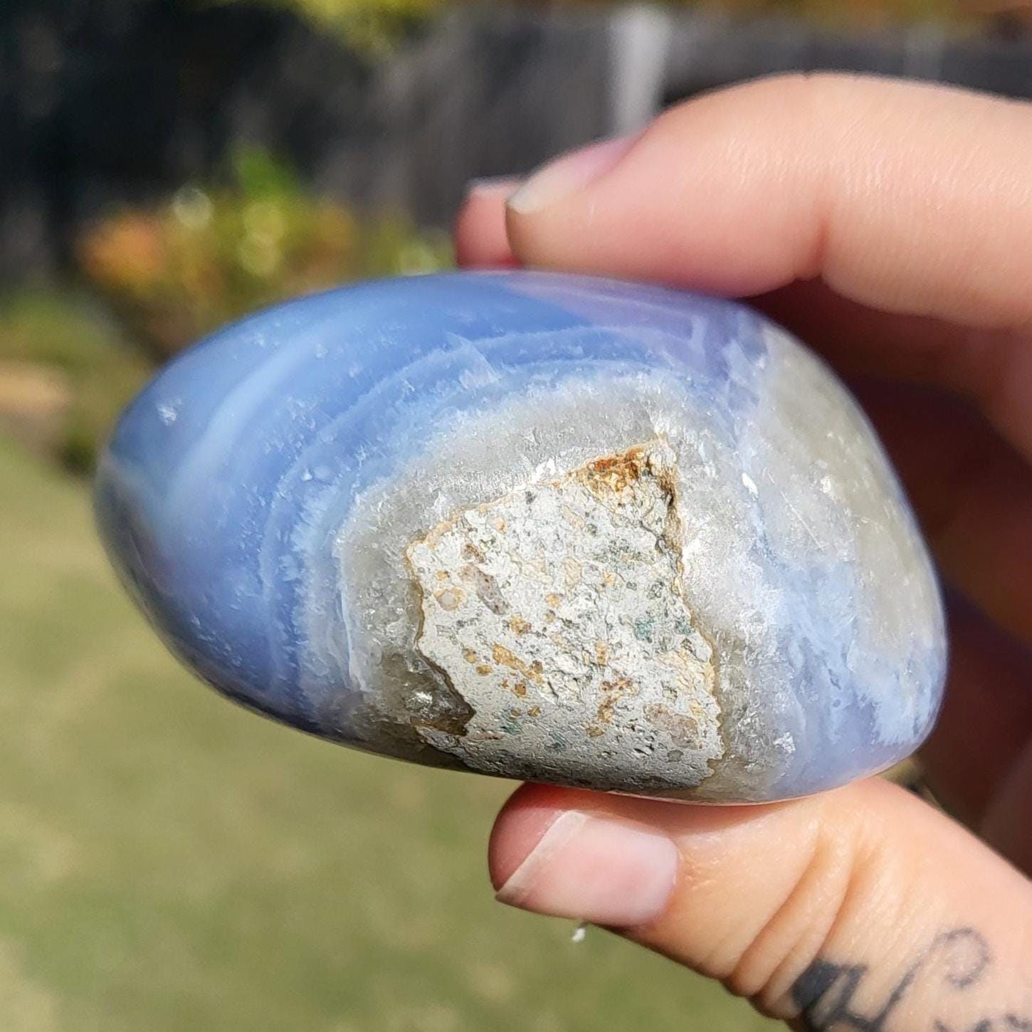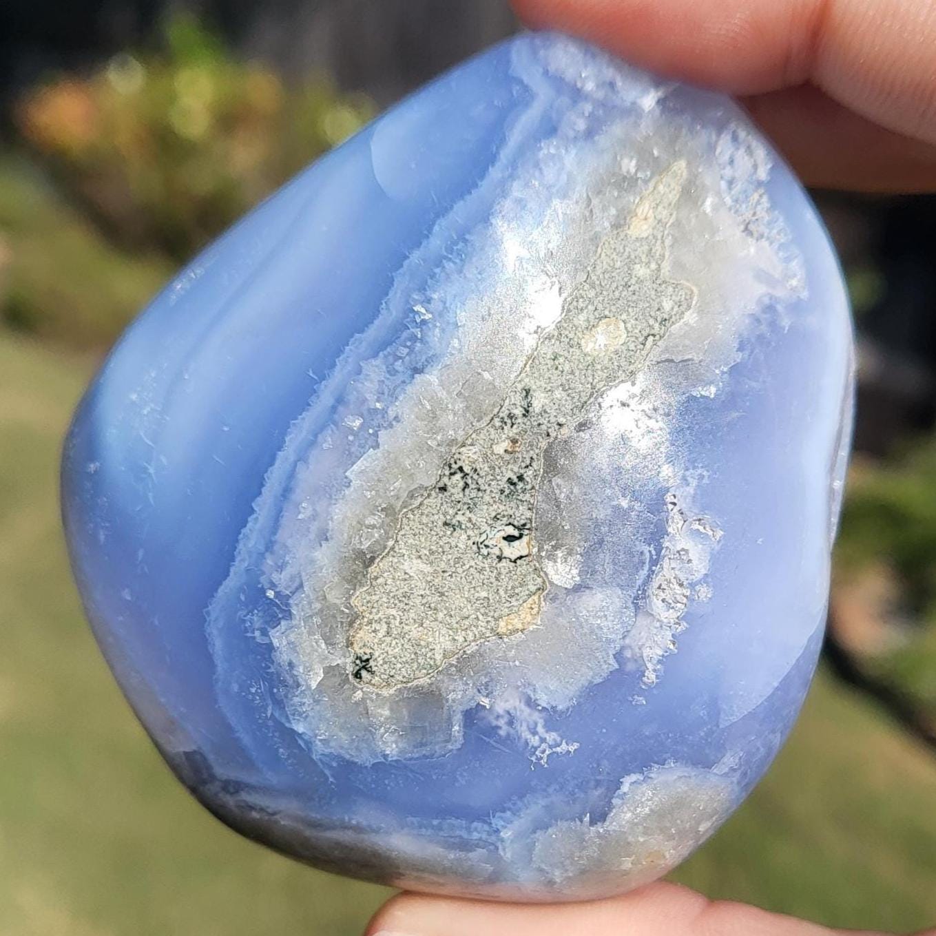 These blue lace agates are from Malawi, Africa. Blue lace agate is a highly sought-after variety of chalcedony, known for its delicate crystals, blue hue, and wavy patterns within the stone.