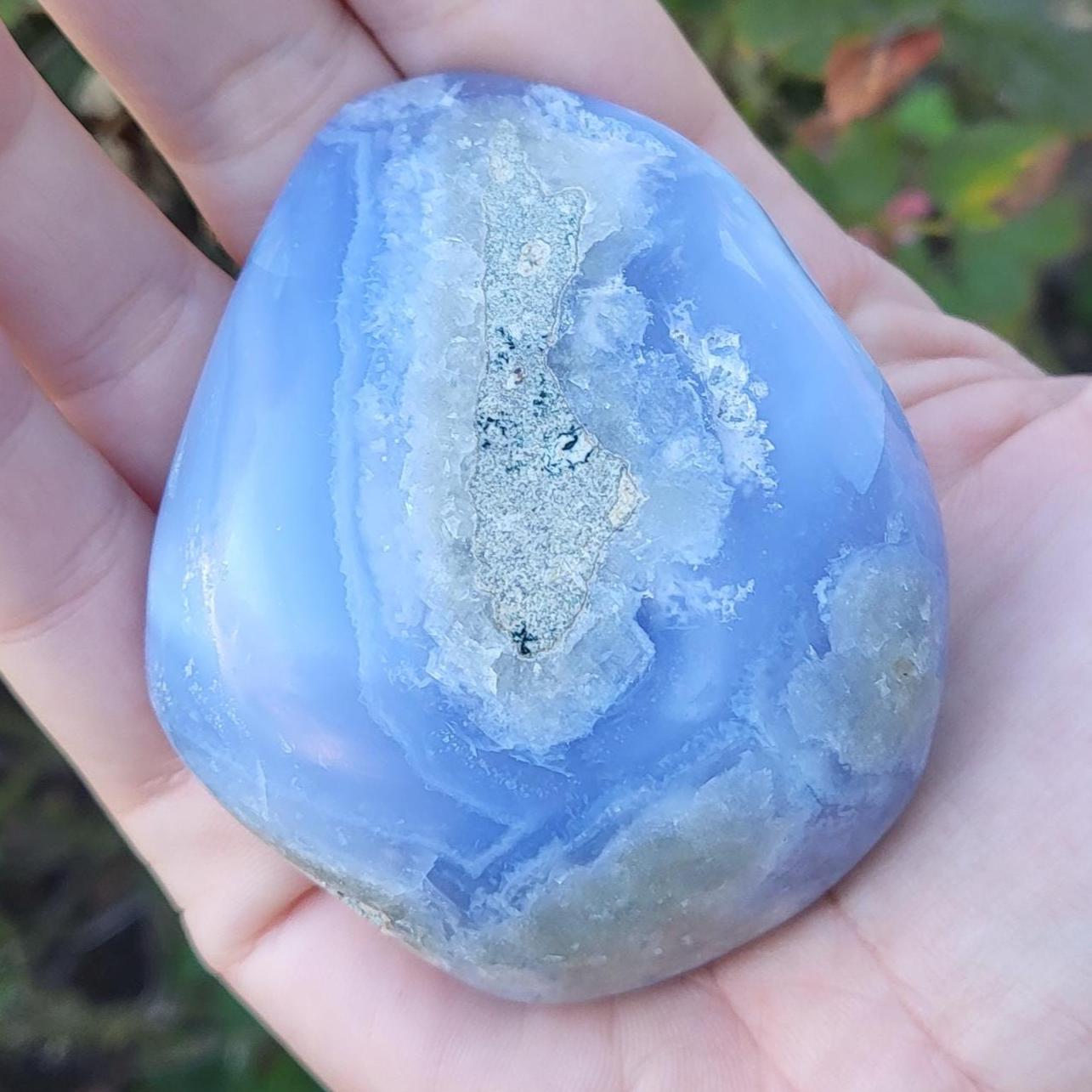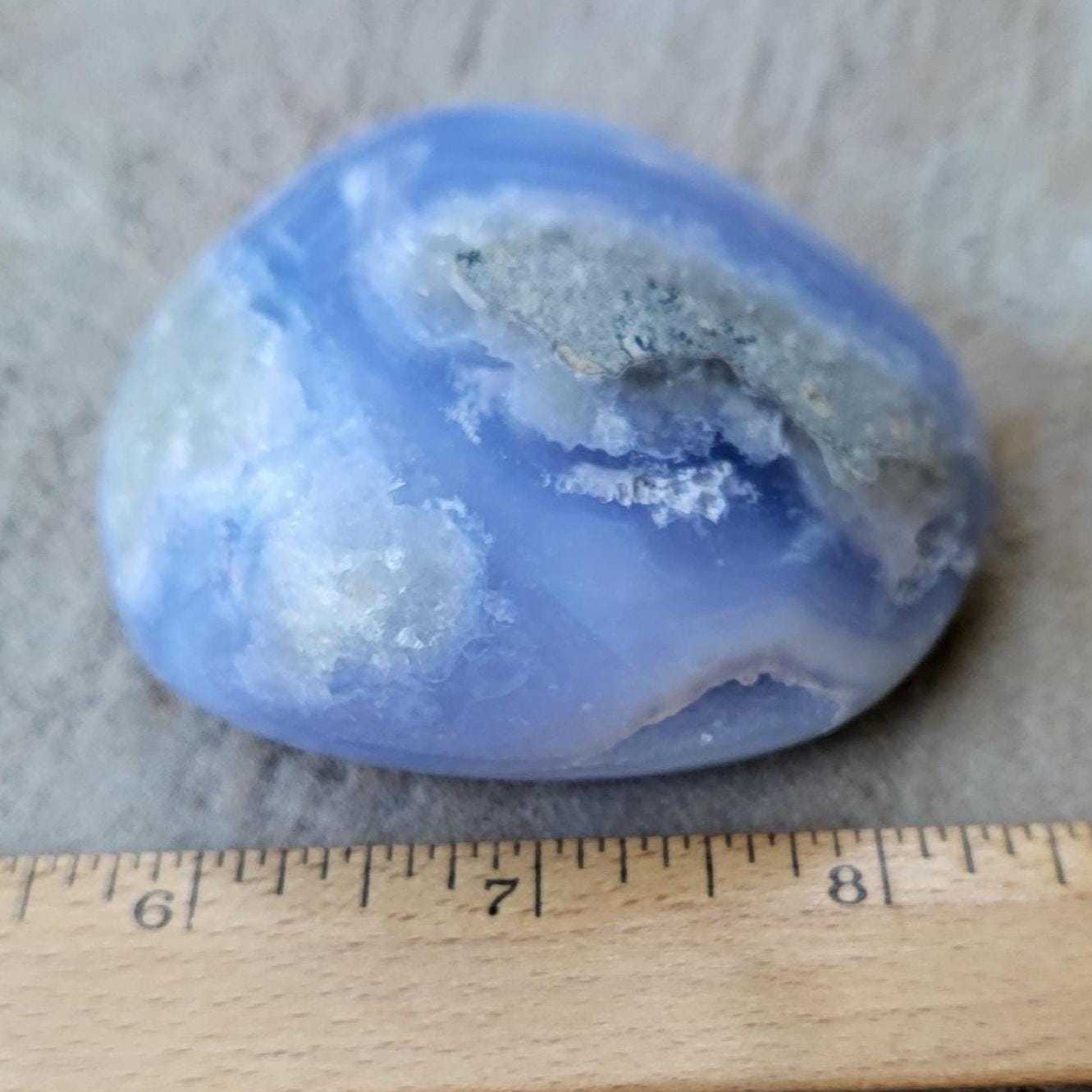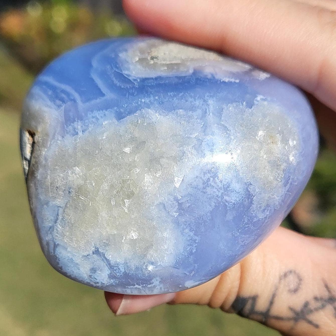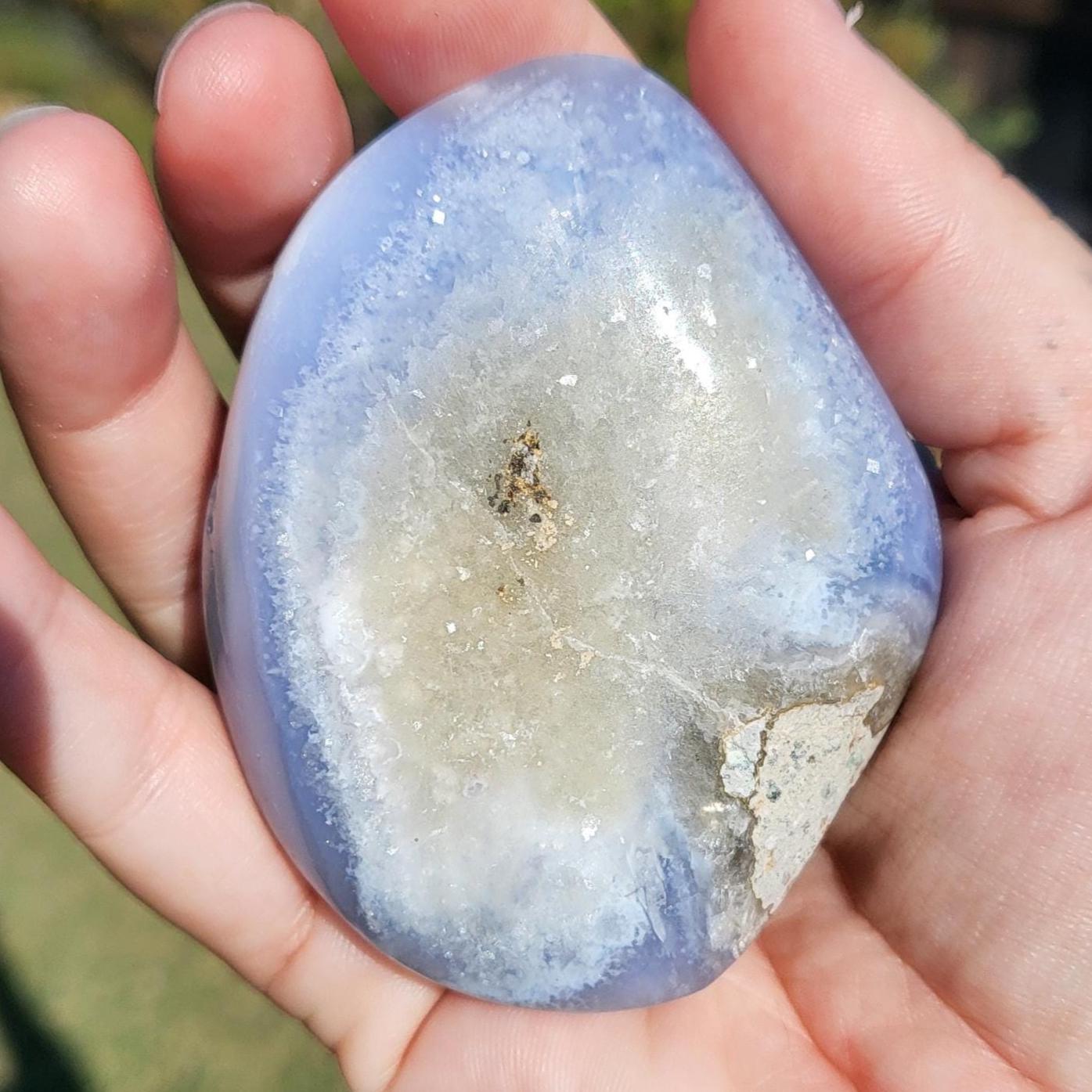 These blue lace agates are from Malawi, Africa. Blue lace agate is a highly sought-after variety of chalcedony, known for its delicate crystals, blue hue, and wavy patterns within the stone.