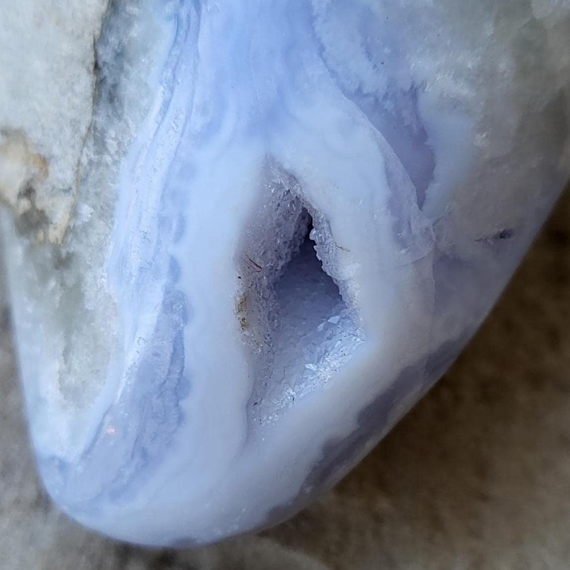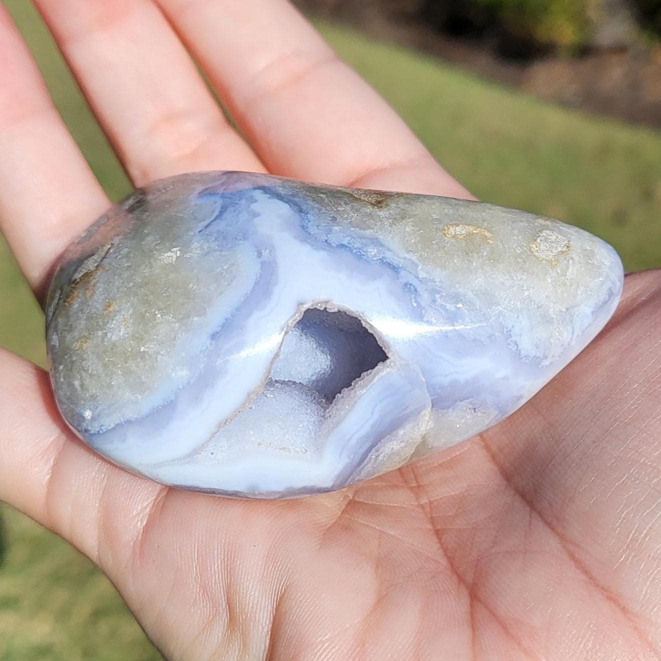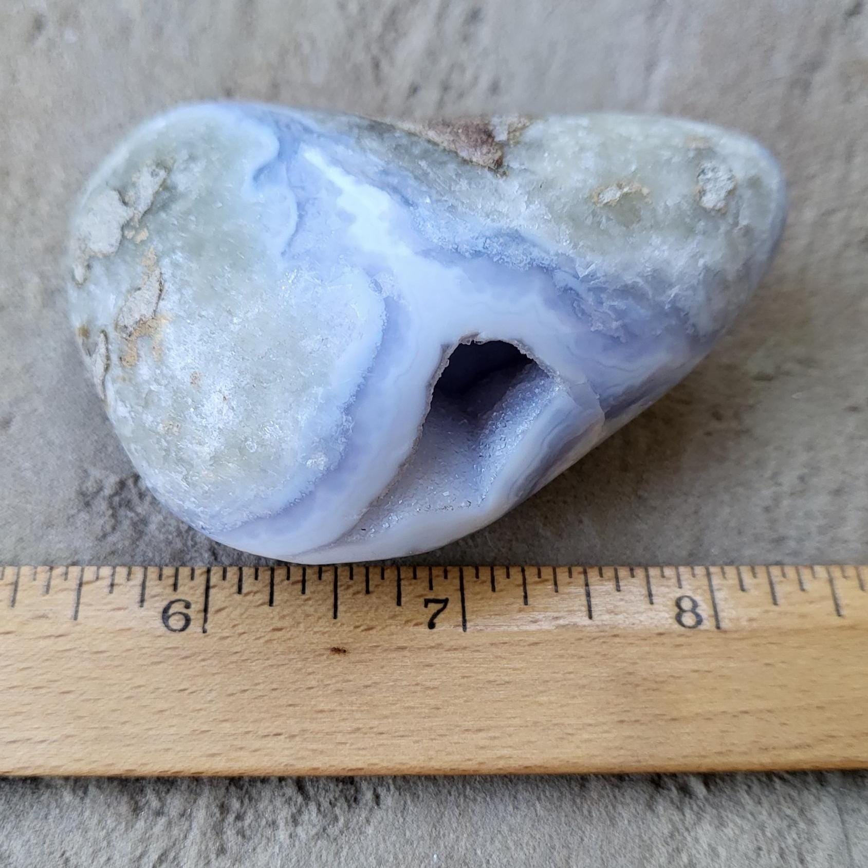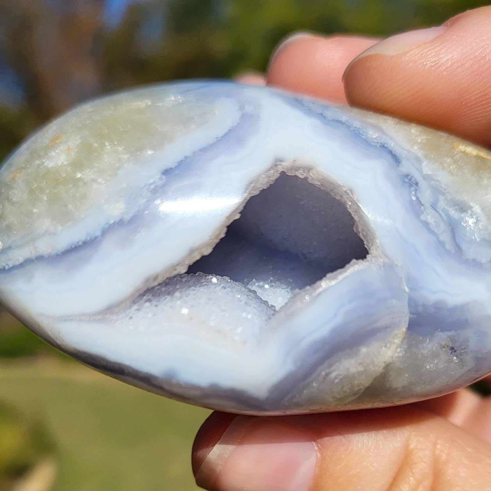 These blue lace agates are from Malawi, Africa. Blue lace agate is a highly sought-after variety of chalcedony, known for its delicate crystals, blue hue, and wavy patterns within the stone.