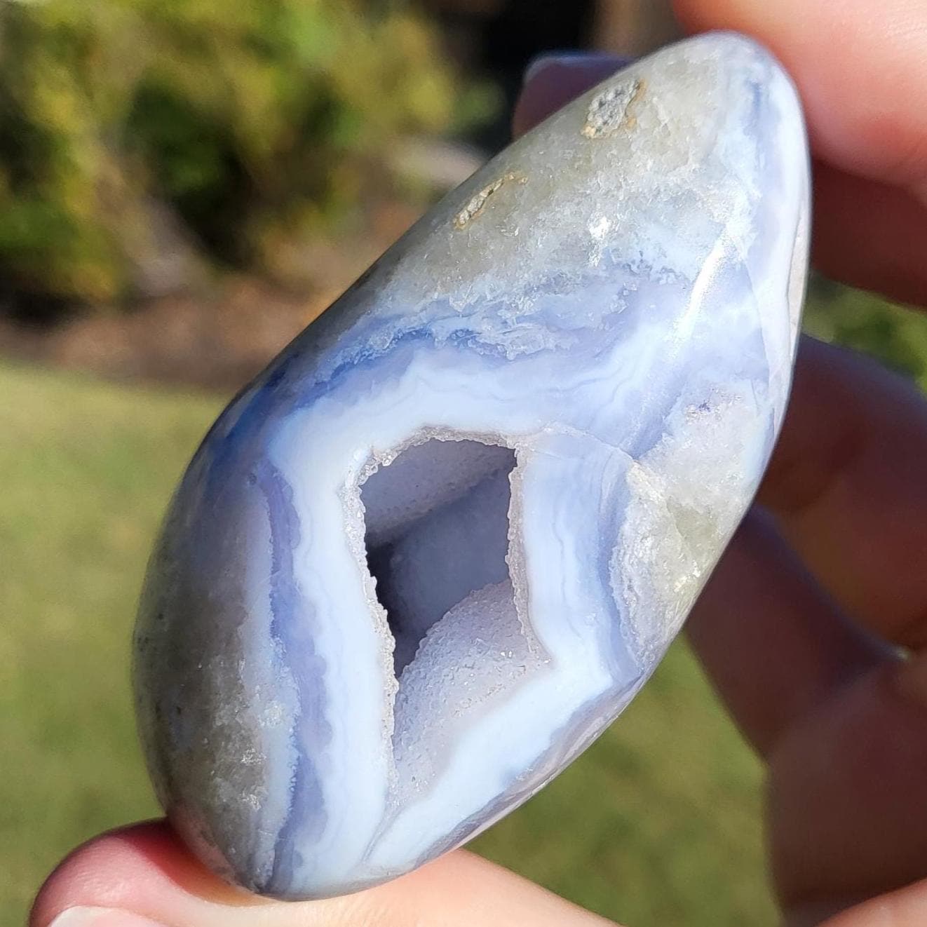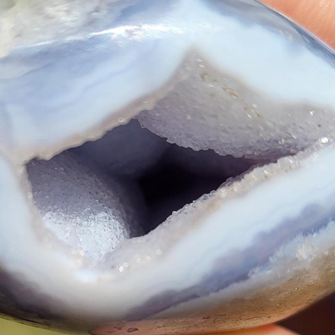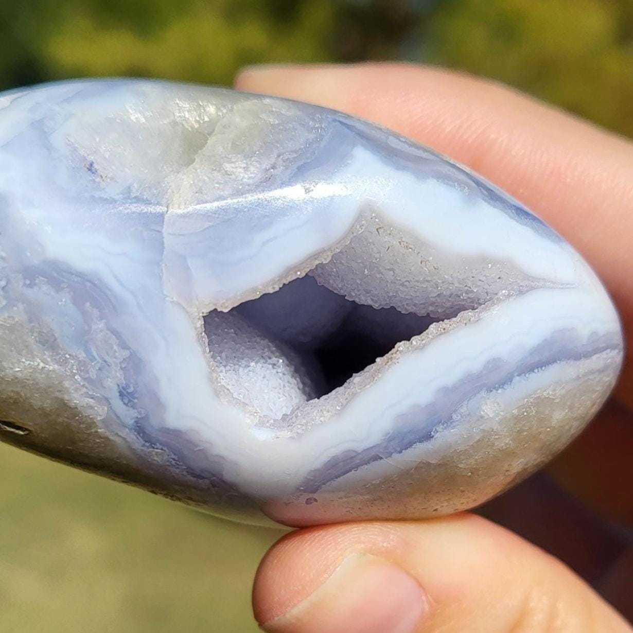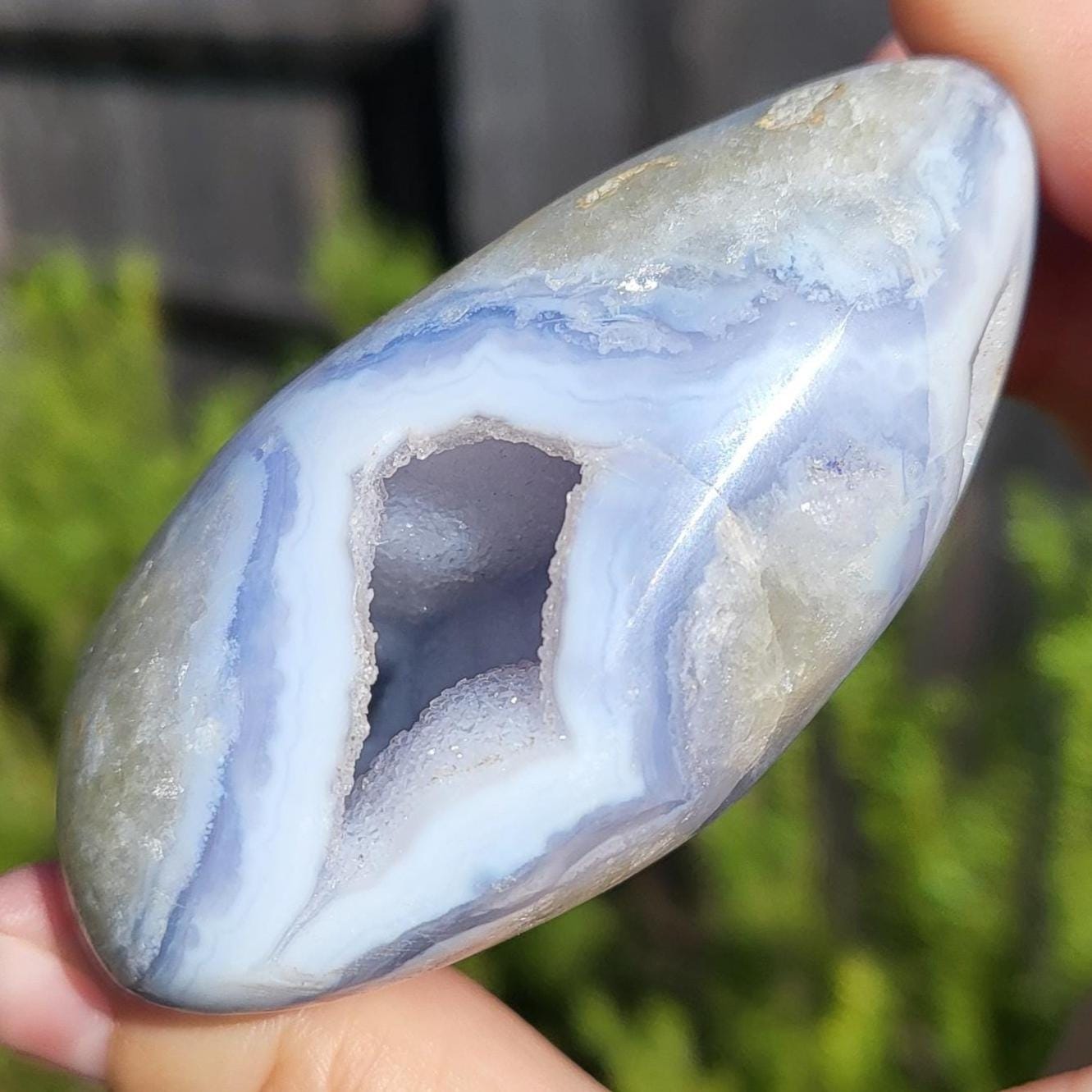 These blue lace agates are from Malawi, Africa. Blue lace agate is a highly sought-after variety of chalcedony, known for its delicate crystals, blue hue, and wavy patterns within the stone.