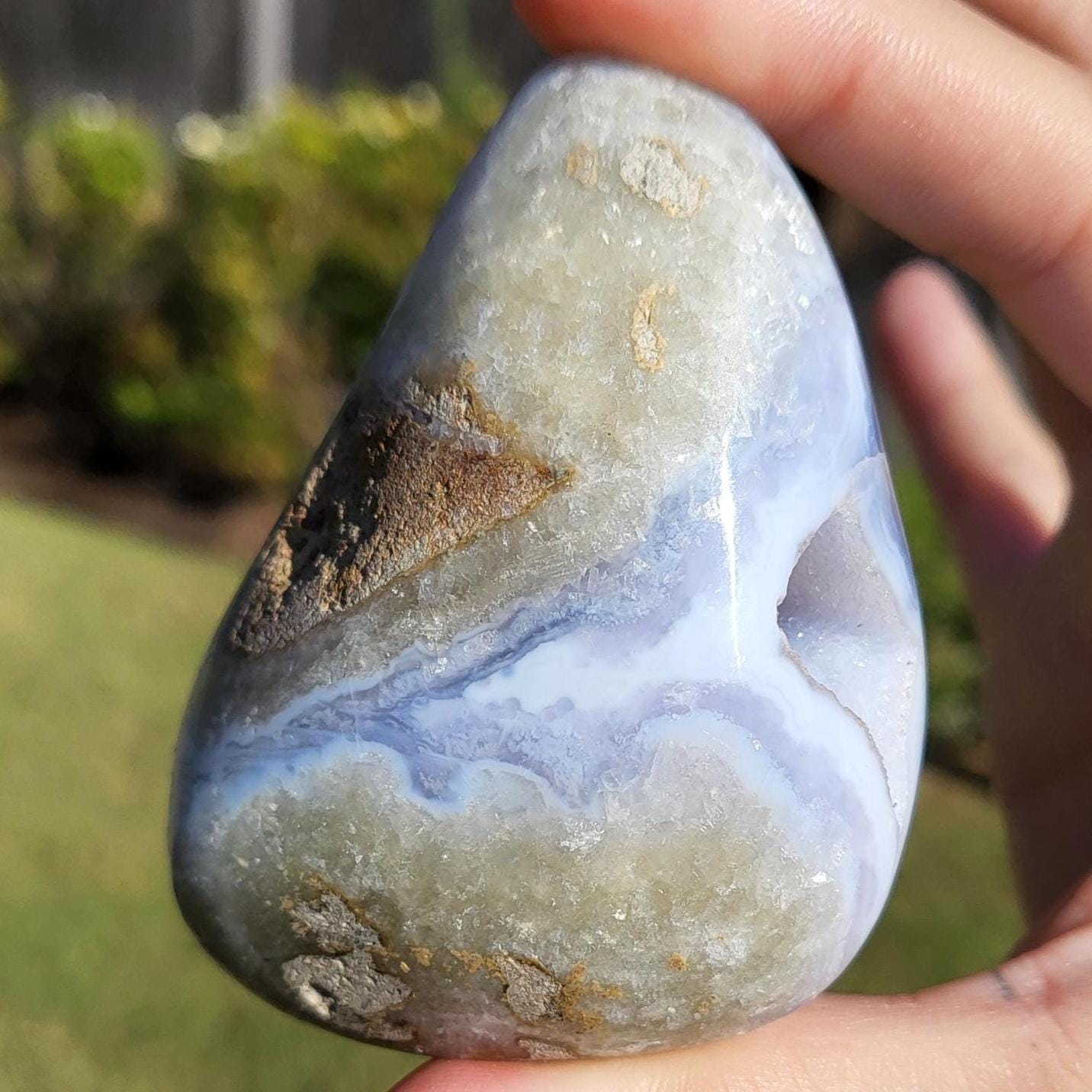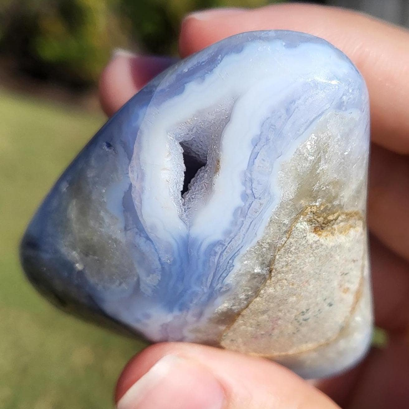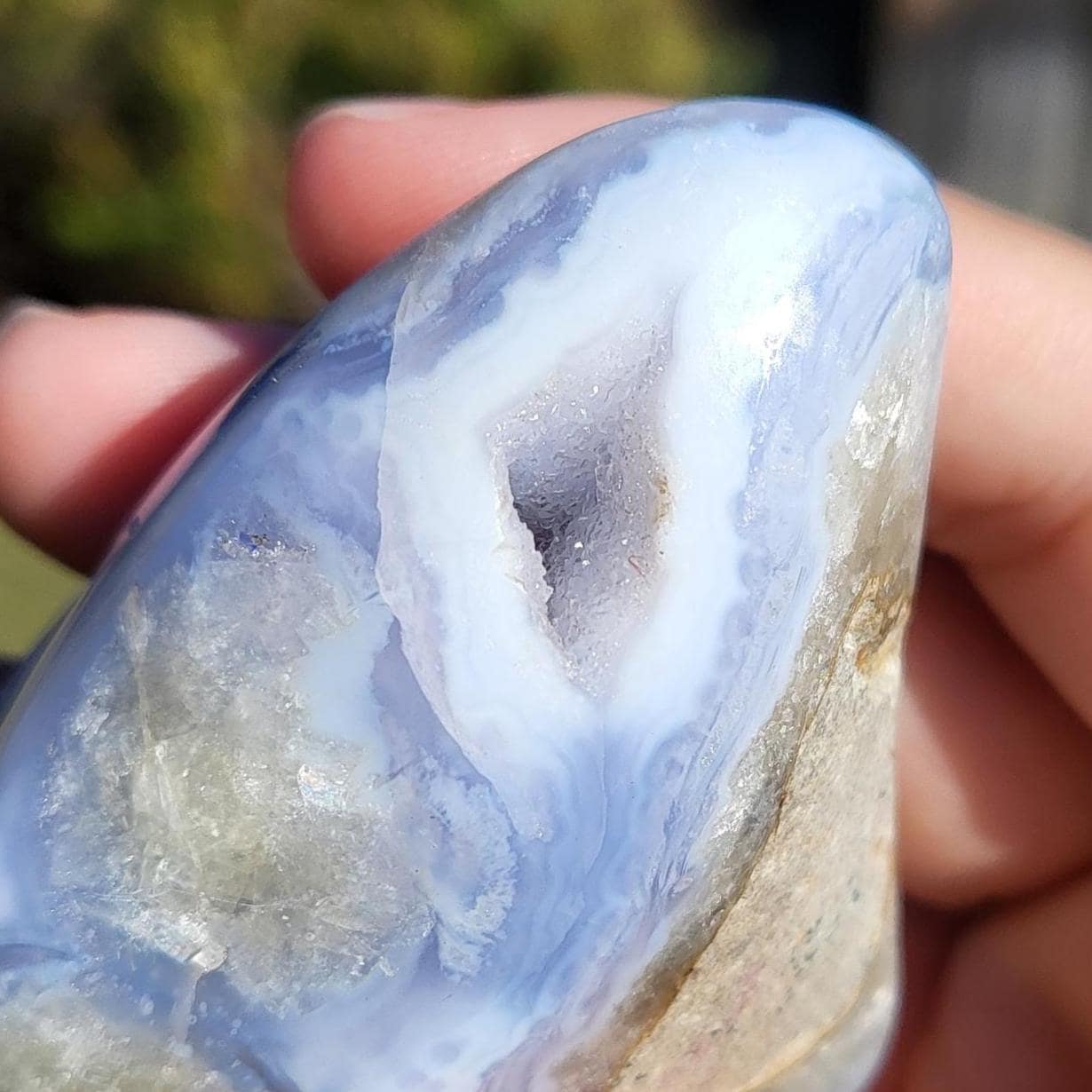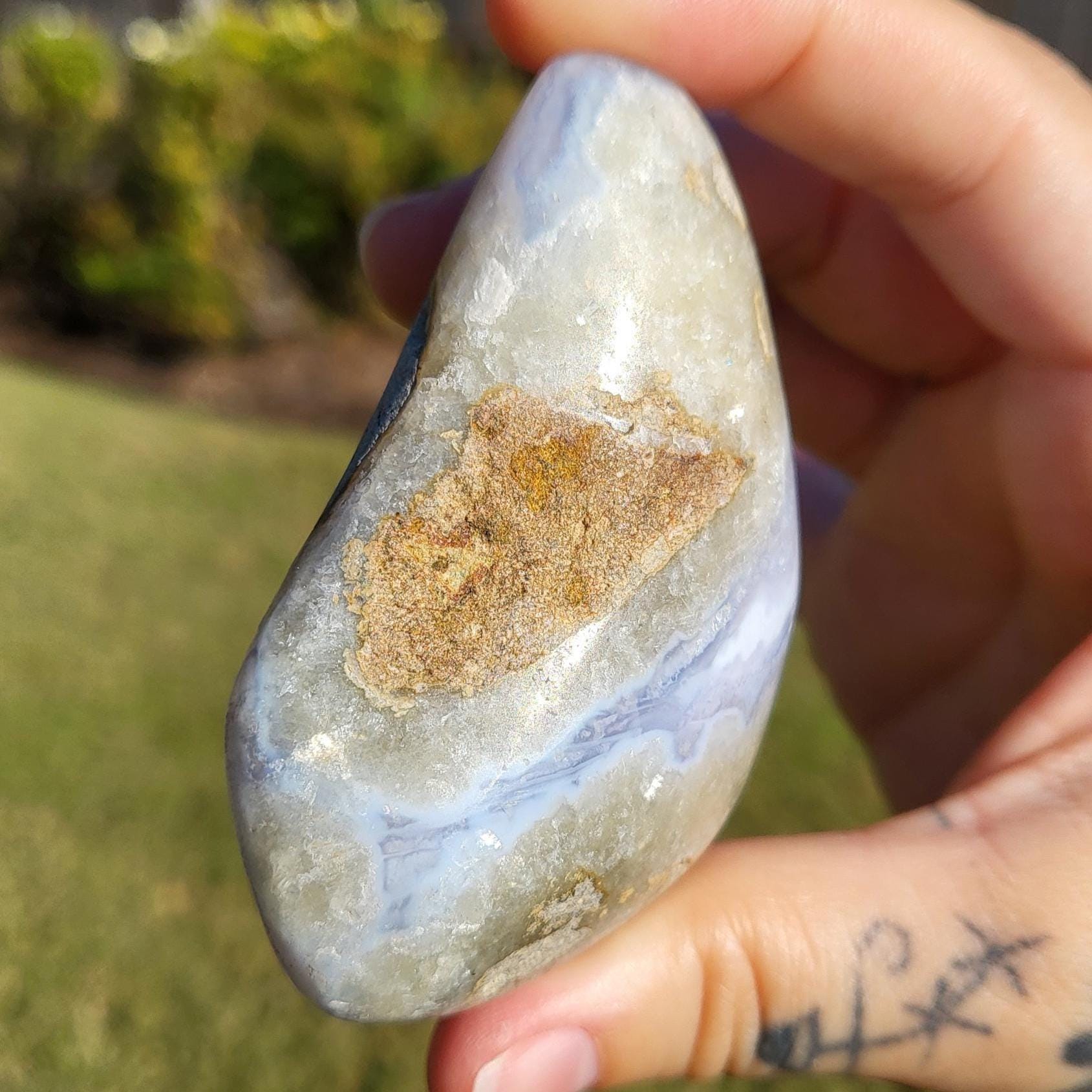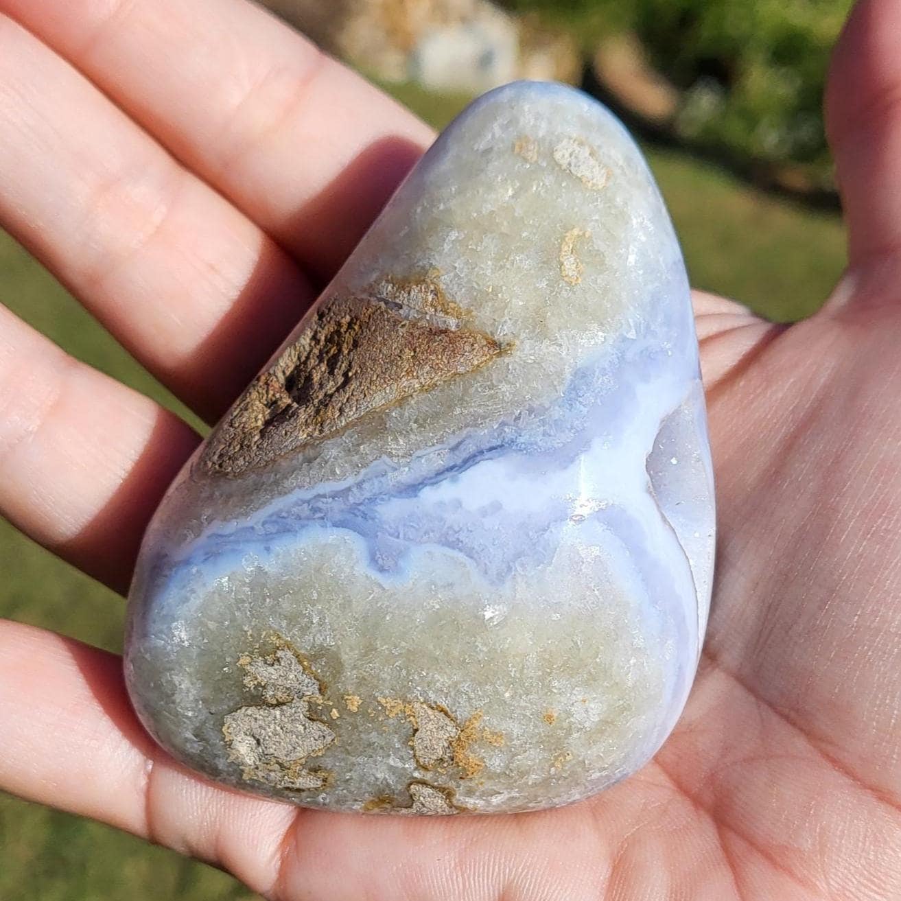These blue lace agates are from Malawi, Africa. Blue lace agate is a highly sought-after variety of chalcedony, known for its delicate crystals, blue hue, and wavy patterns within the stone.