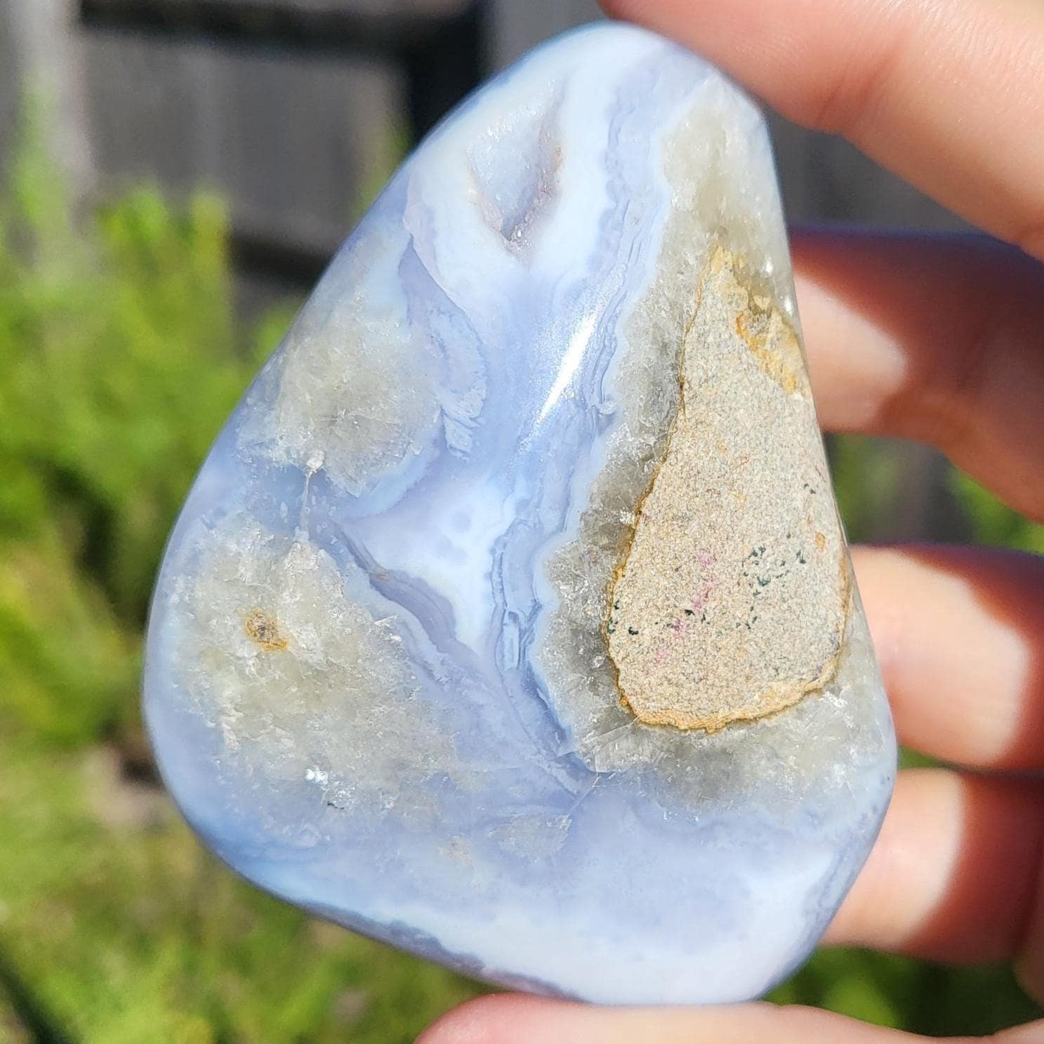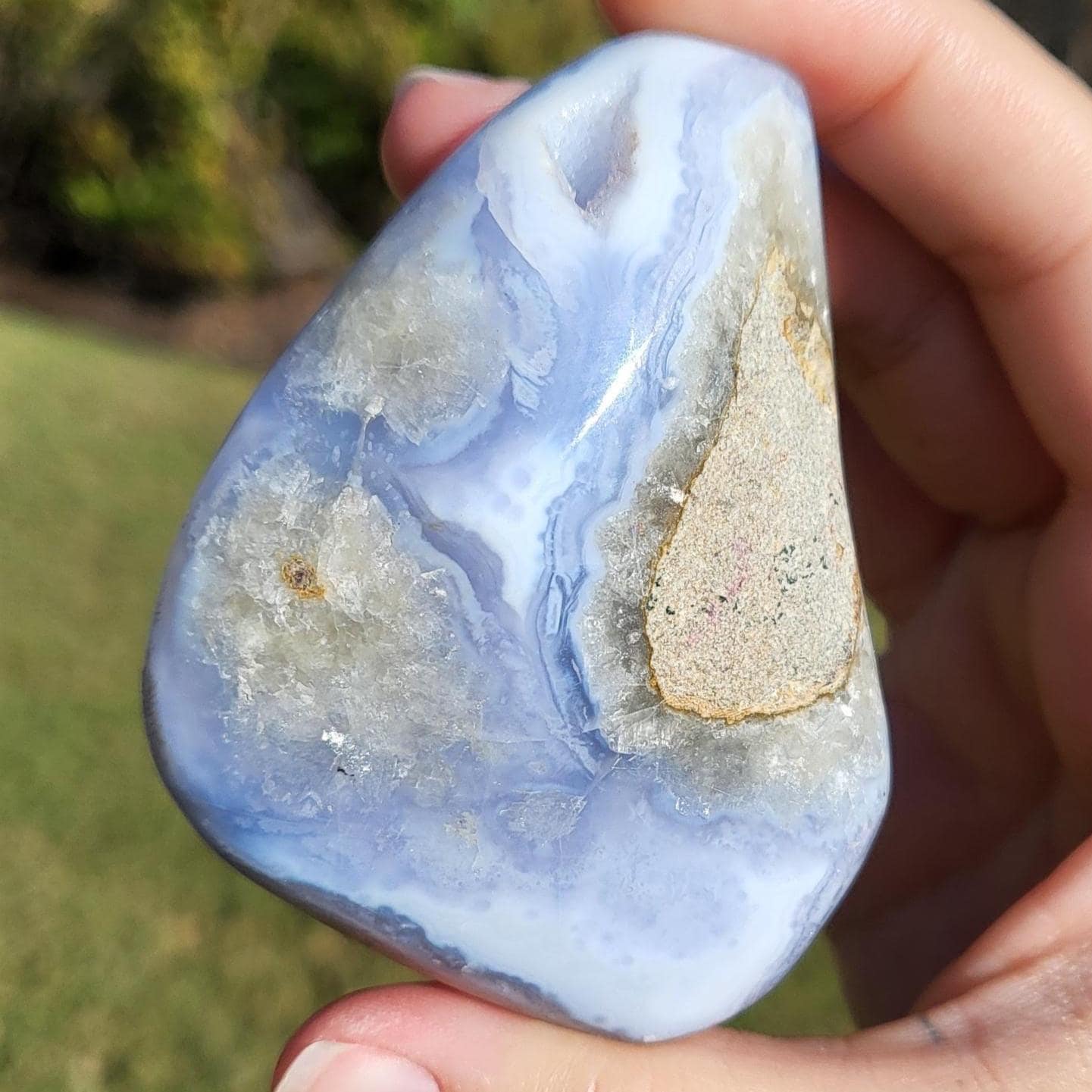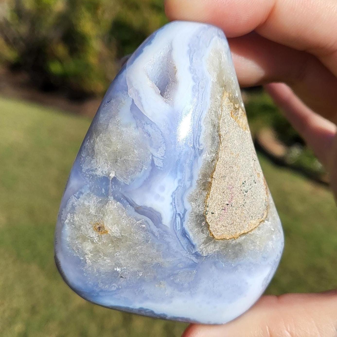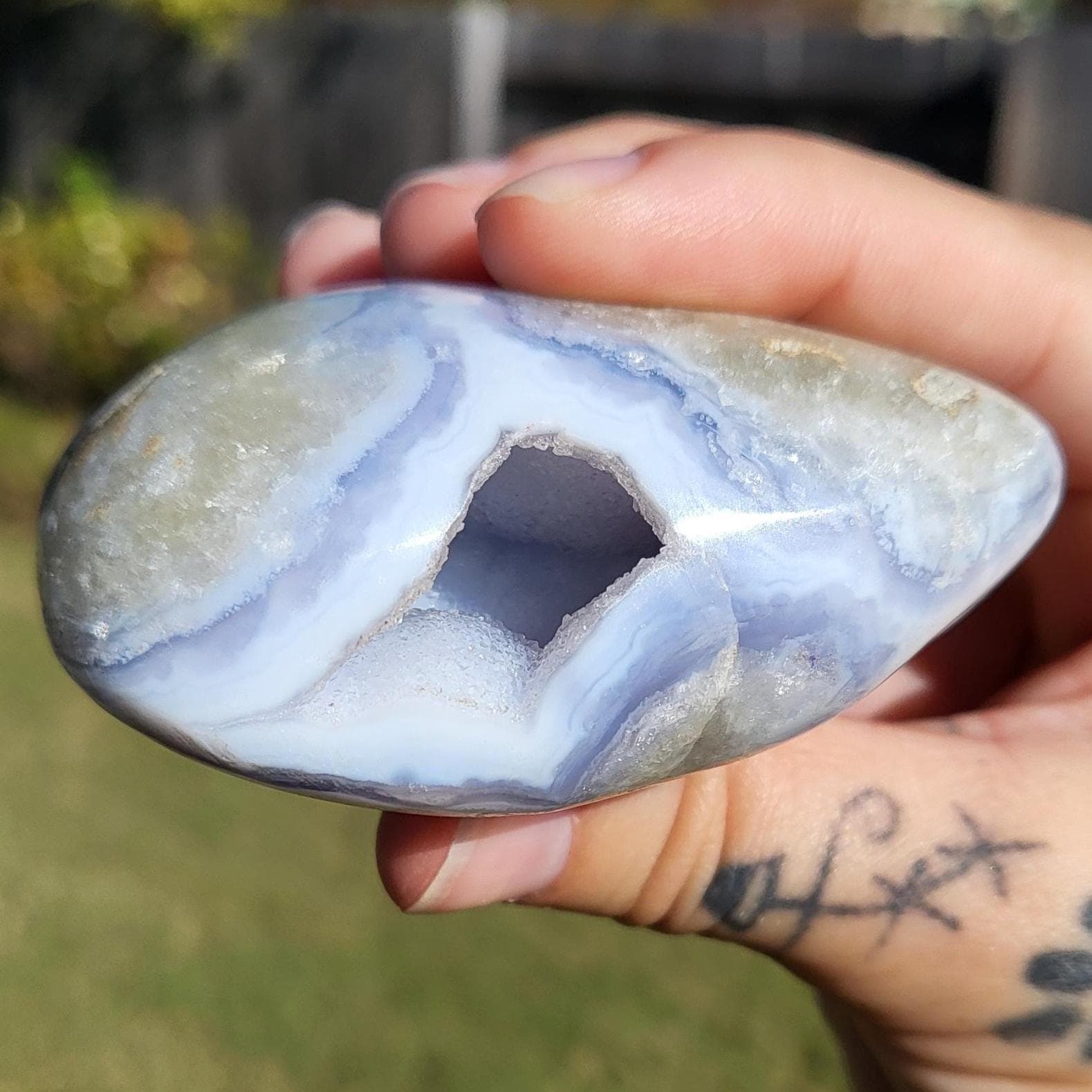 These blue lace agates are from Malawi, Africa. Blue lace agate is a highly sought-after variety of chalcedony, known for its delicate crystals, blue hue, and wavy patterns within the stone.