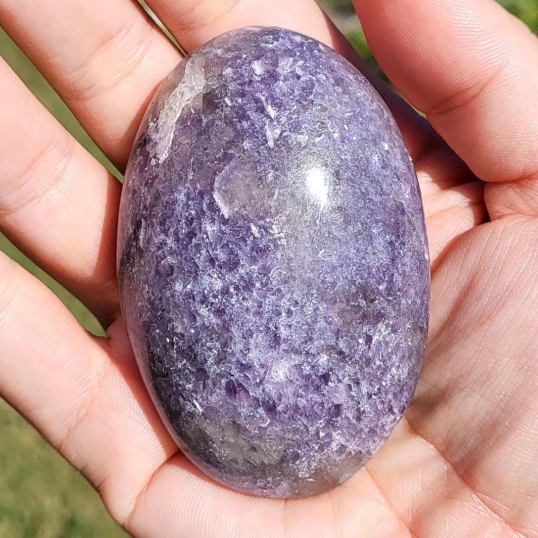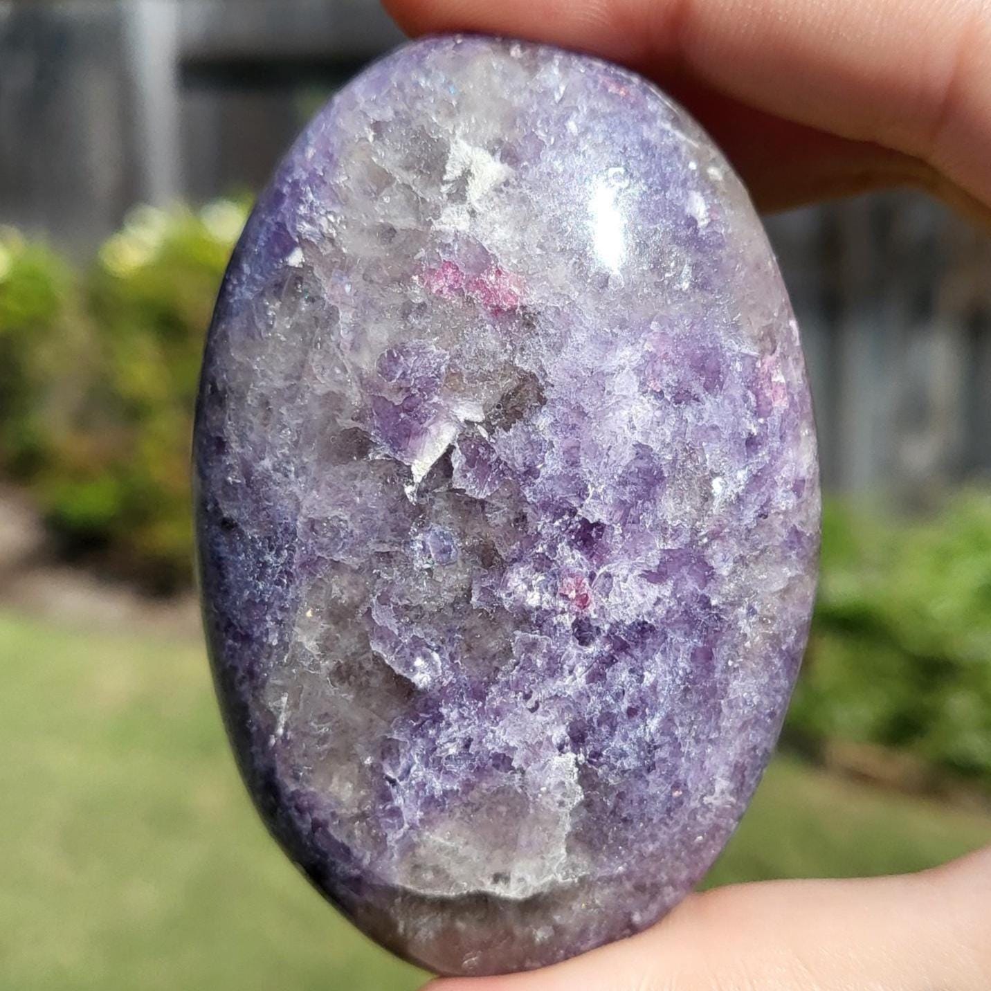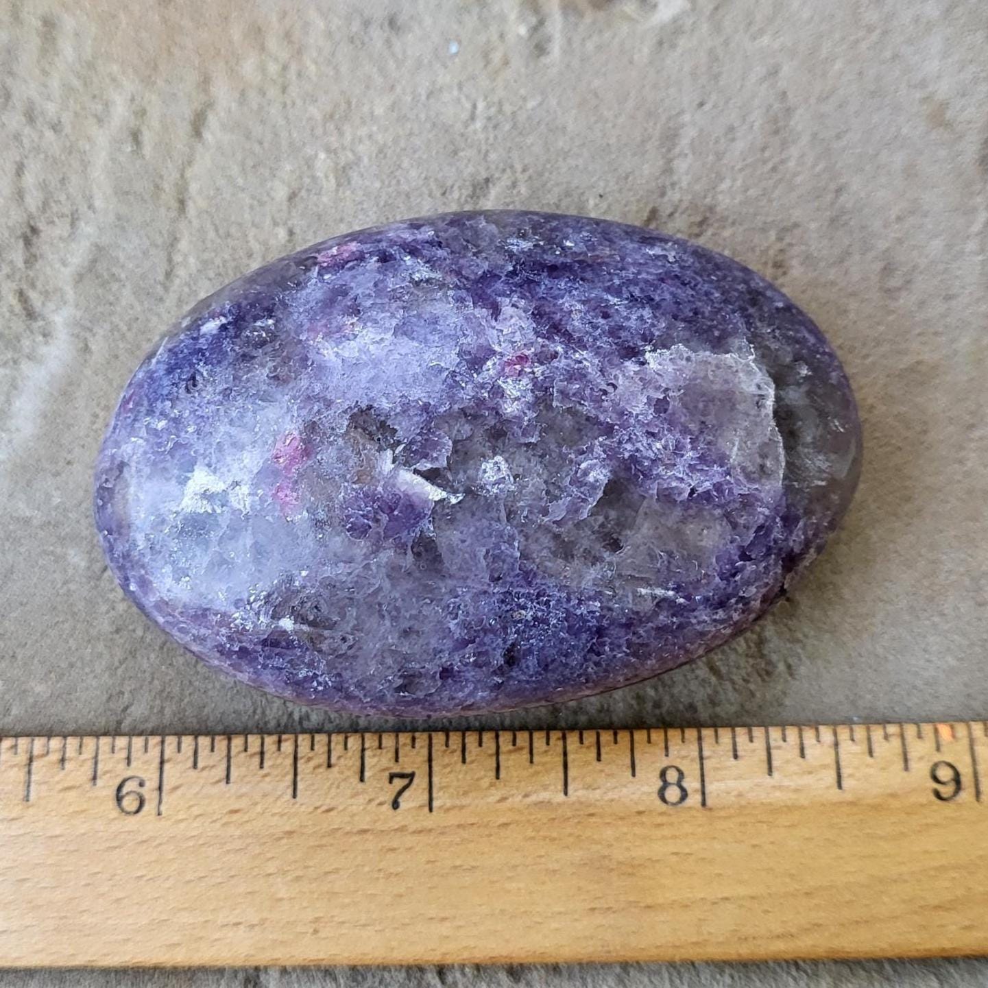 This listing is for the lovely XL lepidolite with pink tourmaline crystal palm stone shown in the photos above. This crystal is full of juicy purple lepidolite flecked with sparkling mica, and she has several spots of glittery pink tourmaline (rubellite). Pink tourmaline in lepidolite specimens is relatively rare, making this palm stone extra special. Measuring 2.5" in length, this palm stone has been polished smooth to showcase all of the beauty within. The energy that I get from this crystal is peaceful, abundant, and stable. She would be excellent as a daily crystal companion, for meditation, magical workings, or placed anywhere within your home or sacred space to project her wonderful energy.