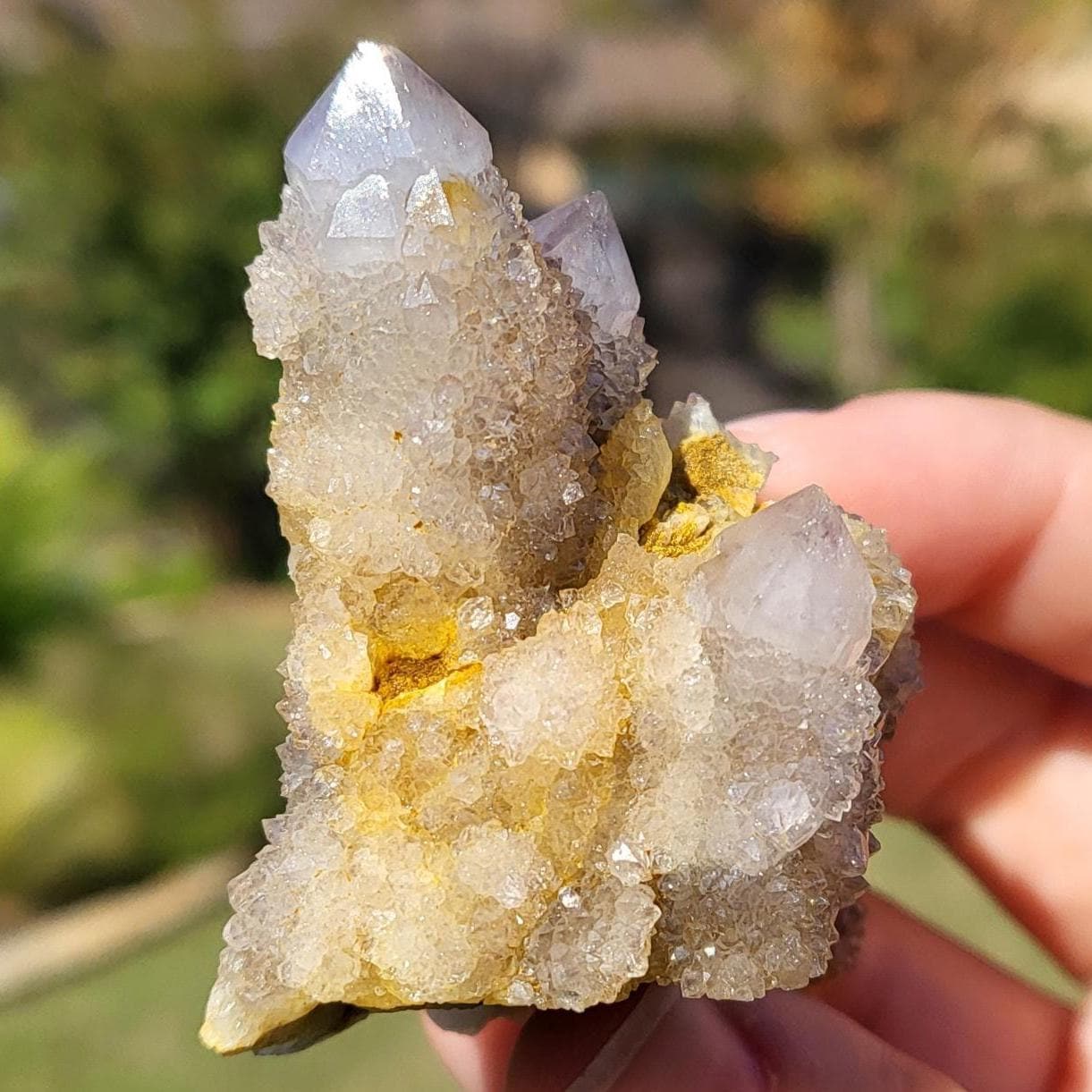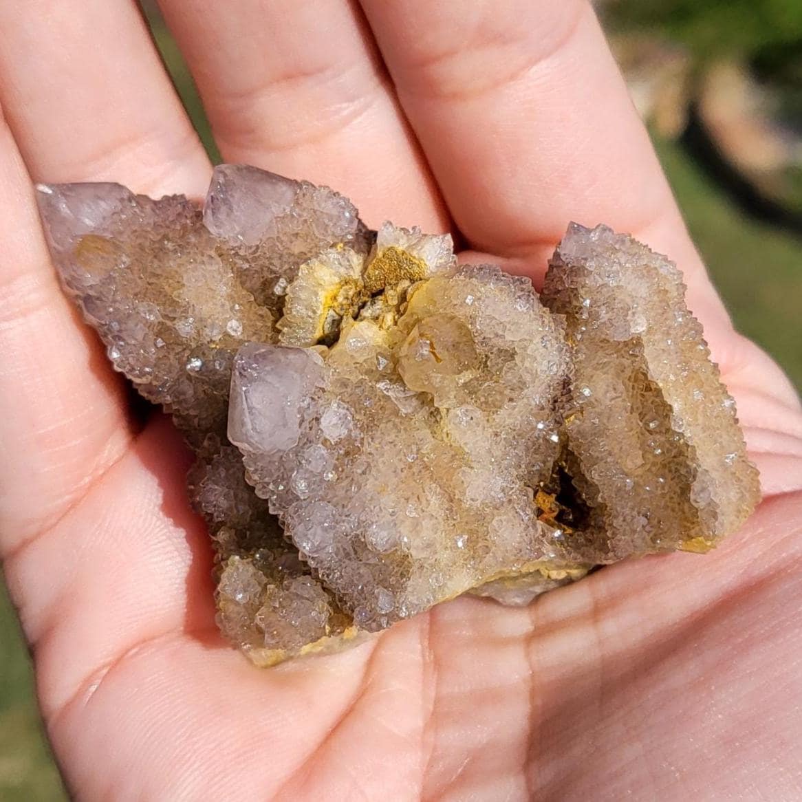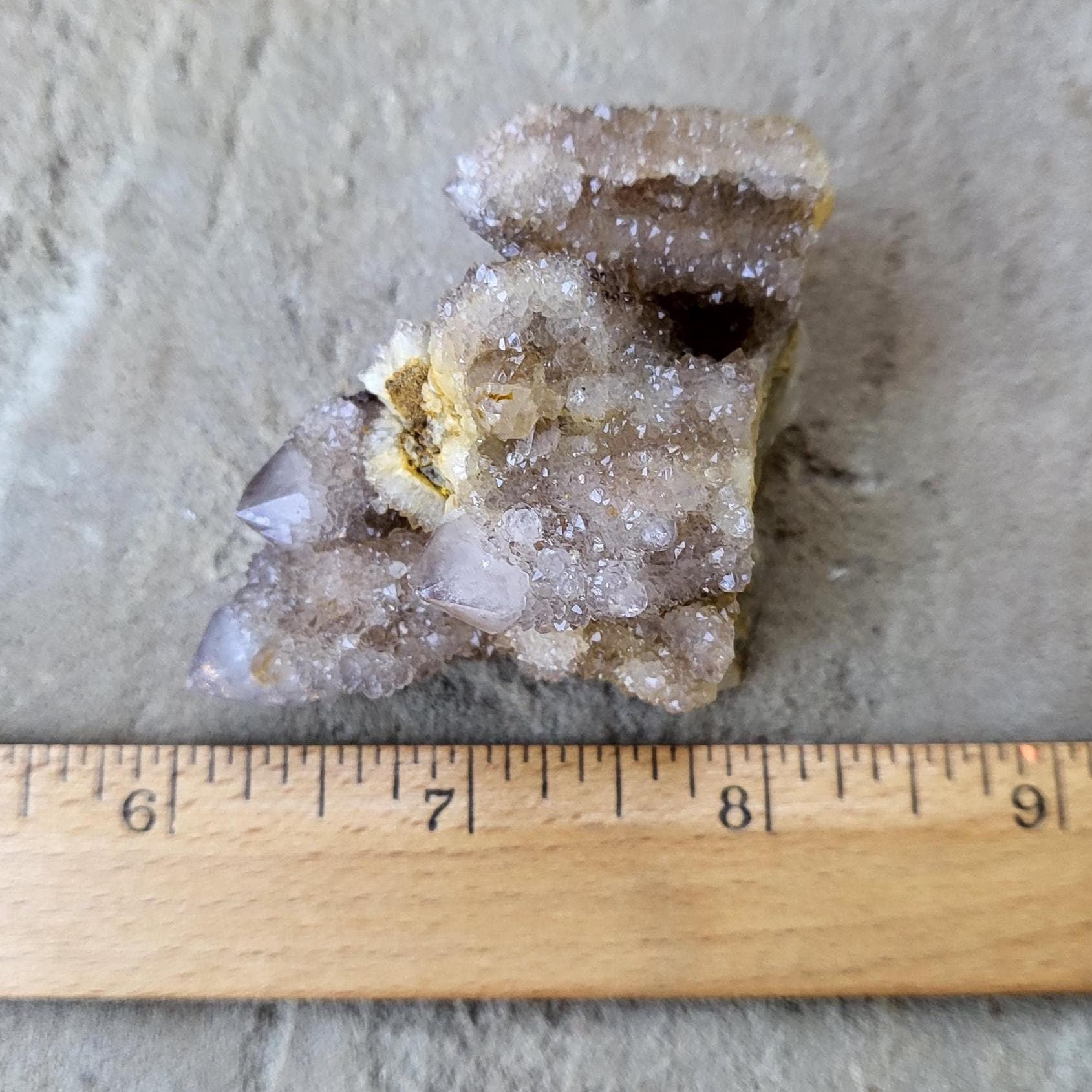 This listing is for the sparkly little ametrine spirit quartz crystal cluster shown in the photos above. Measuring approximately 2" in length and 2" high, this crystal has several main points that are filled with tiny, glittery crystals cascading off of them. This cluster is a beautiful lavender amethyst with gorgeous gold spots of citrine coloring. Only about 15% of all spirit quartz found has amethyst/ametrine coloring, making this little cluster extra special. She is so sparkly that photos and videos don't even do her justice. She would be excellent as a meditation or magical working companion, on an altar or sacred space, or placed anywhere in your home to project her magical energy.