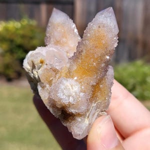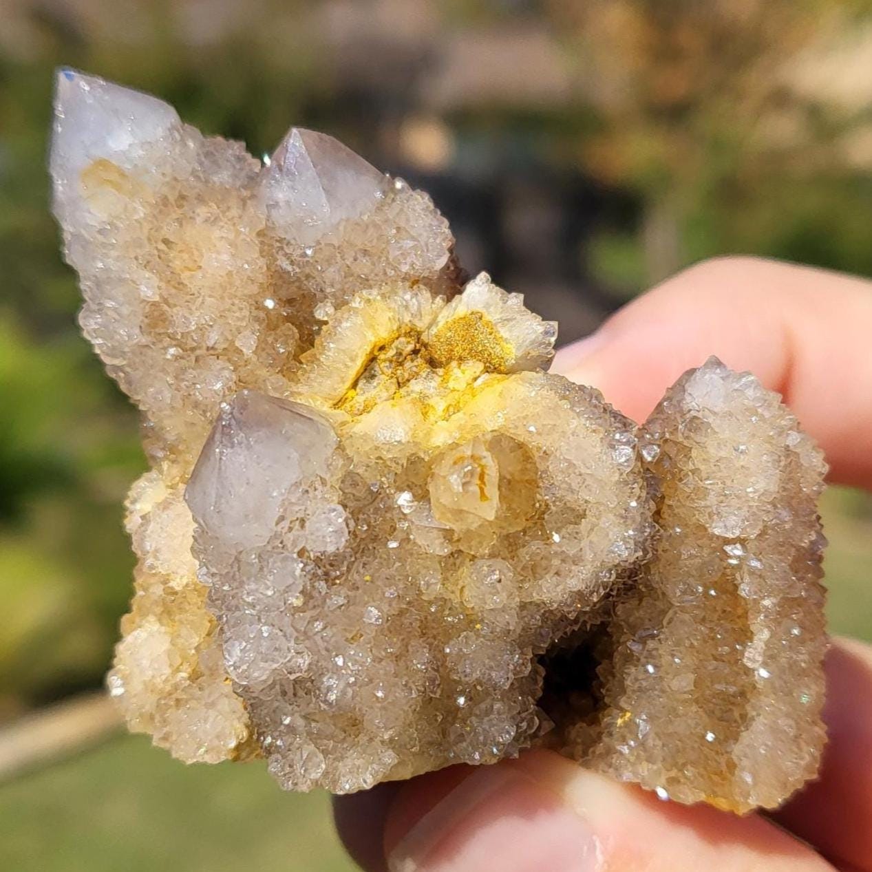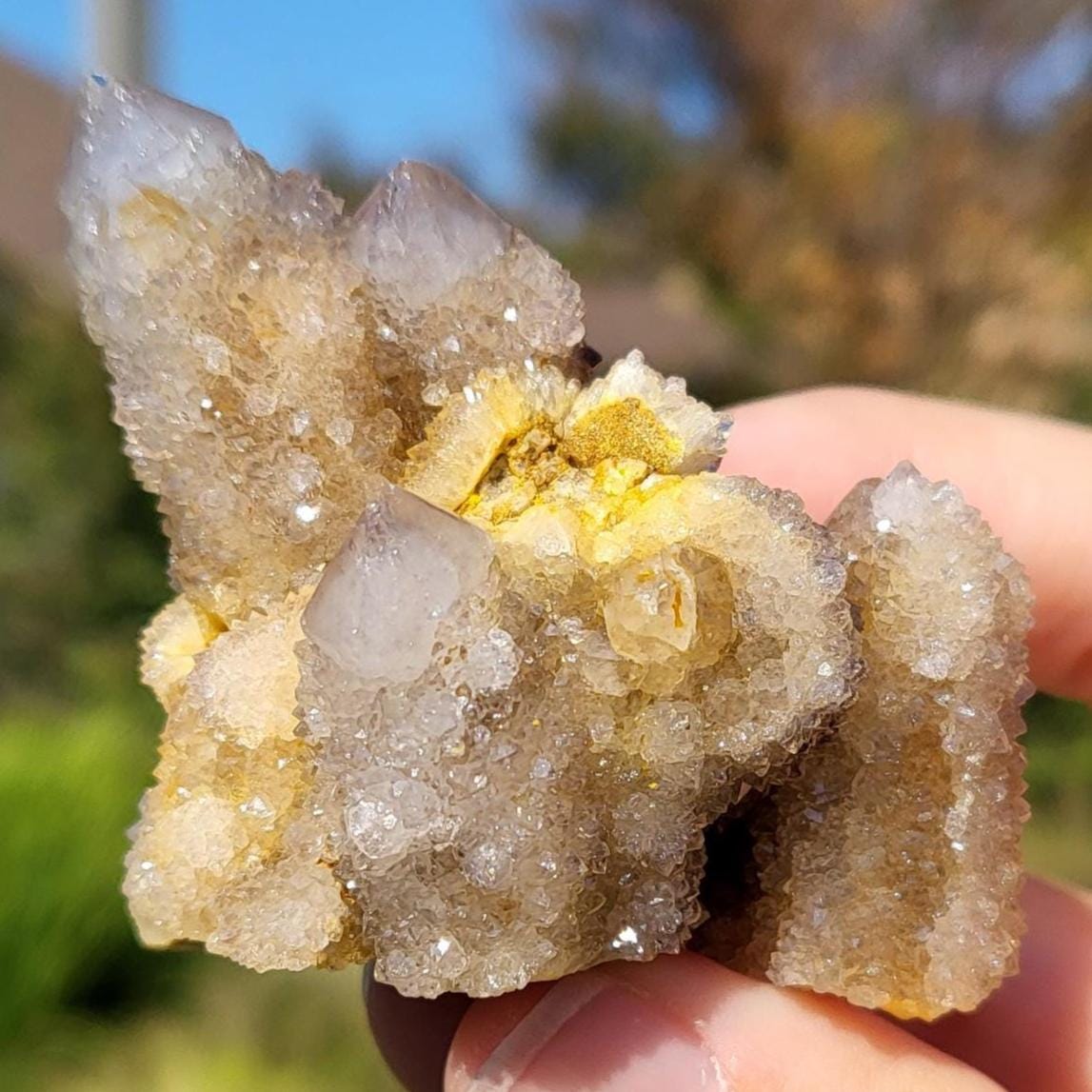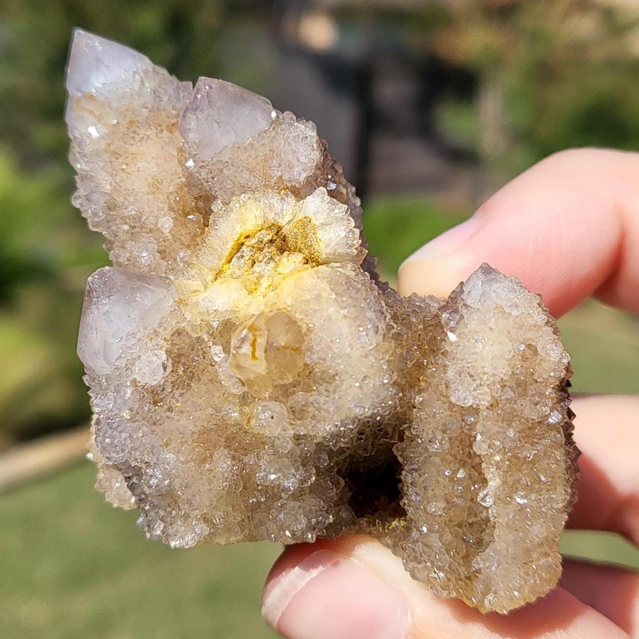This listing is for the sparkly little ametrine spirit quartz crystal cluster shown in the photos above. Measuring approximately 2" in length and 2" high, this crystal has several main points that are filled with tiny, glittery crystals cascading off of them. This cluster is a beautiful lavender amethyst with gorgeous gold spots of citrine coloring. Only about 15% of all spirit quartz found has amethyst/ametrine coloring, making this little cluster extra special. She is so sparkly that photos and videos don't even do her justice. She would be excellent as a meditation or magical working companion, on an altar or sacred space, or placed anywhere in your home to project her magical energy.