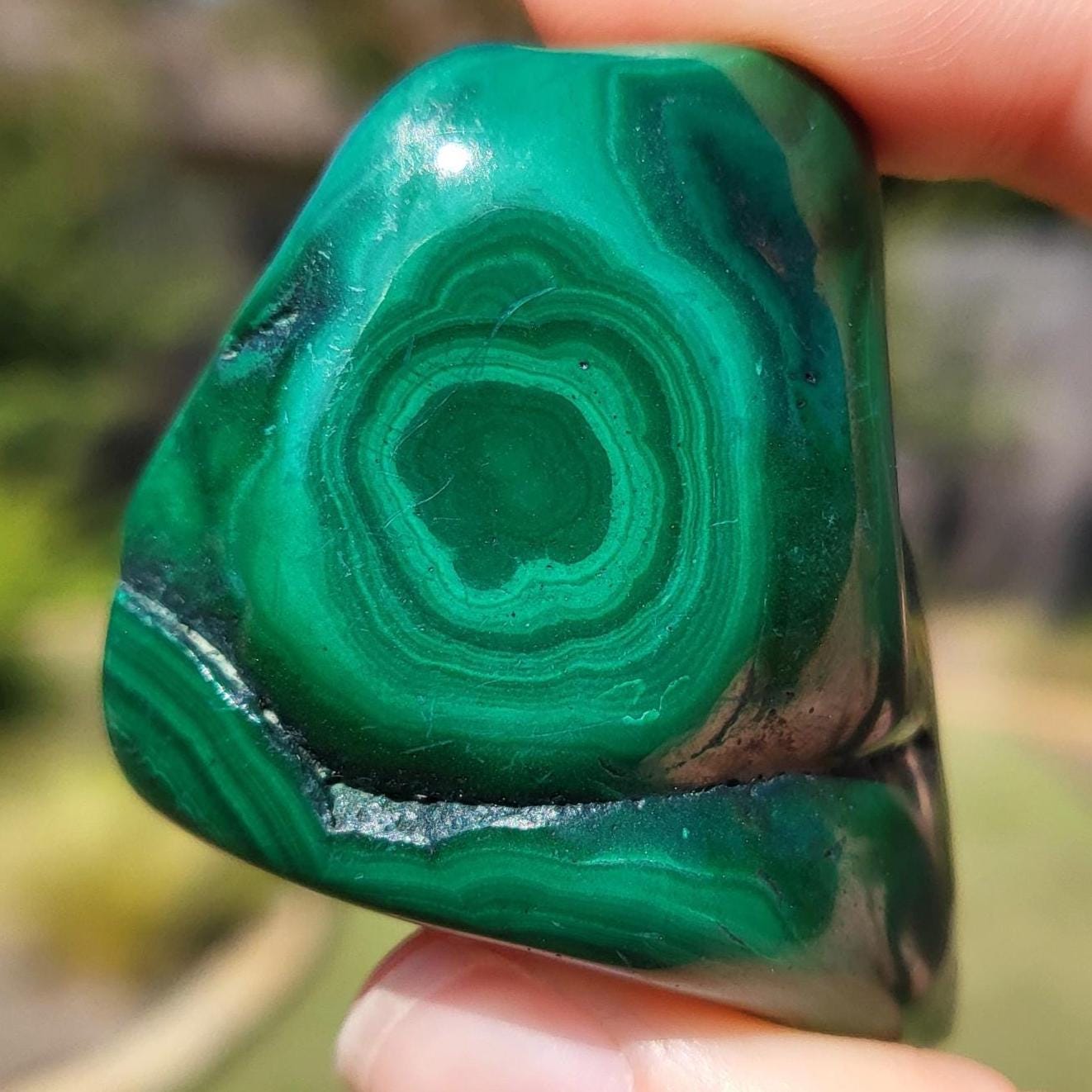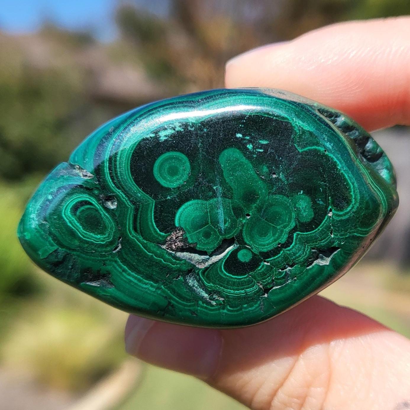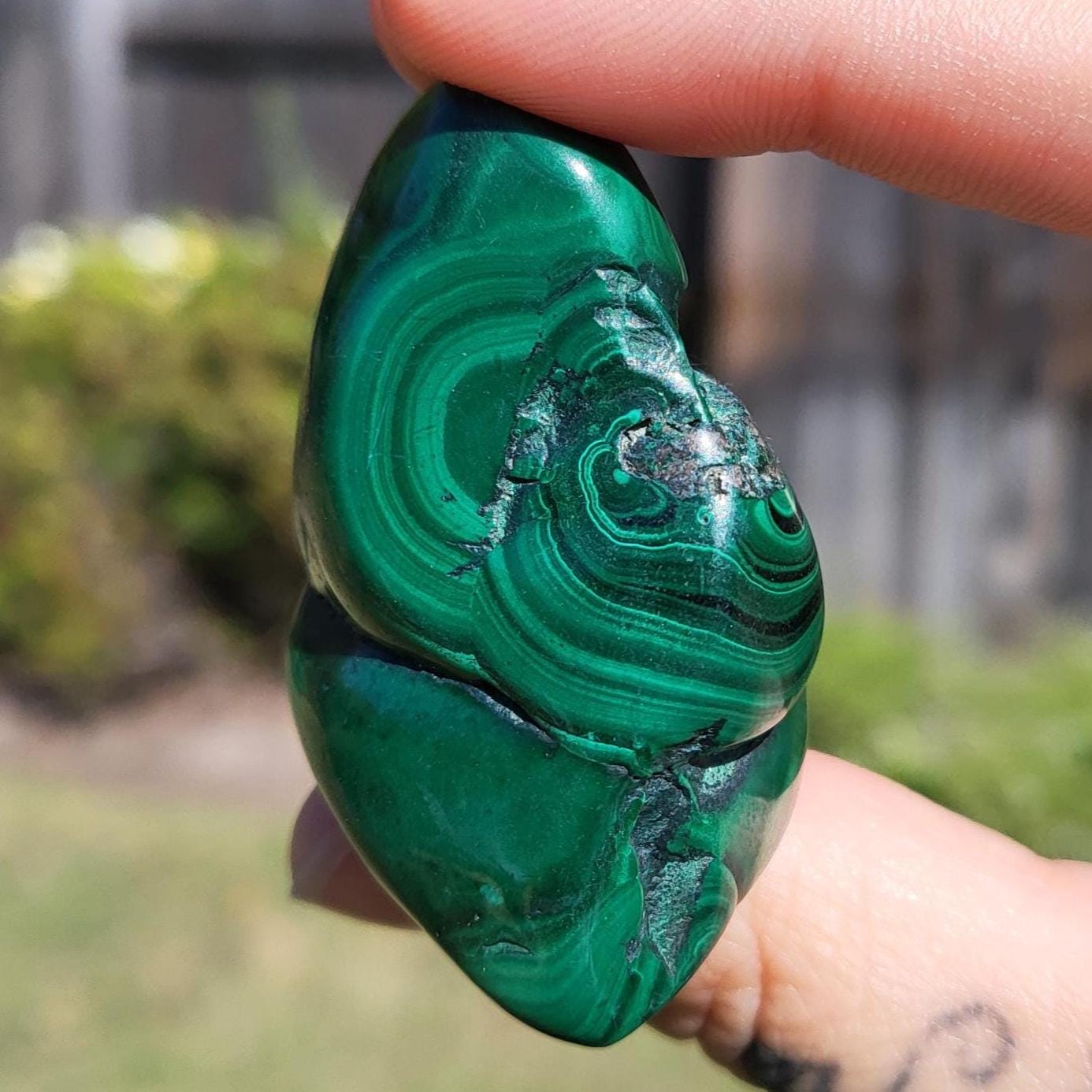 This listing is for the lovely green malachite freeform polished crystal shown in the photos above. The color in this crystal is such a vibrant green, filled with swirls, circles and little caverns. This crystal is 100% real, natural and created by Mama Earth! Measuring approximately 2 inches at her longest point, I love the patterns in this malachite so much! The energy that I get from this crystal is pure magic. She would be perfect as a meditation or daily crystal companion, as a working companion for transformation or nature magic, or placed anywhere in your space to project her beautiful energy.