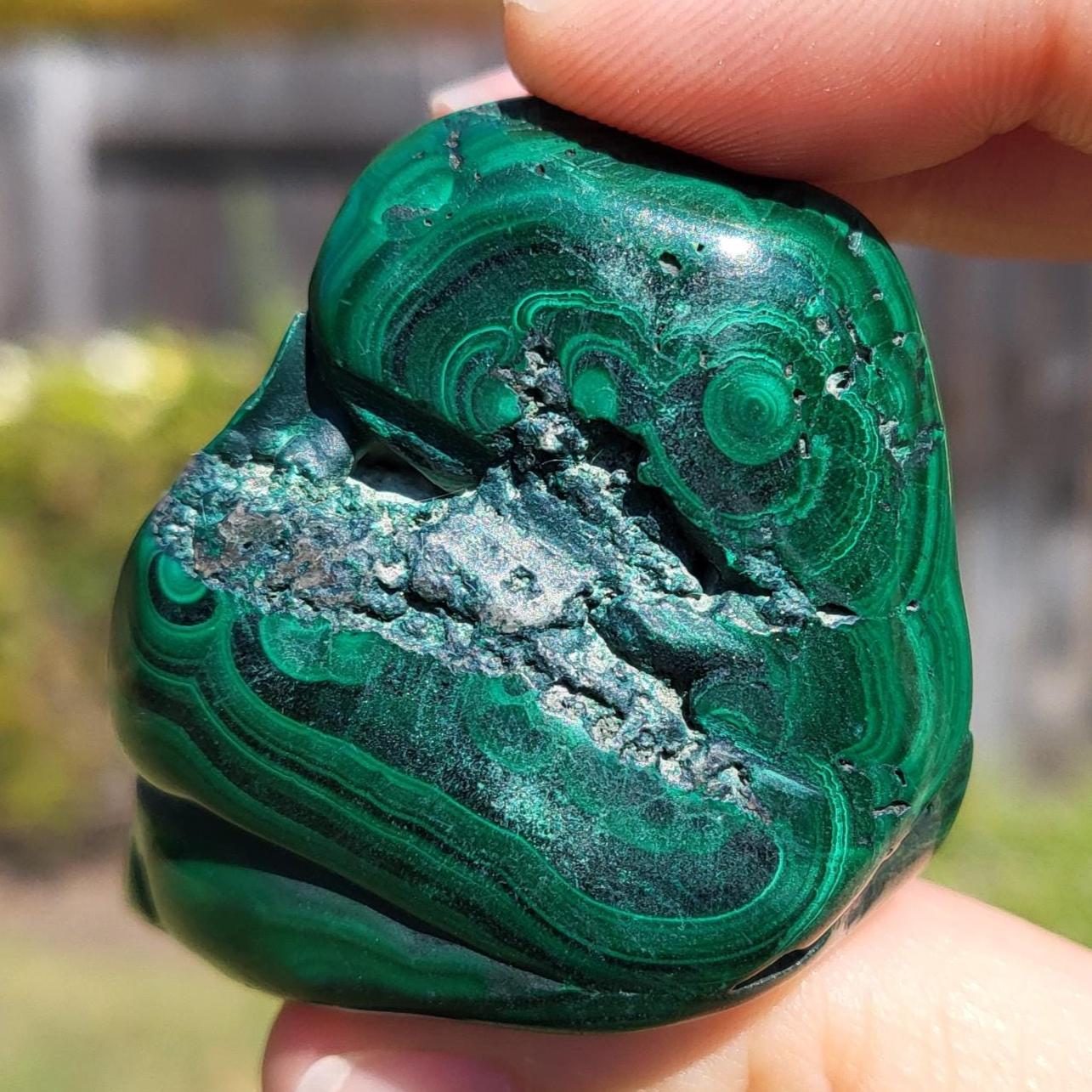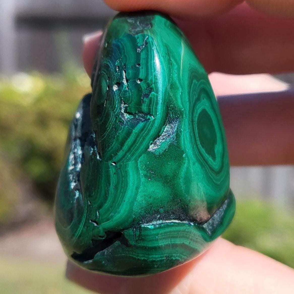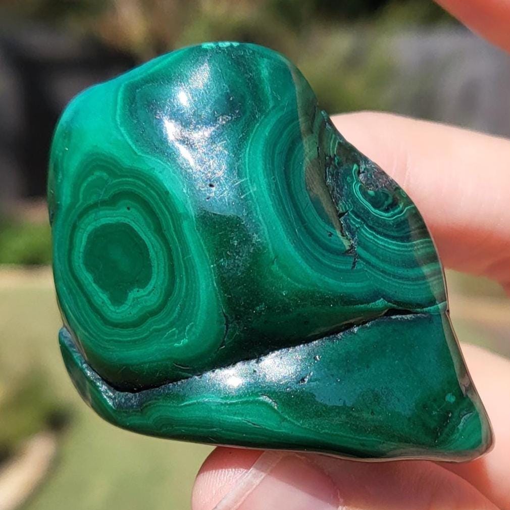 This listing is for the lovely green malachite freeform polished crystal shown in the photos above. The color in this crystal is such a vibrant green, filled with swirls, circles and little caverns. This crystal is 100% real, natural and created by Mama Earth! Measuring approximately 2 inches at her longest point, I love the patterns in this malachite so much! The energy that I get from this crystal is pure magic. She would be perfect as a meditation or daily crystal companion, as a working companion for transformation or nature magic, or placed anywhere in your space to project her beautiful energy.