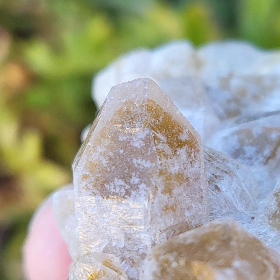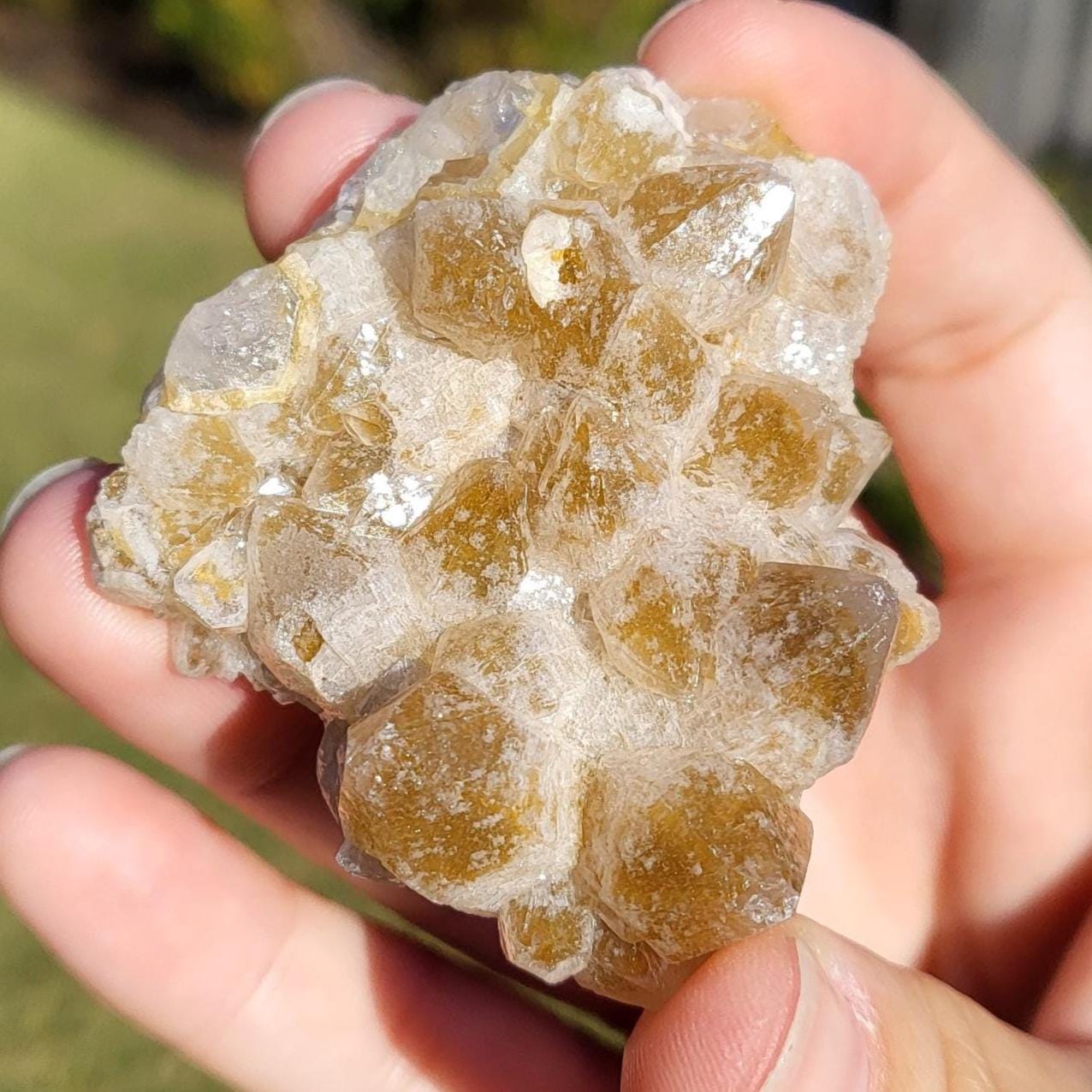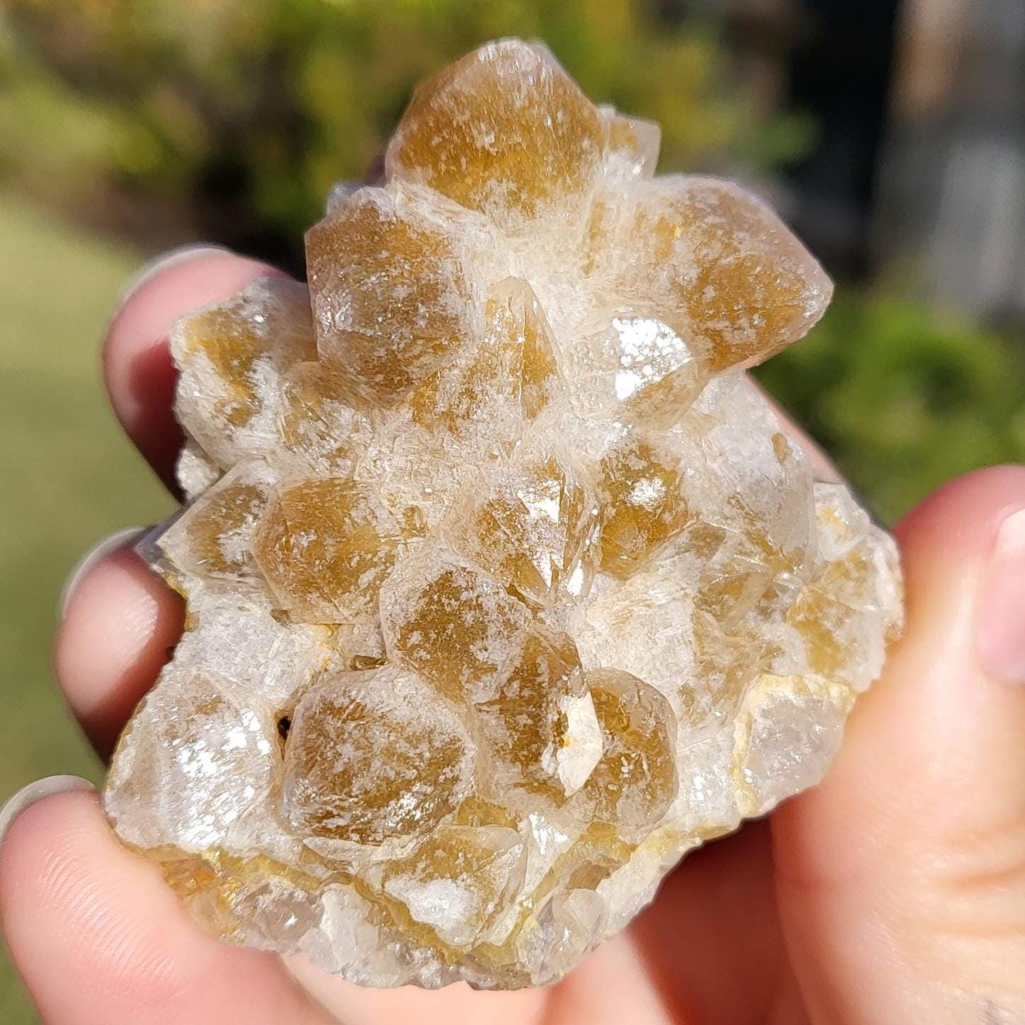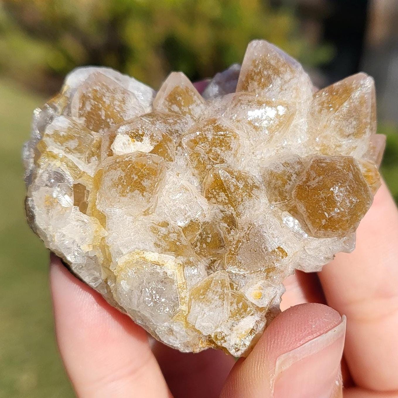 This listing is for the honeycomb matrix gold limonite phantom / golden healer quartz crystal cluster shown in the photos above. Measuring approximately 2" at his longest point, this cluster is such a rich, beautiful honey color!! He has beautiful examples of limonite's honeycomb matrix, and there are several clear phantoms that can be seen within the main points. There are even deep gold crystal points growing inside the caves made from the honeycomb matrix! The shine on these crystals makes them look like they are covered in beeswax in some lights. This crystal is 100% natural and created by Mother Earth. The energy that I get from this crystal is very productive and growth-oriented. He would be excellent as part of a crystal grid, as a crystal companion for meditation or magical workings, or placed anywhere within your home to project his beautiful energy.