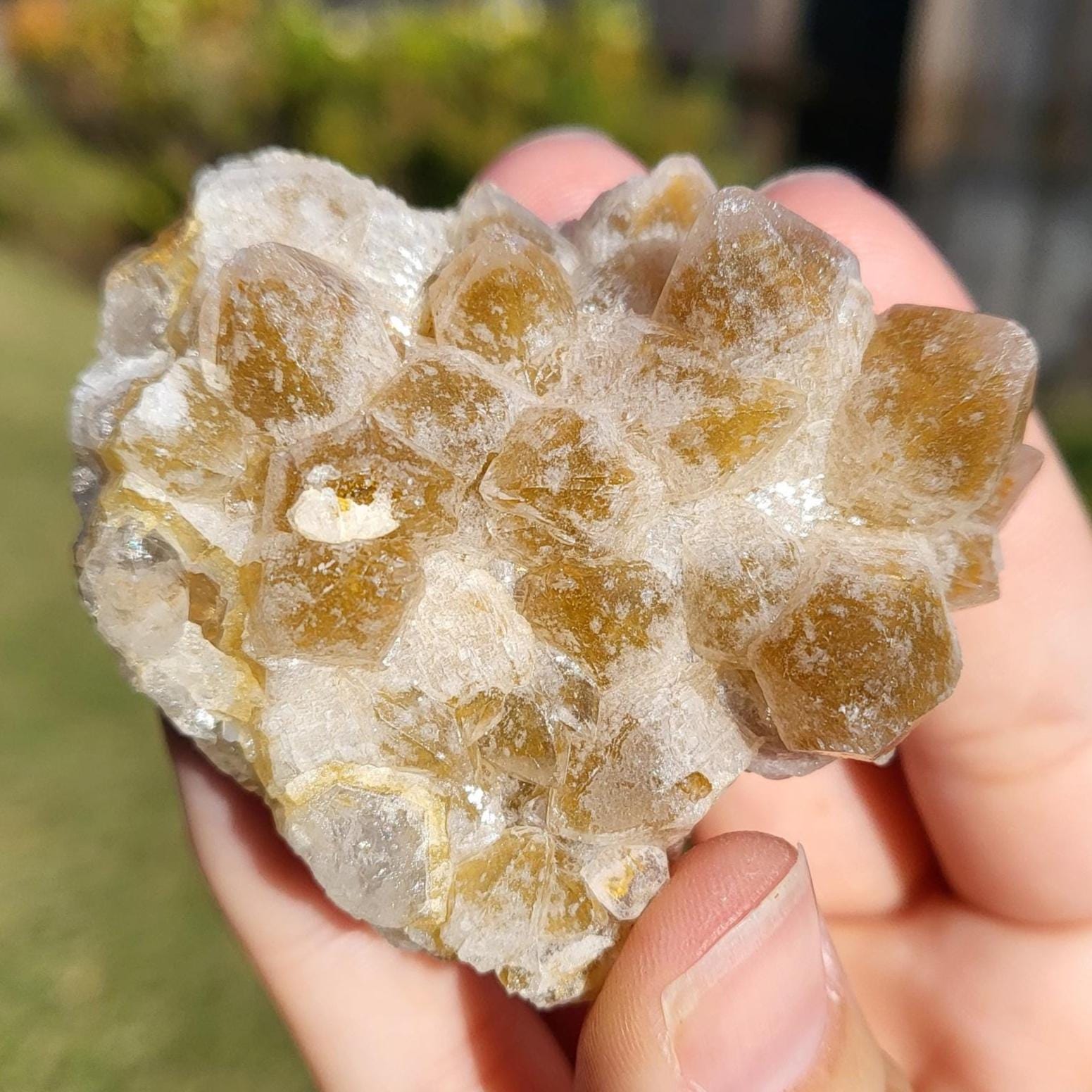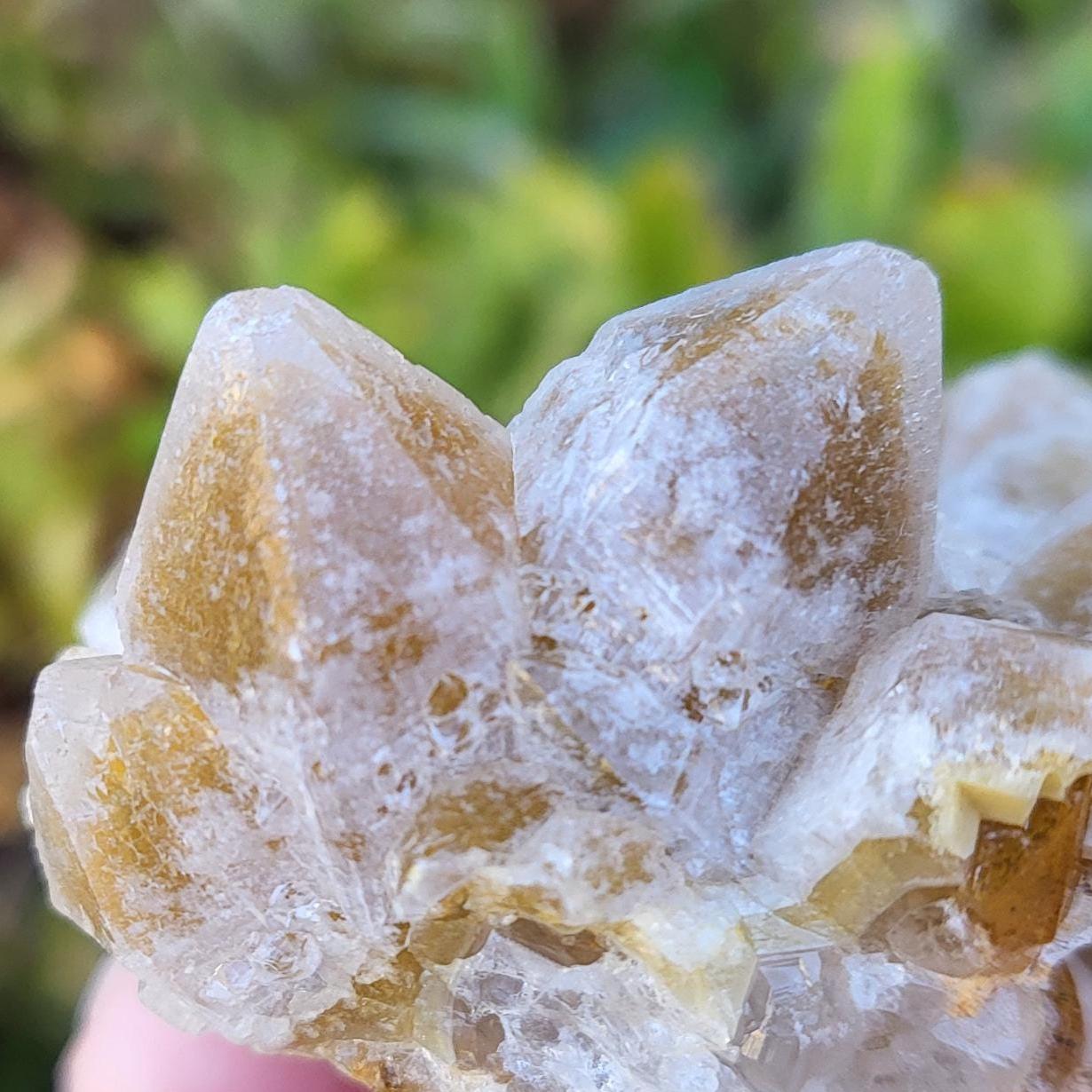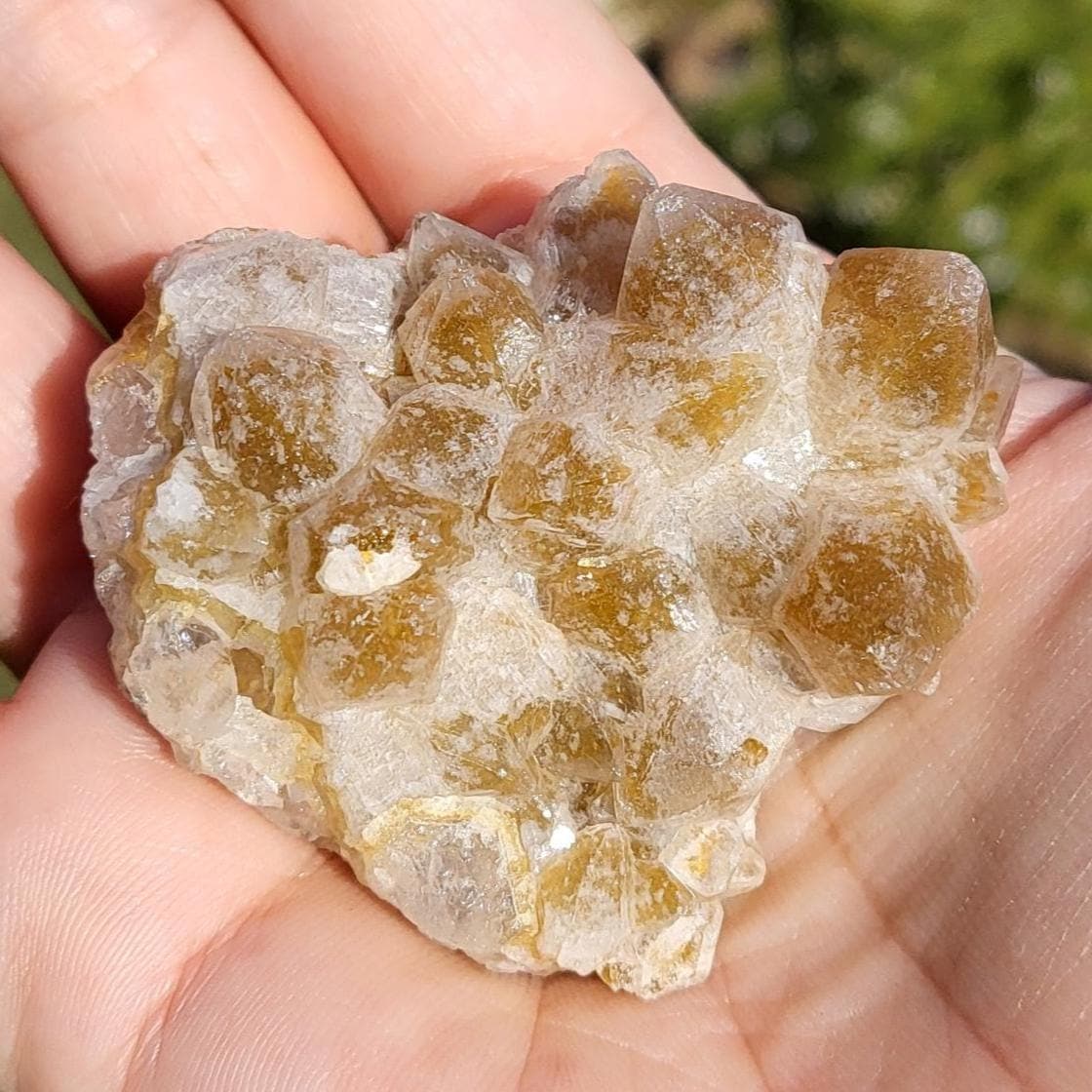 This listing is for the honeycomb matrix gold limonite phantom / golden healer quartz crystal cluster shown in the photos above. Measuring approximately 2" at his longest point, this cluster is such a rich, beautiful honey color!! He has beautiful examples of limonite's honeycomb matrix, and there are several clear phantoms that can be seen within the main points. There are even deep gold crystal points growing inside the caves made from the honeycomb matrix! The shine on these crystals makes them look like they are covered in beeswax in some lights. This crystal is 100% natural and created by Mother Earth. The energy that I get from this crystal is very productive and growth-oriented. He would be excellent as part of a crystal grid, as a crystal companion for meditation or magical workings, or placed anywhere within your home to project his beautiful energy.