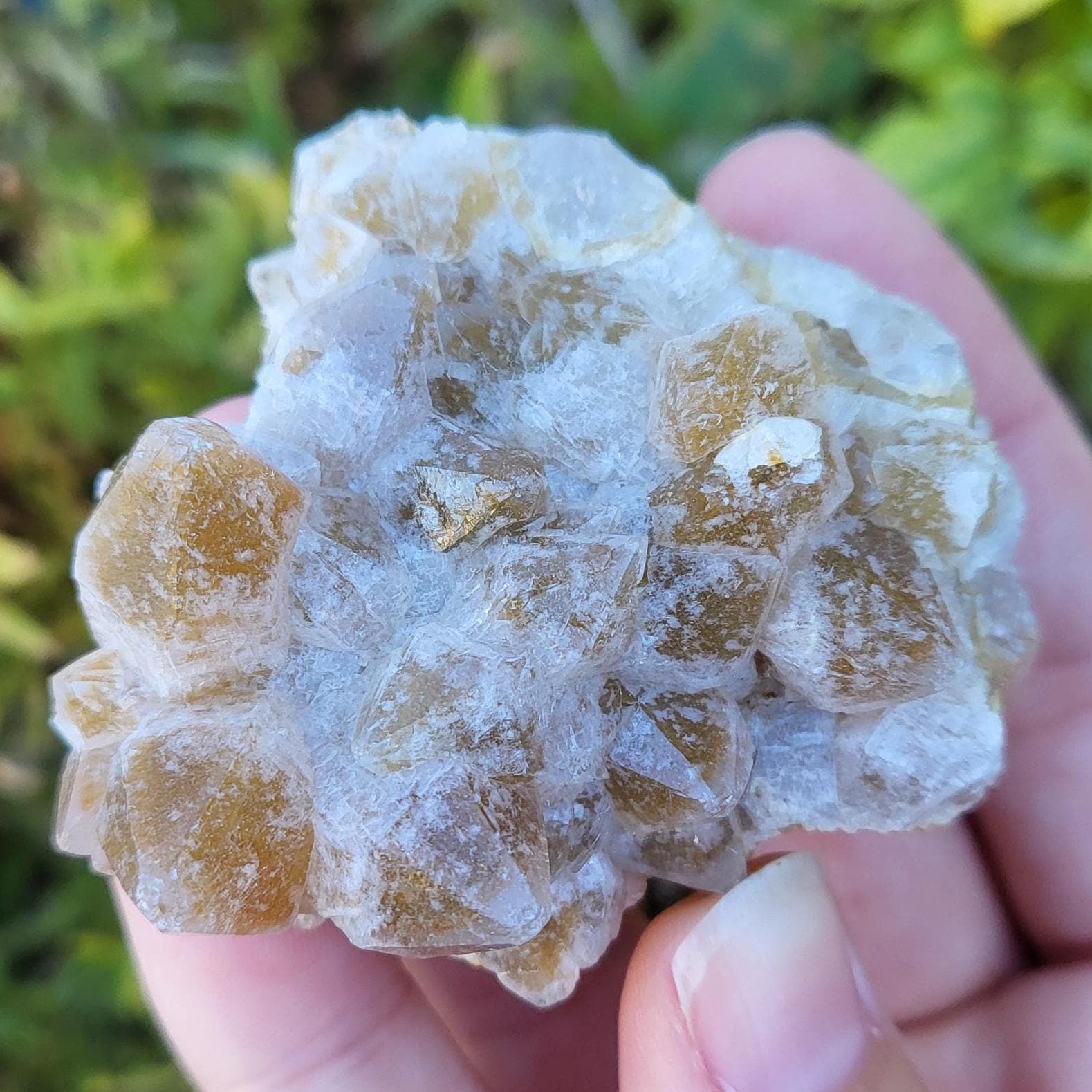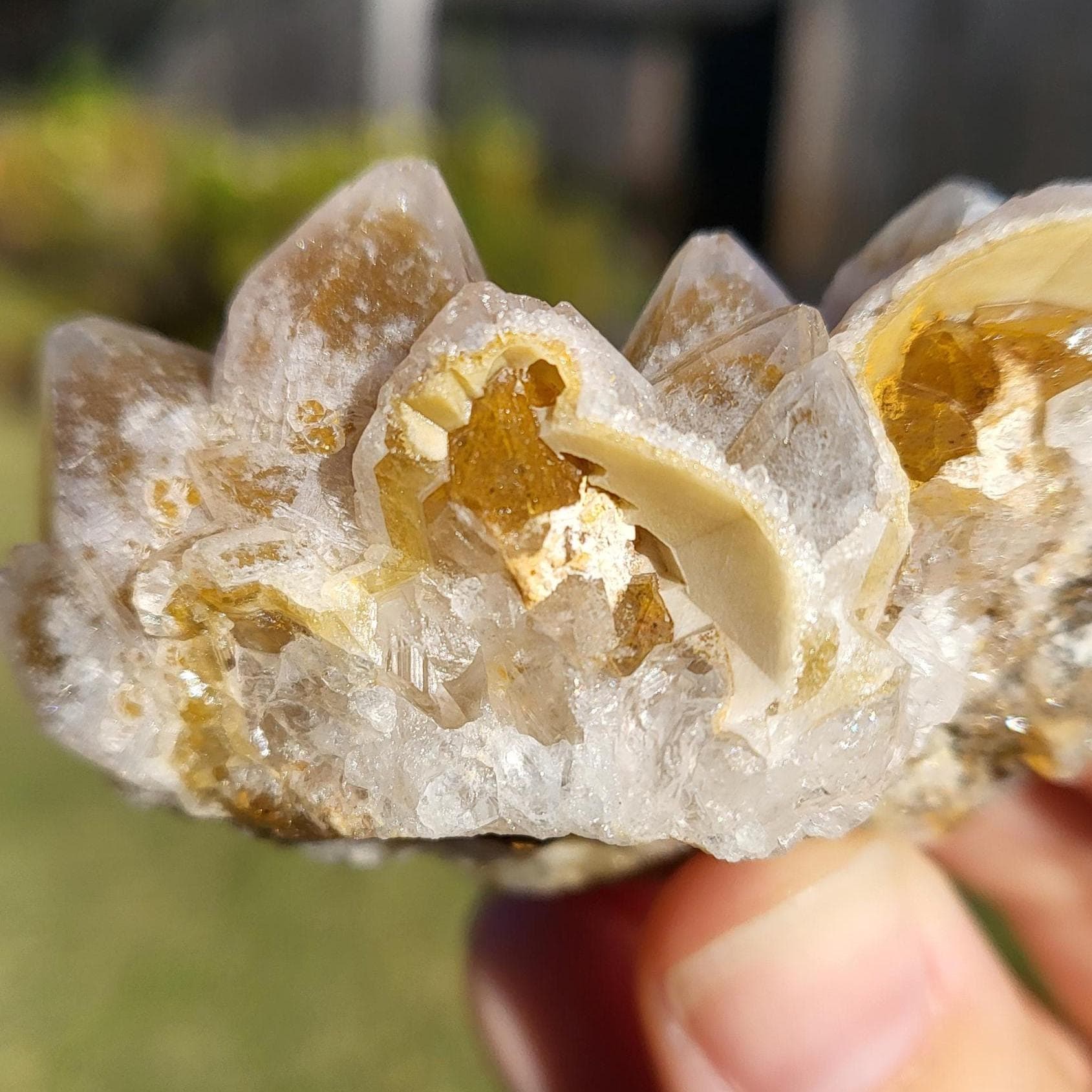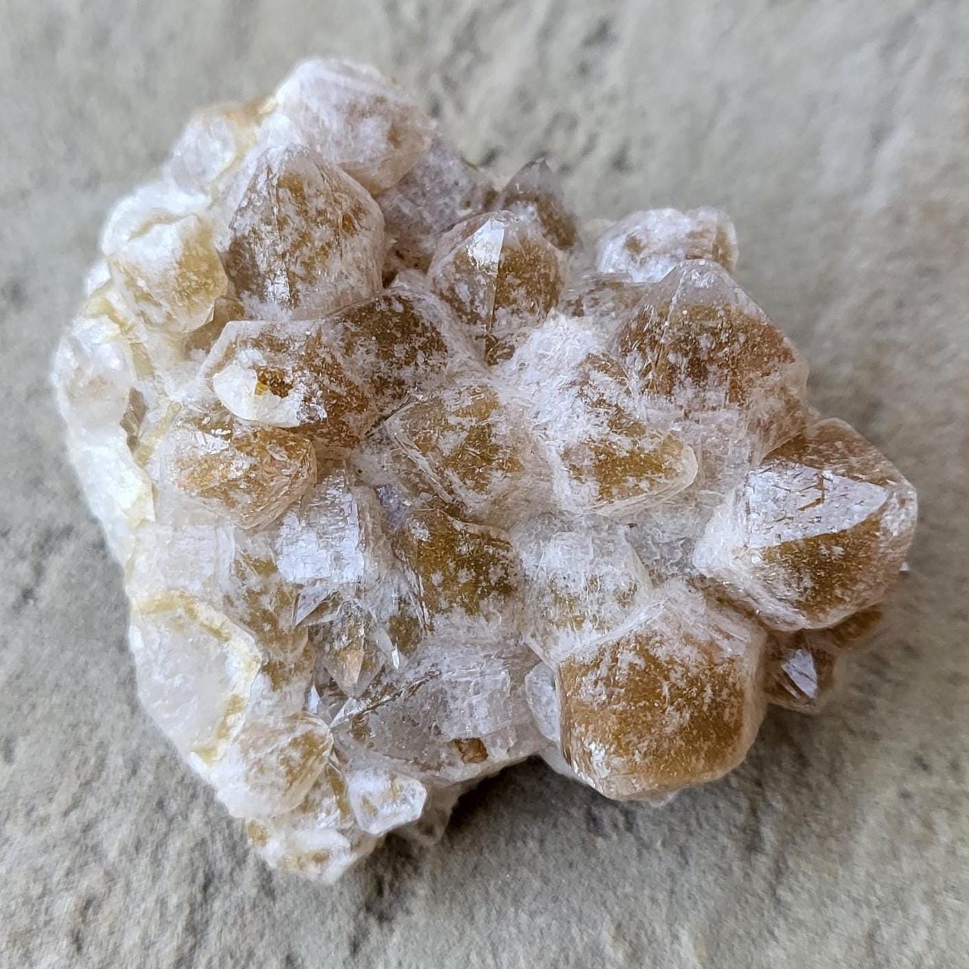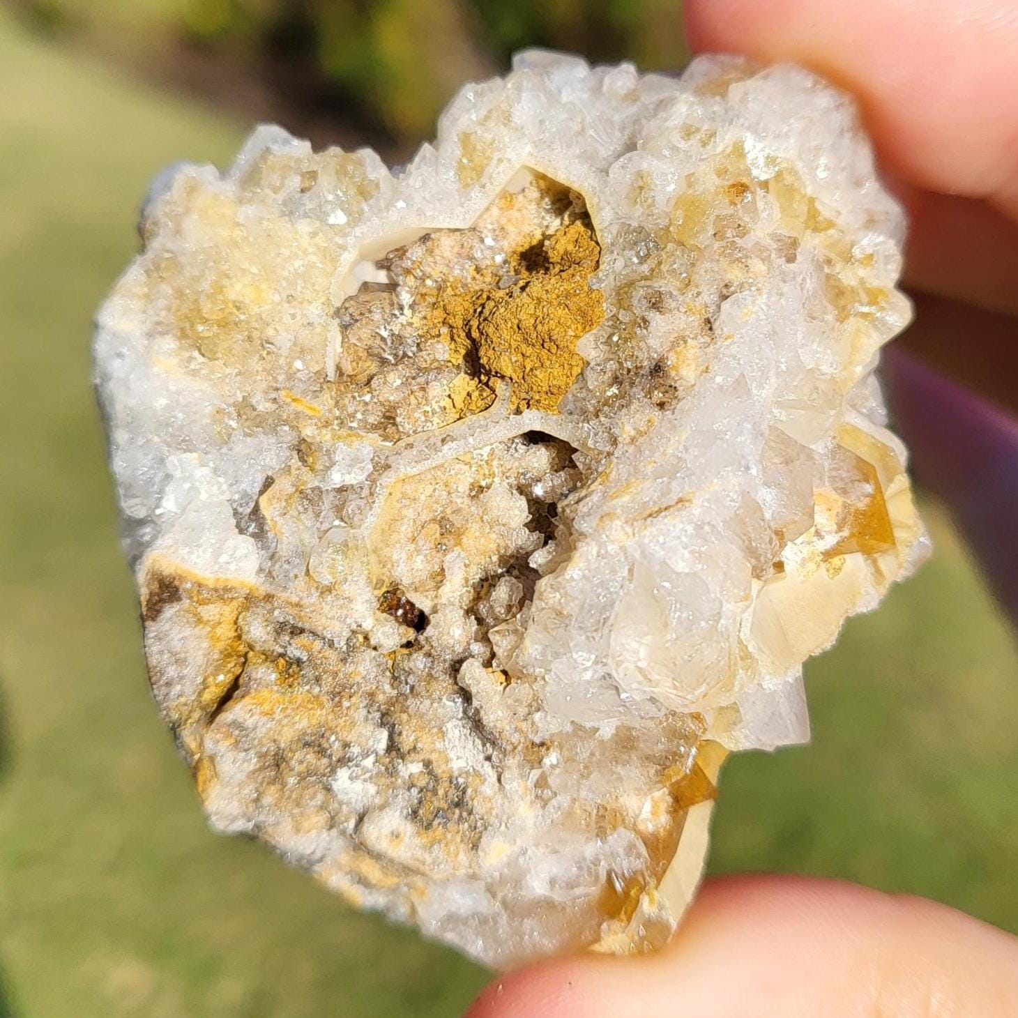 This listing is for the honeycomb matrix gold limonite phantom / golden healer quartz crystal cluster shown in the photos above. Measuring approximately 2" at his longest point, this cluster is such a rich, beautiful honey color!! He has beautiful examples of limonite's honeycomb matrix, and there are several clear phantoms that can be seen within the main points. There are even deep gold crystal points growing inside the caves made from the honeycomb matrix! The shine on these crystals makes them look like they are covered in beeswax in some lights. This crystal is 100% natural and created by Mother Earth. The energy that I get from this crystal is very productive and growth-oriented. He would be excellent as part of a crystal grid, as a crystal companion for meditation or magical workings, or placed anywhere within your home to project his beautiful energy.