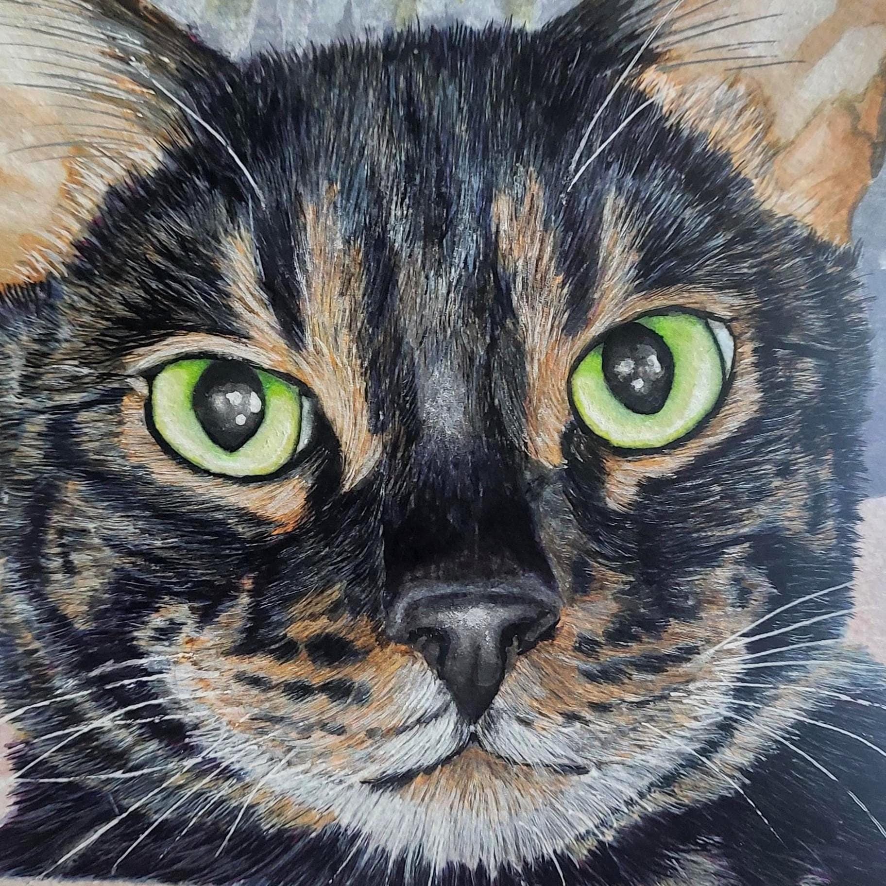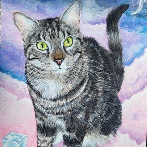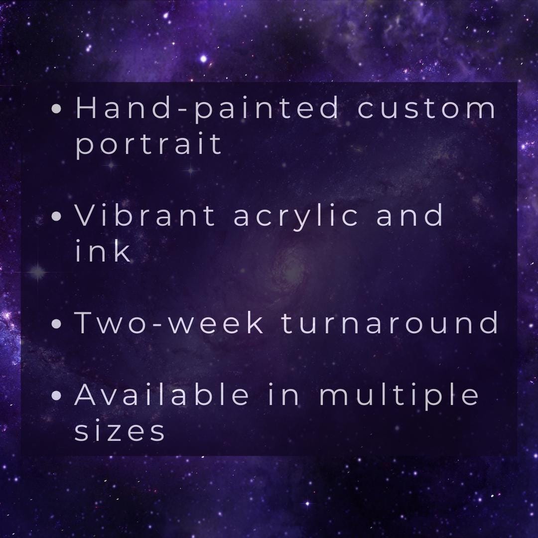 All portraits are created on archival-quality watercolor paper with acrylic paint, alcohol marker, colored pencil, and ink. Portraits can be created in 3x5, 4x6, 5x7, 8x10, 9x12, 12x16, or 18x24 inch size measurements and can include some simple background details such as stars or clouds if requested and they will fit in the chosen size. Turnaround time from photo receipt to completion of your portrait is 2 weeks unless otherwise stated. This listing is for individual pet portraits only, but I can do portraits that include multiple pets within the same painting! If you have any questions about a multiple-pet portrait or if I can include/paint a special request, please feel free to message me at any time. All portraits are created completely by hand from photo references provided by the customer. I do not use any form of digital artwork or AI in the creation of these pieces.